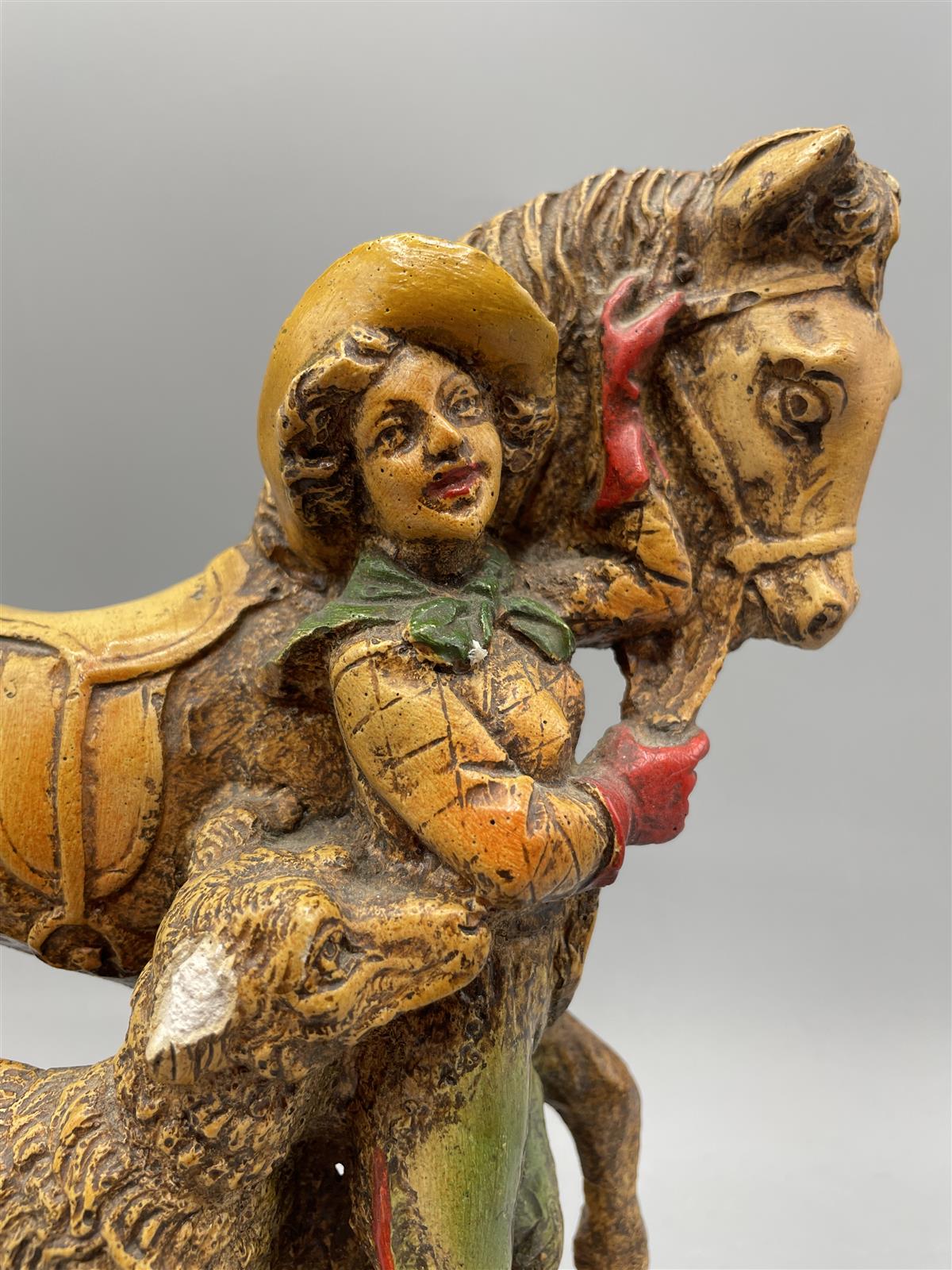 Keraaminen Patsas esittää naista, hevosta ja koiraa.