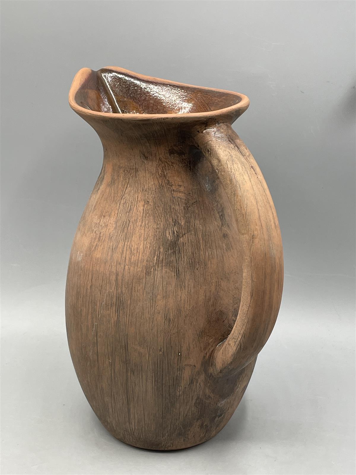 Käsintehty ruskea kannu, jossa on suuri kahva ja kaareva nokka. Sisäpuoli on lasitettu kiiltäväksi. Pohjassa signeeraus(ei tunnistettu).