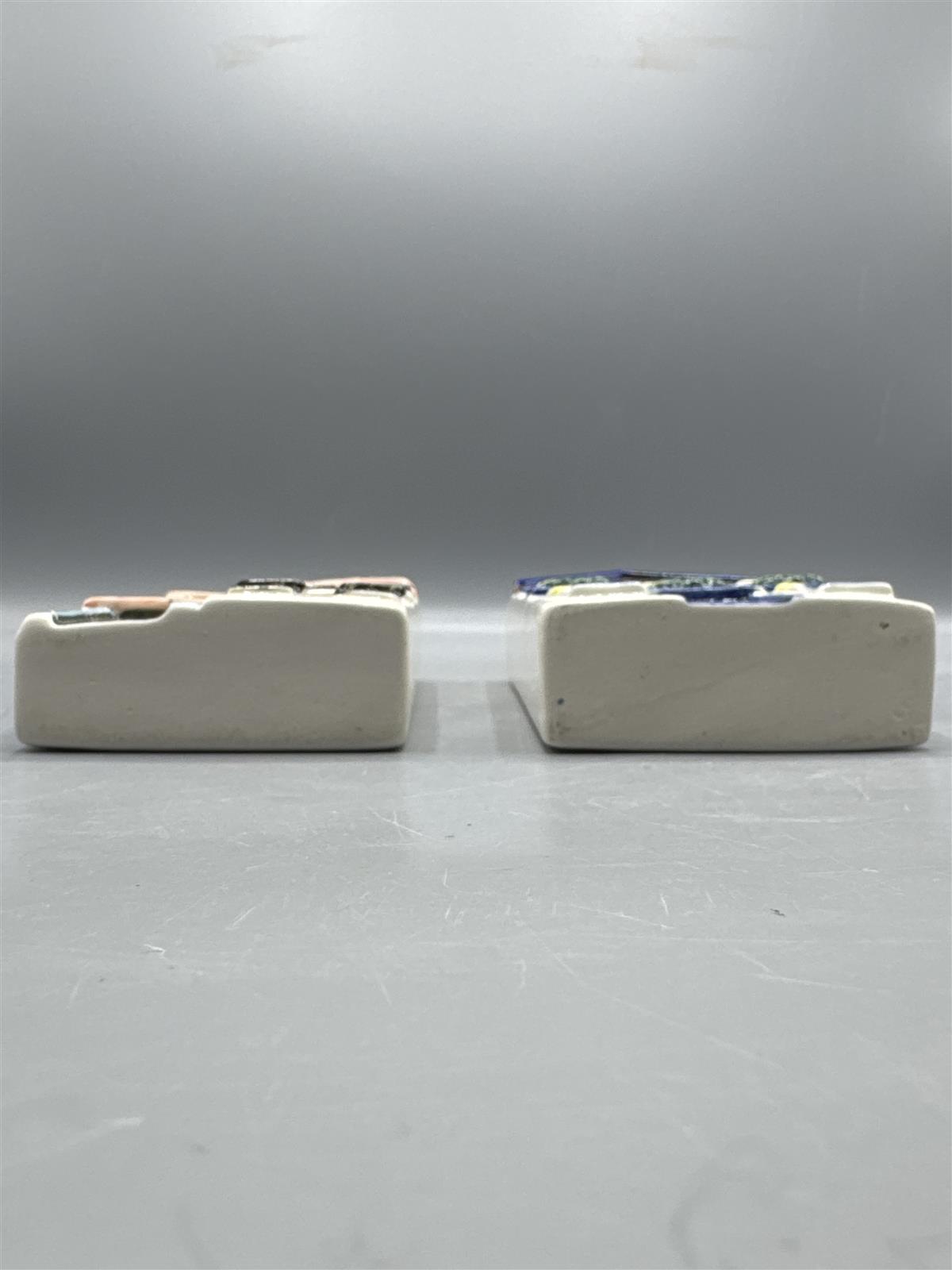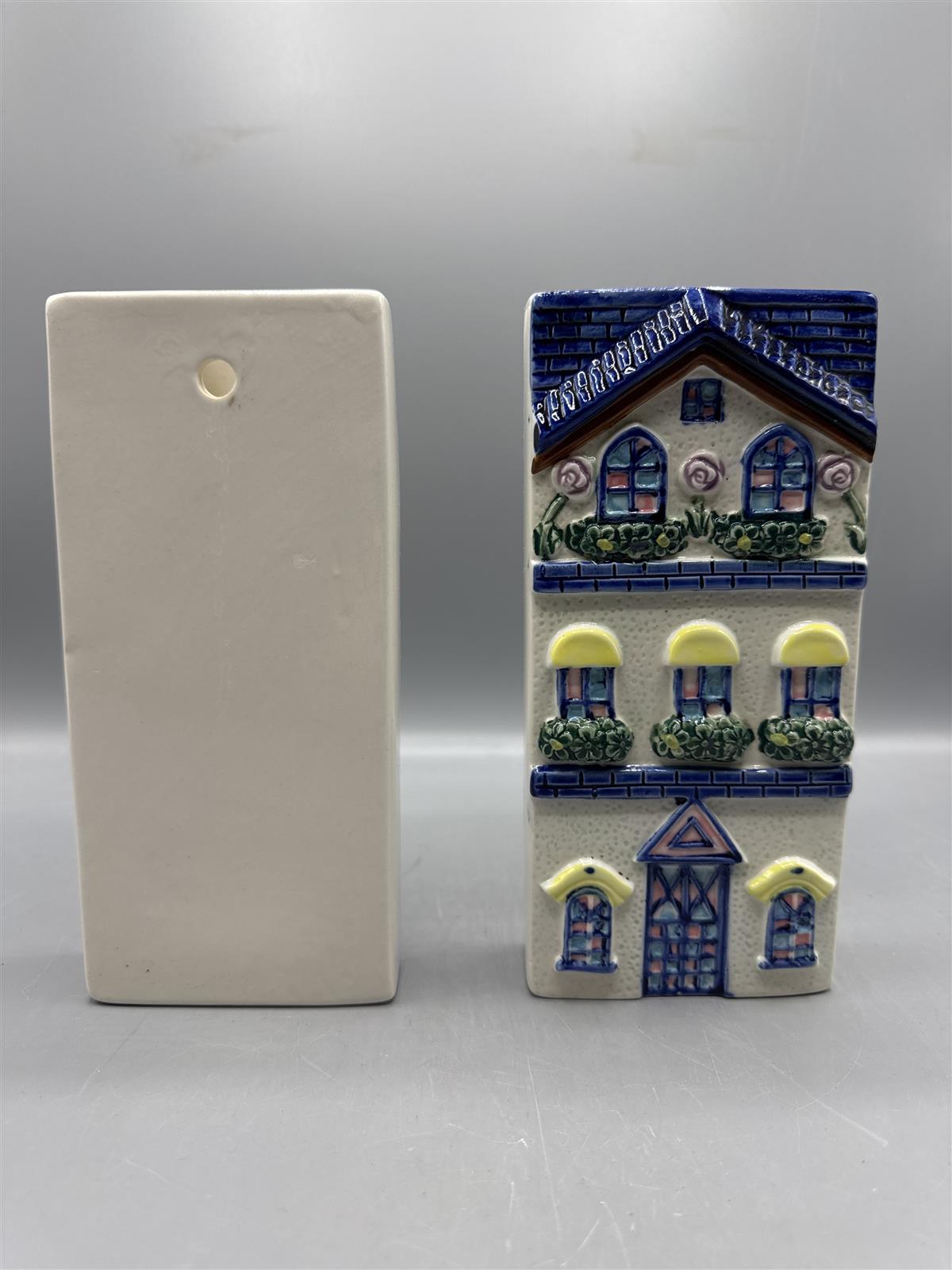 Kaksi keraamista talonmuotoista koriste-esinettä, joissa on yksityiskohtaiset ikkunat ja katot. Molemmissa on ripustusreikä takana, mikä mahdollistaa seinälle kiinnittämisen. Värit ovat monivärisiä, sisältäen sinistä, keltaista ja vaaleanpunaista.