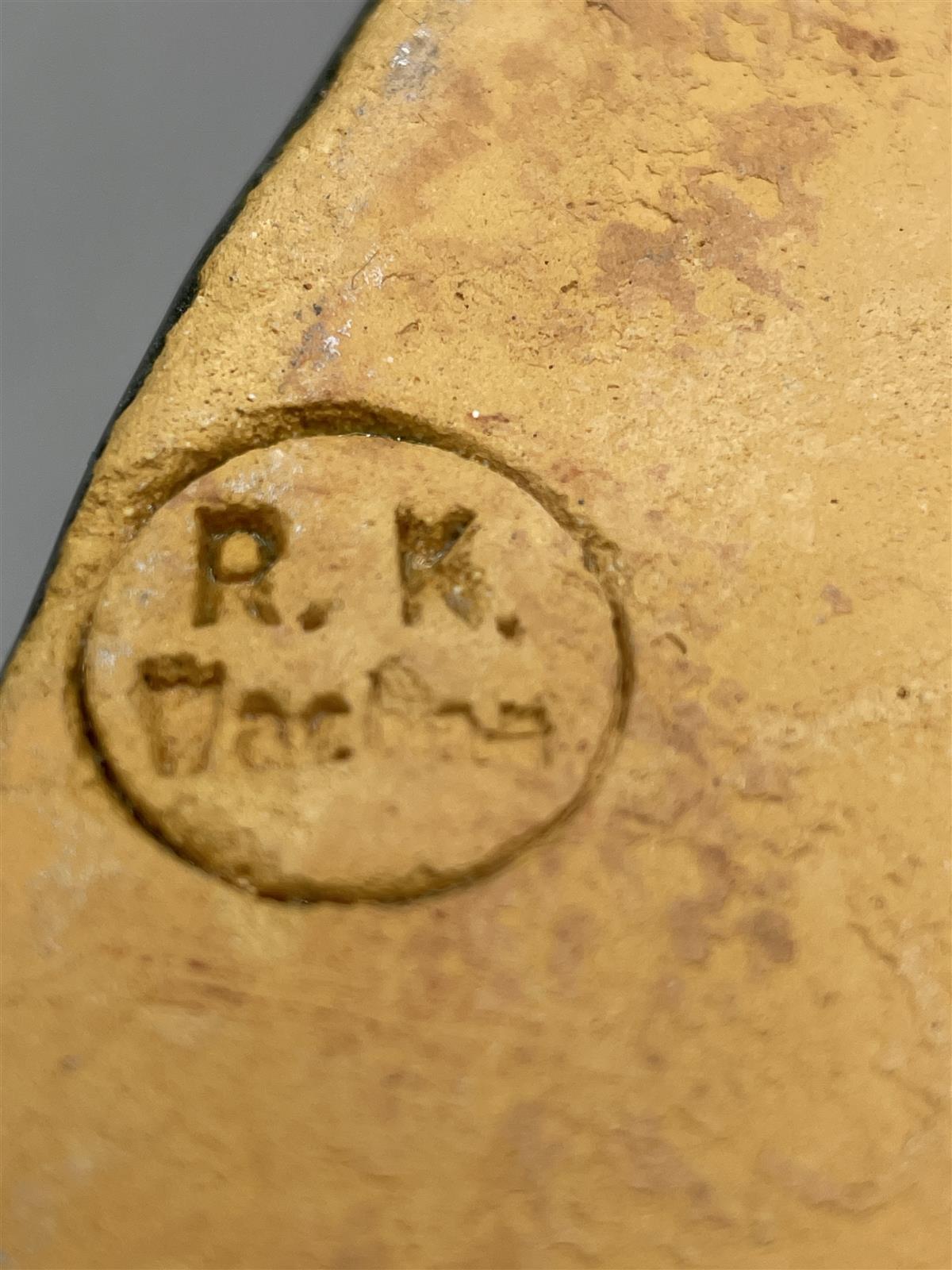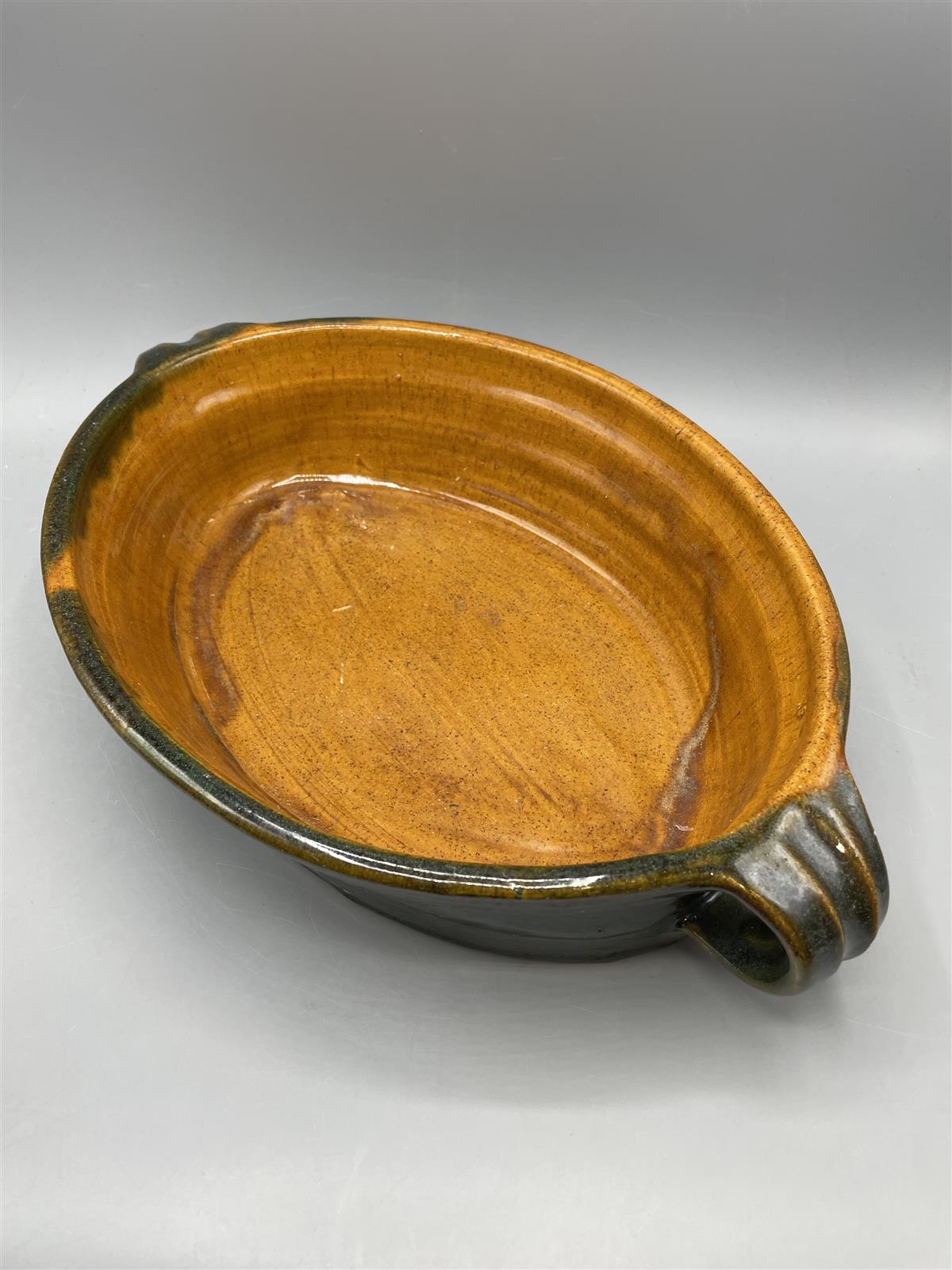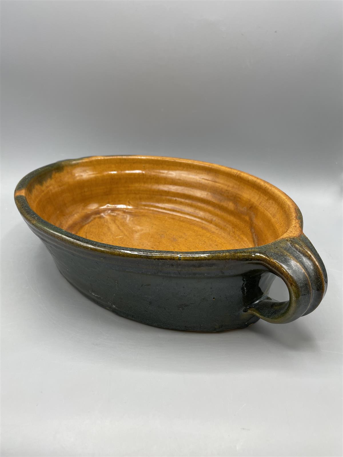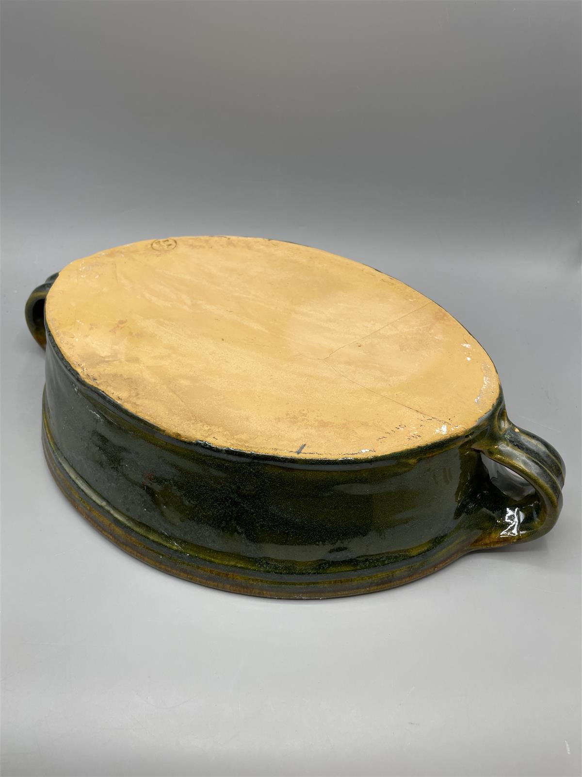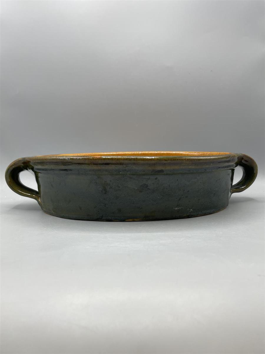 Keraaminen vuoka, jossa on tummanvihreä ulkopinta ja ruskea sisäpinta. Kaksi kädensijaa helpottavat käsittelyä. Pohjassa leima.