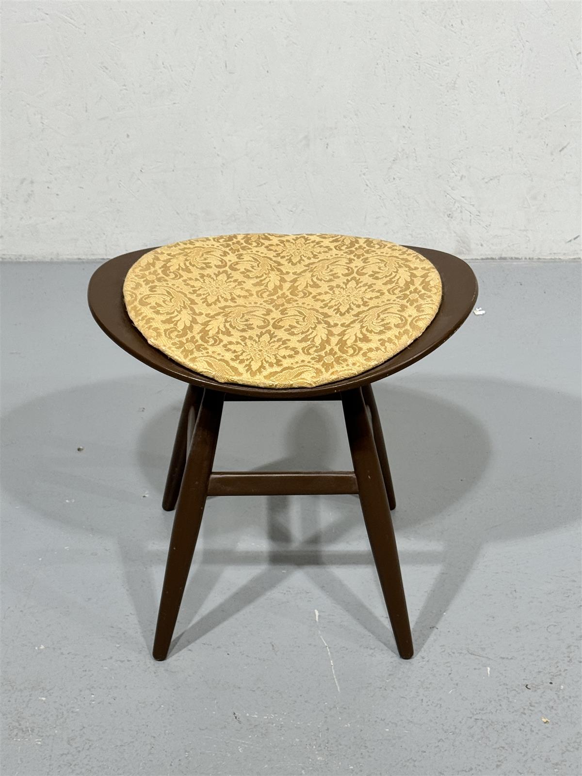 Stockmannille valmistettu Olof Ottelin design jakkara ”Ellipsi”. Keravan Puusepäntehtaan käsialaa 50 luvulta, ruskeaksi maalattu puurunko, jossa keltainen istuinpehmuste. Alkuperäinen leima haalistunut alta. Kunto ikäisekseen hyvä.