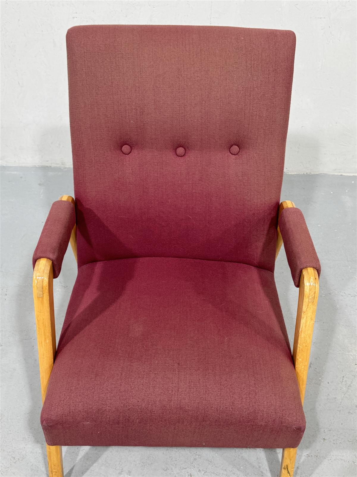 Tyylikäs Figaro nojatuoli, jossa on viininpunainen verhoilu ja puurunko. Tuolin muotoilu on yksinkertainen ja ajaton, mikä tekee siitä sopivan monenlaisiin sisustuksiin. Valmistaja Keravan Puusepäntehdas Stockmann Oy Ab:lle, design Olle Filen.
