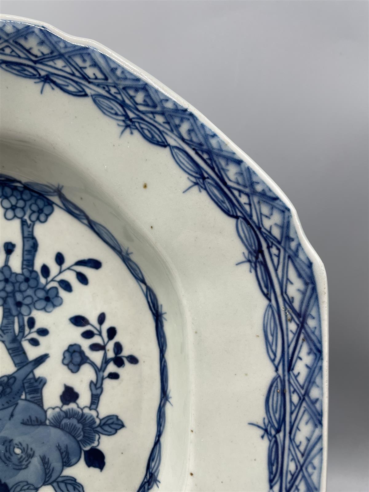 Kiina Qianlong Sinivalkoinen posliinivati, jossa on yksityiskohtainen kukka- ja lintukuviointi. Vadin reunaa koristaa geometrinen kuviointi.