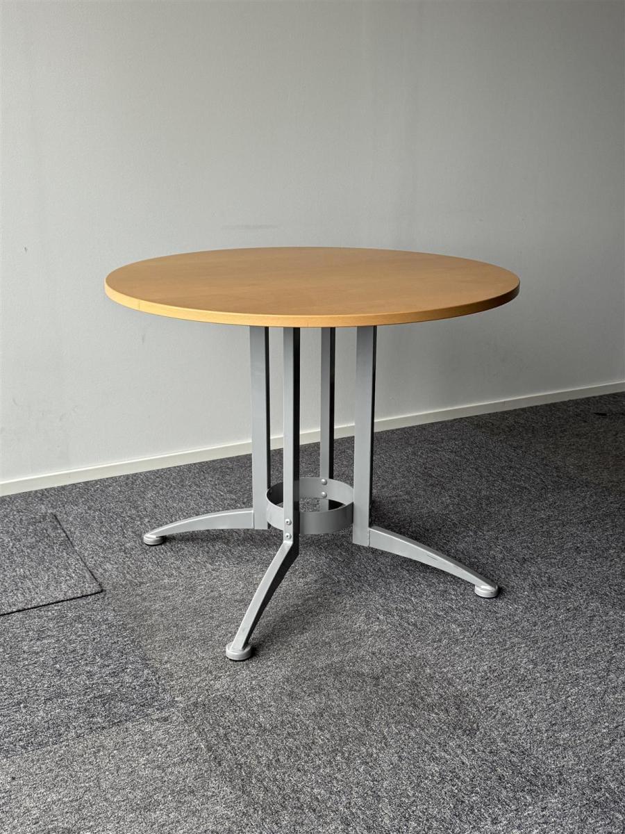 Kinnarps Asto malliston pyöreä pöytä, jossa on metallijalat. Pöytälevy on puunvärinen ja sileä.