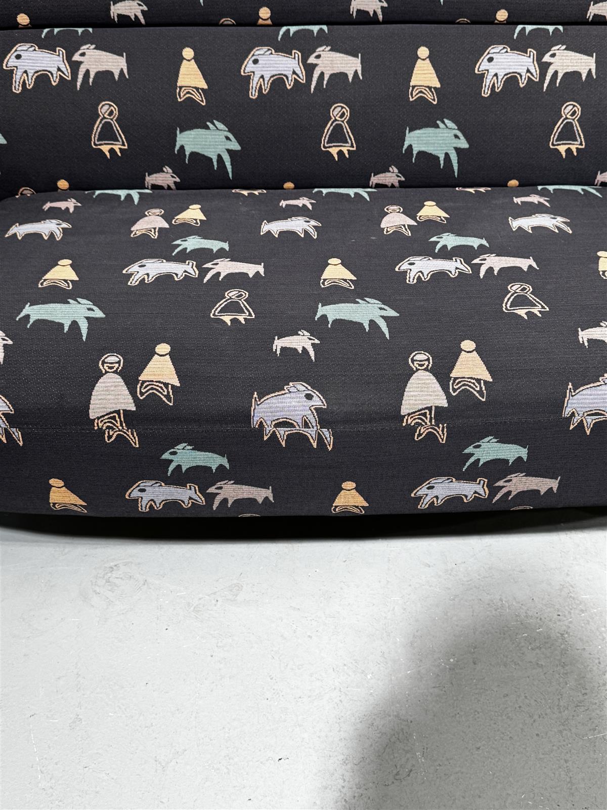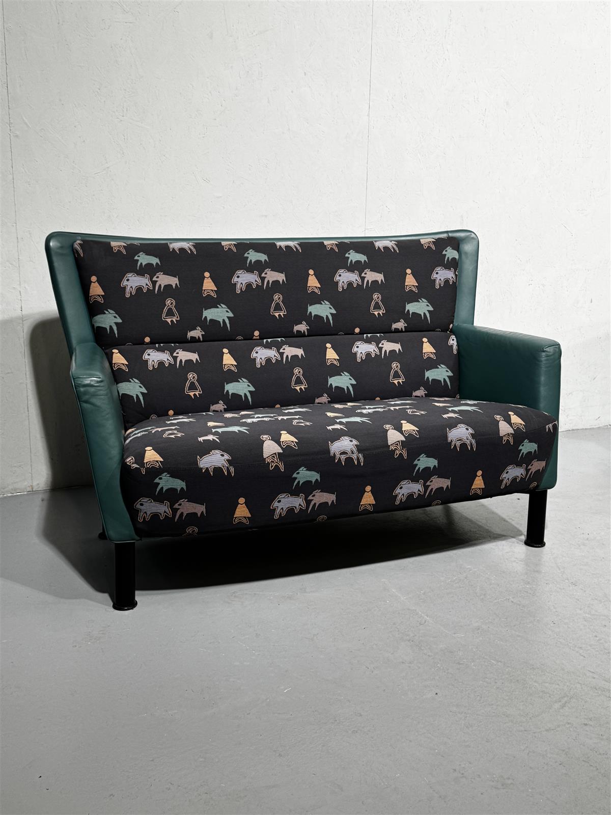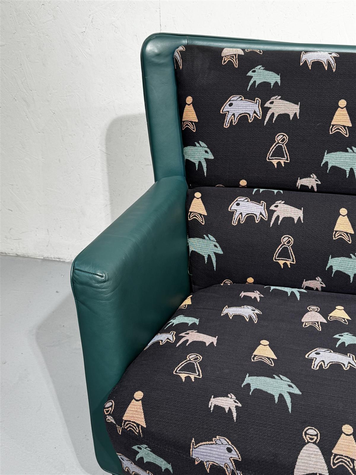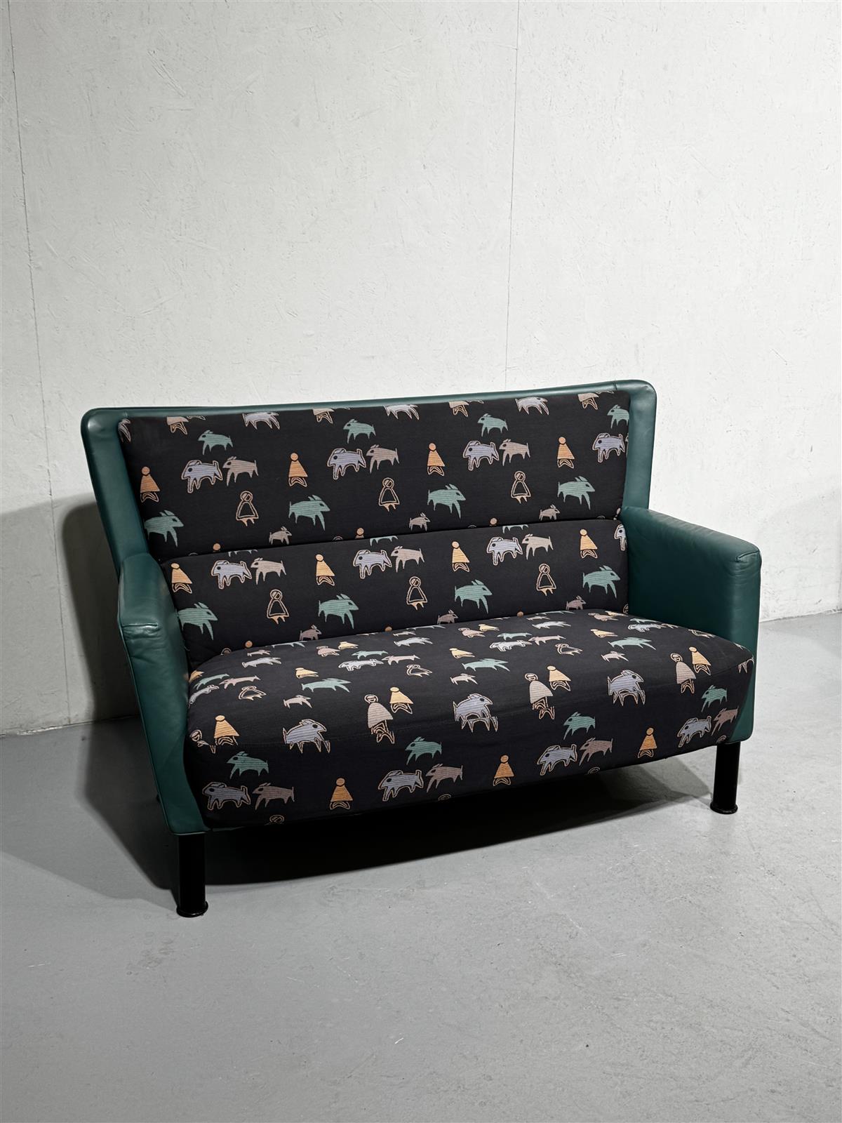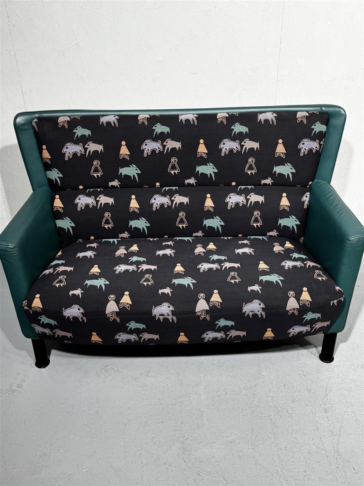 Kinnarps kahden istuttava nahkasohva, jossa on värikäs kuviointi ja tummat metallijalat. Käsinojat ovat yksiväriset ja pehmustetut. Valmistaja on Kinnarps.