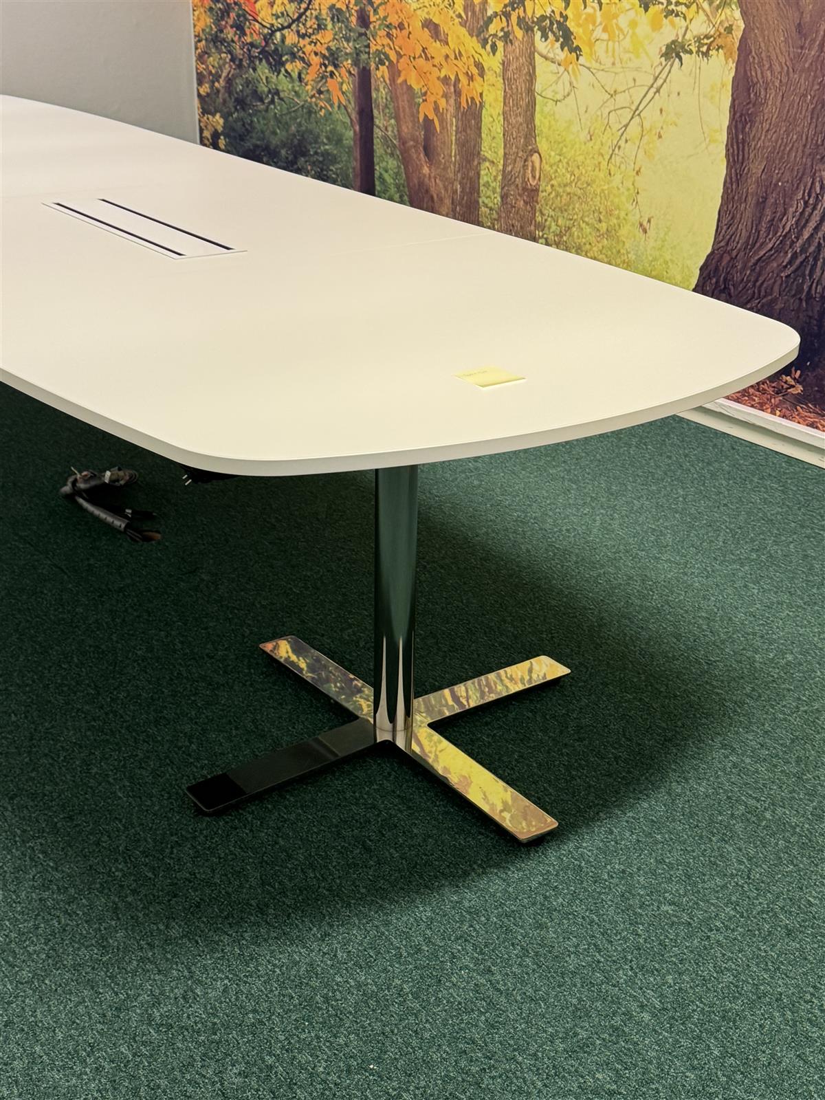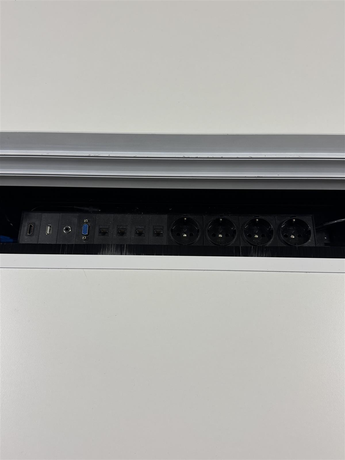 Suuri valkoinen Kinnarps Oberon isokokoinen neuvottelupöytä, jossa on integroitu kaapelihallinta keskellä ja pistorasiat. Pöydän jalat ovat metalliset ja tukevat.