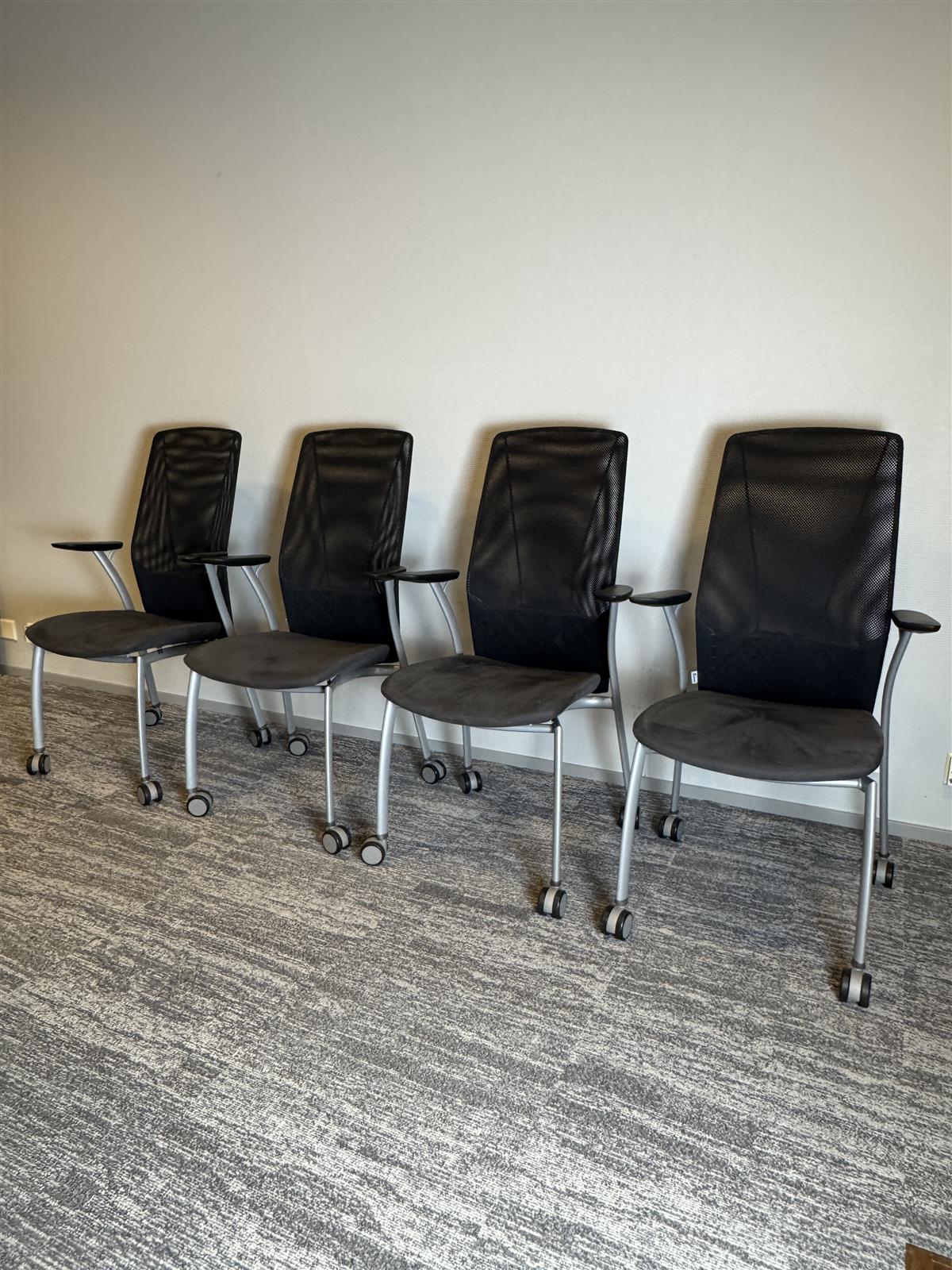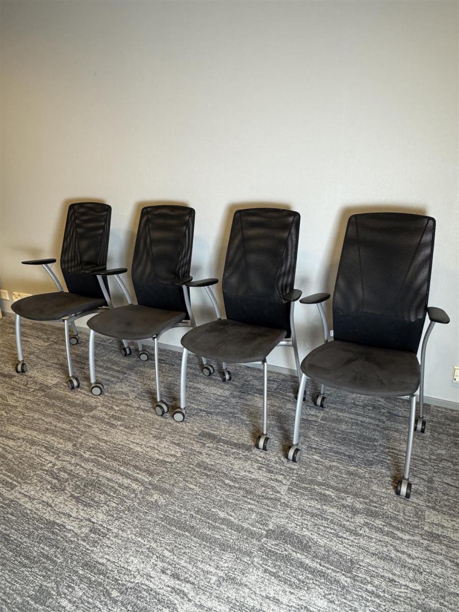 Kinnarps Plus 375M tuolit, joissa on verkkoselkänoja ja pyörät. Tuolit ovat mustia ja niissä on harmaat jalat.