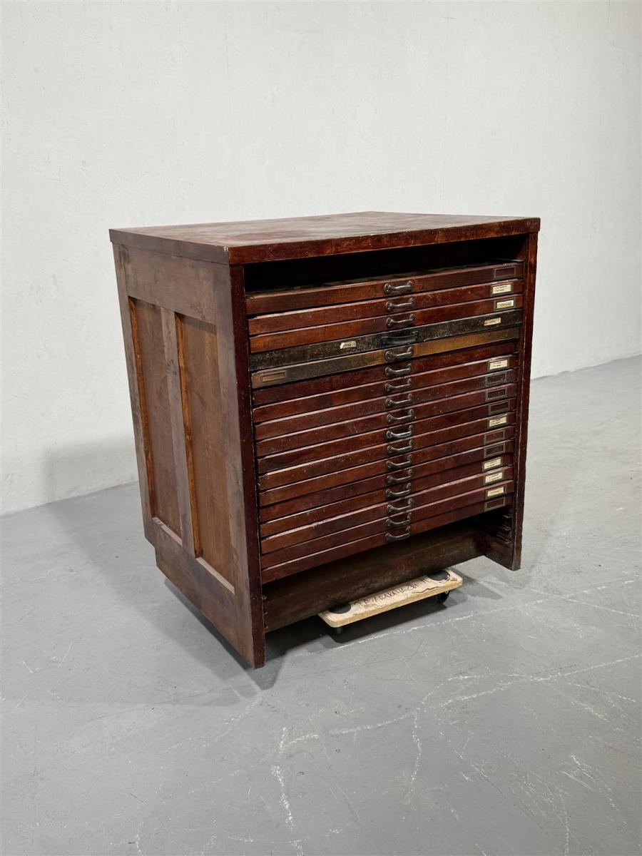 Vanha kirjapainon tummapintainen kasti, jossa on isoja, leveitä vetolaatikoita, joissa pieniä (kirjaisimien) lokeroita. Kulumat ja jäljet kertovat noin satavuotiaan kastin iästä ja käytöstä. Tämä kasti on todennäköisesti ollut käytössä kirjapainossa tai vastaavassa ympäristössä, jossa tarvittiin paljon pientavaran säilytystilaa. Vetolaatikot painuvat rungon sisälle hieman (ominaisuus, ei vika).