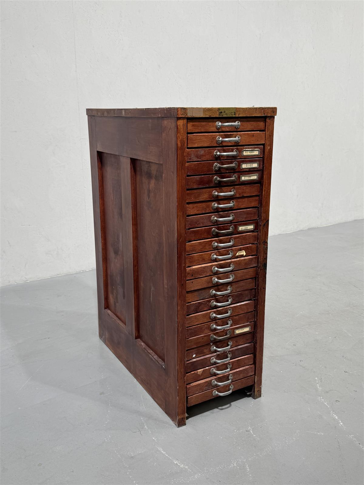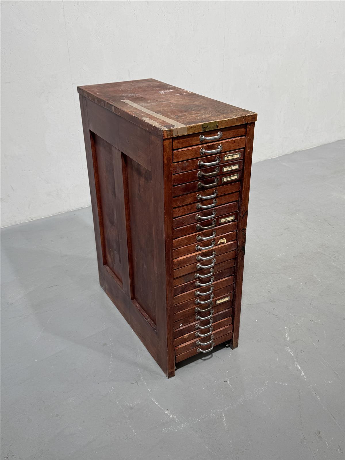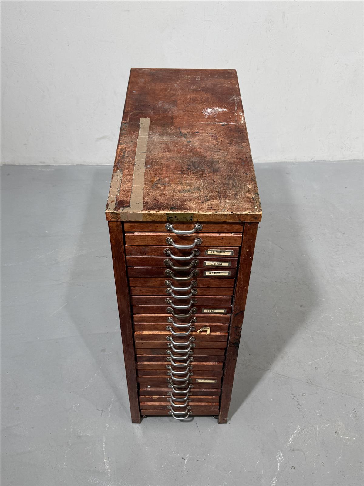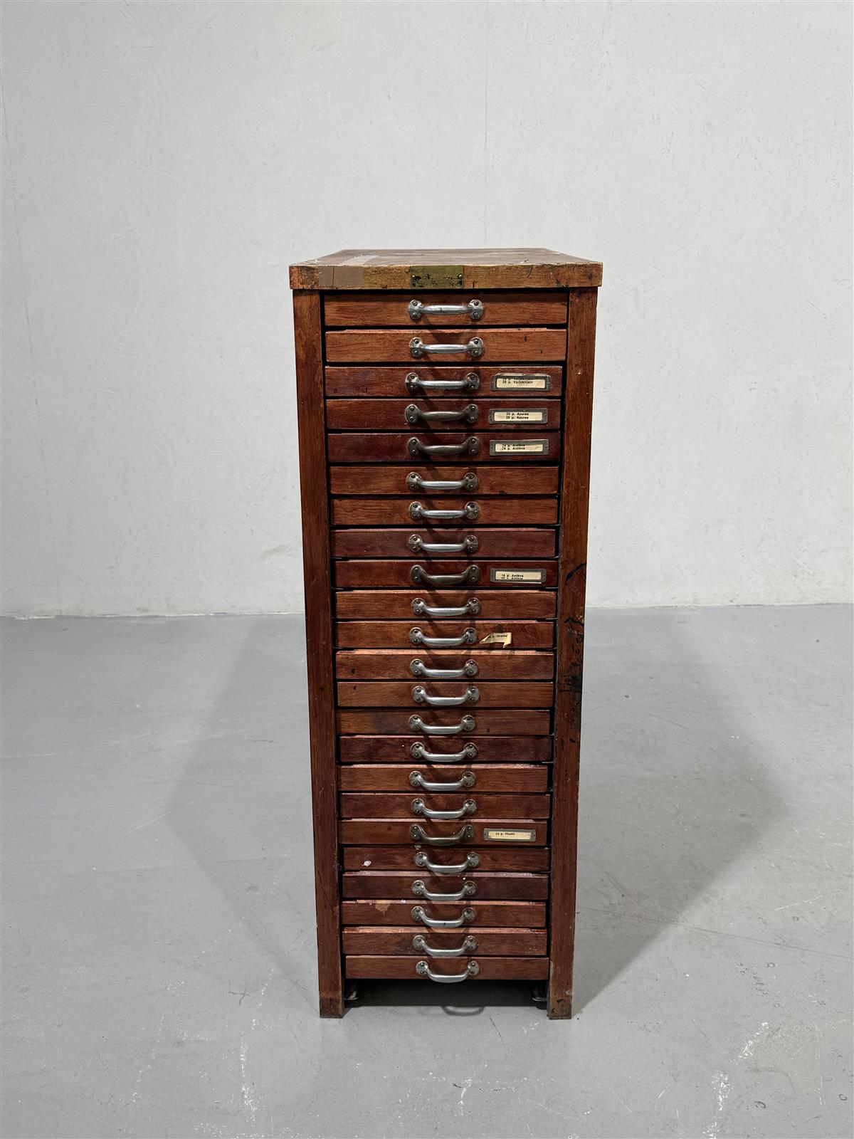 Vanha kirjapainon kasti, jossa on useita vetolaatikoita. Jokaisessa laatikossa on merkintöjä, jotka kertovat noin satavuotiaan kastin iästä ja käytöstä. Tämä kasti on todennäköisesti ollut käytössä kirjapainossa tai vastaavassa ympäristössä, jossa tarvittiin paljon pientavaran säilytystilaa. Vetolaatikot painuvat rungon sisälle hieman (ominaisuus, ei vika). Osa vetimistä viallisia.