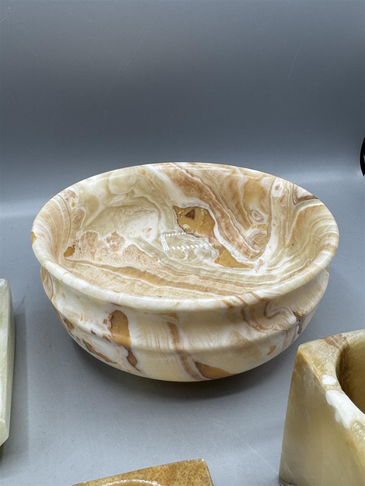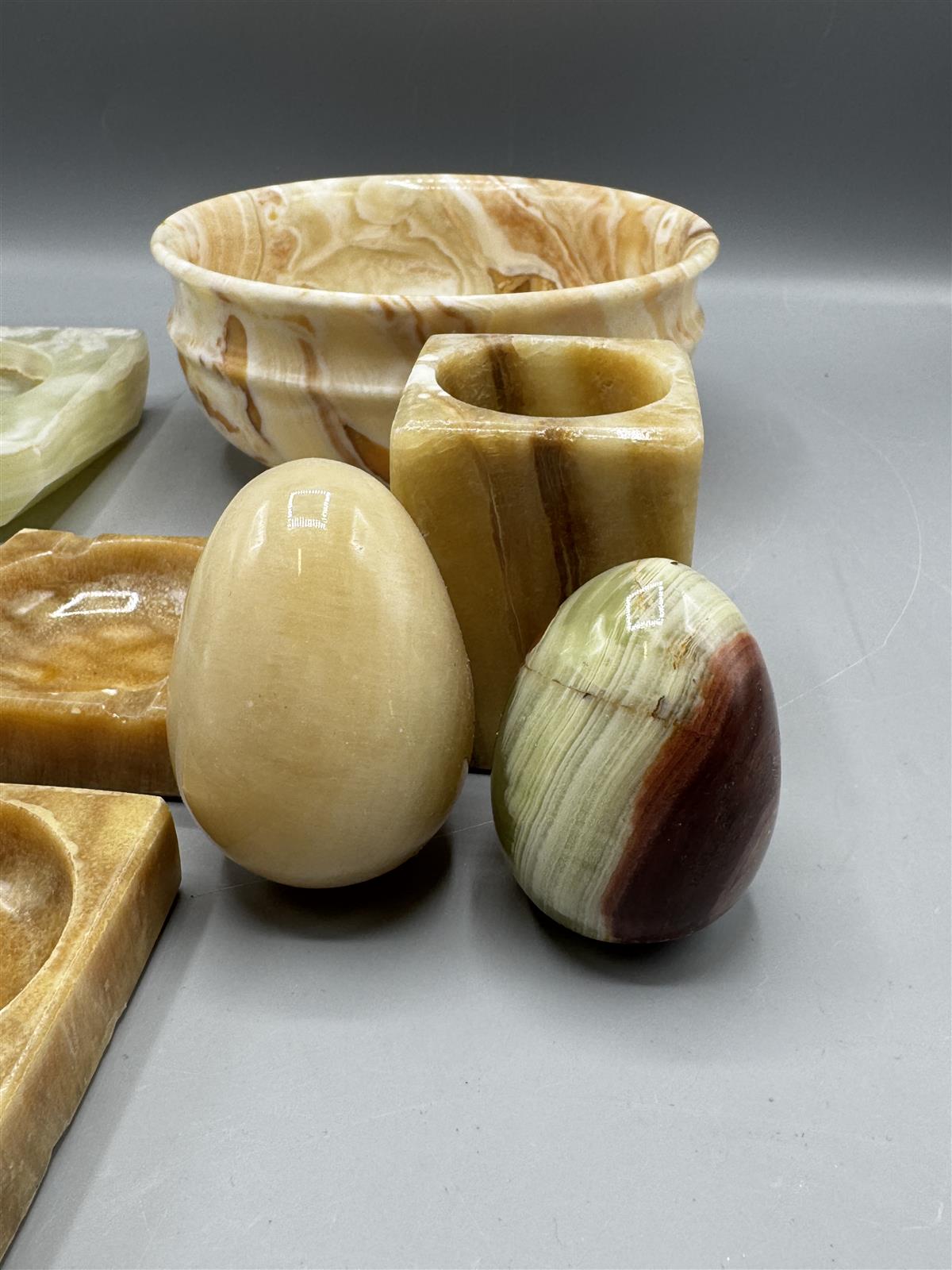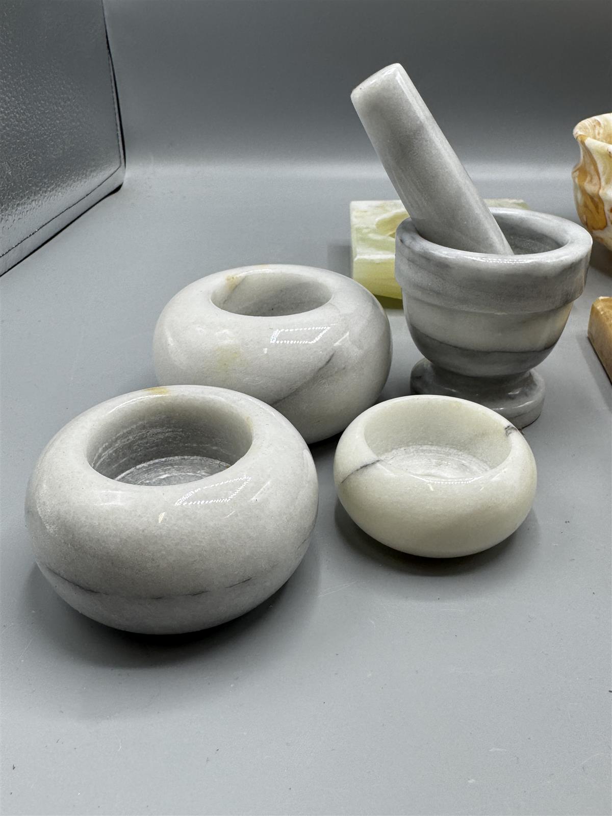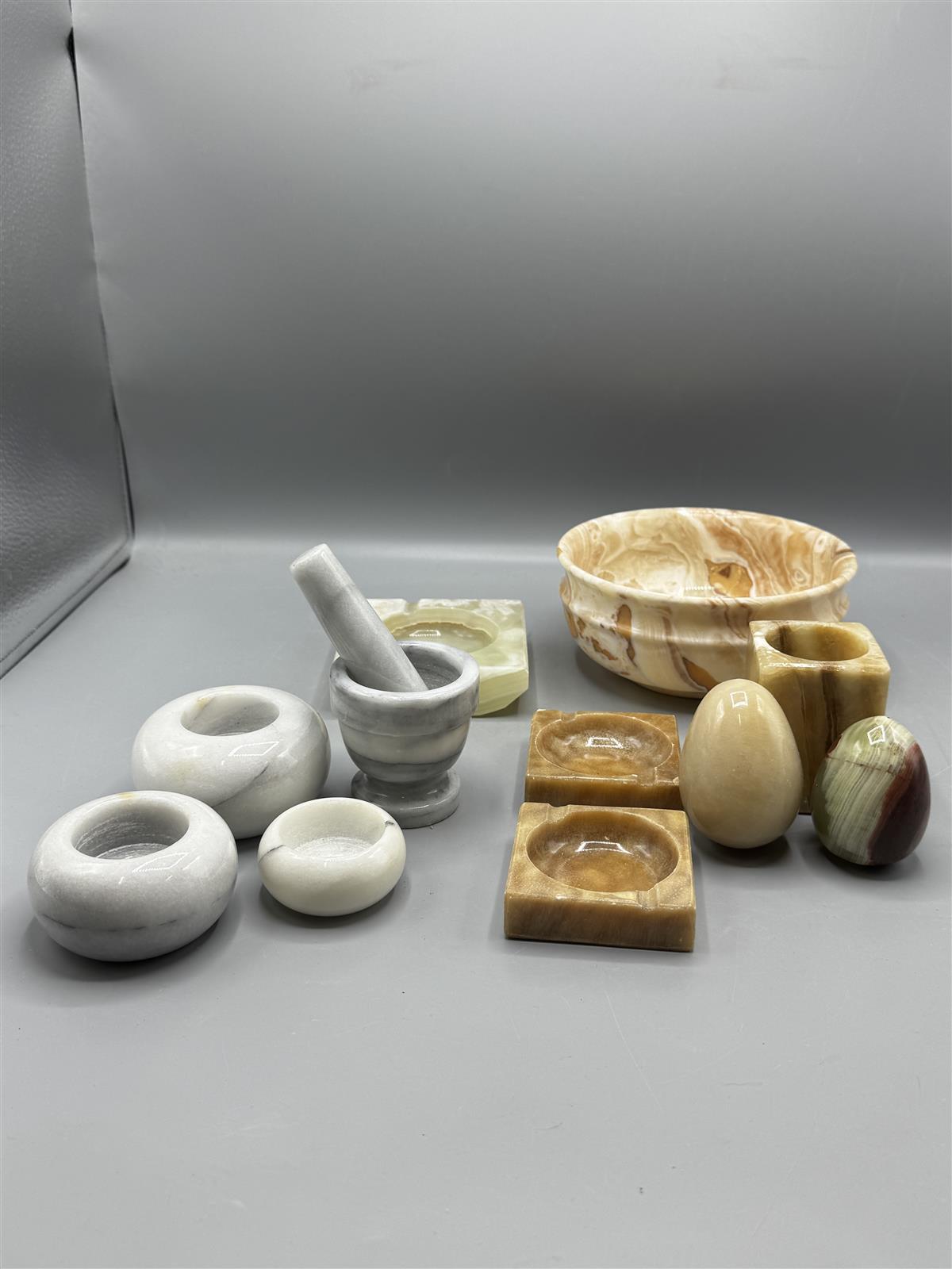 Kokoelma sisältää erilaisia kiviesineitä, kuten kulho, tuhka-astioita, munia, mauste mortteli ja tuikkuja. Esineet ovat eri sävyisiä ja niissä on luonnollisia kuvioita.