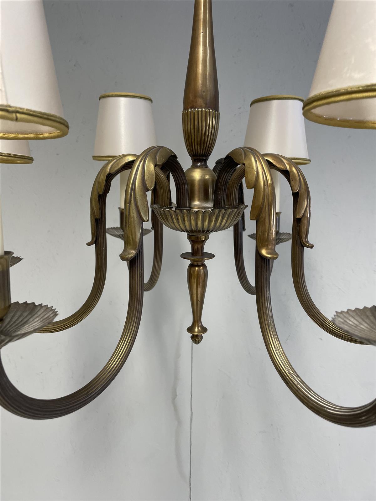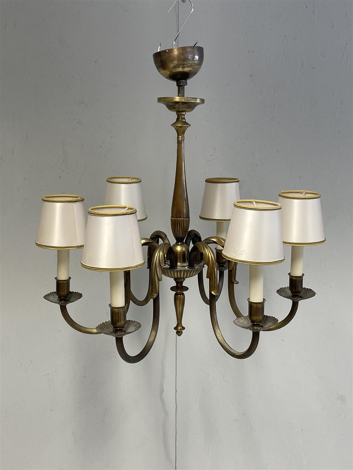 Kattokruunu, jossa on kuusi valopistettä varjostimilla ja koristeelliset yksityiskohdat. Valopisteet varresta sivusuunnassa kääntyvät. Valaisin on valmistettu metallista ja siinä on antiikkinen viimeistely.