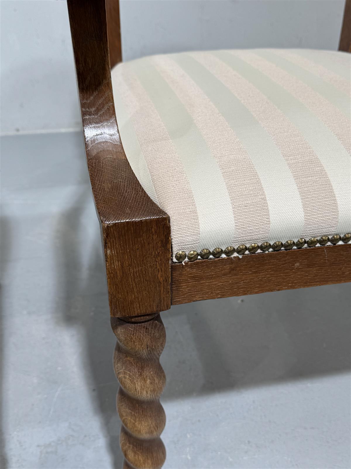 Kaksi klassista, entisöityä nojatuolia, joissa on puurunko ja kierretyt jalat. Tuolit on verhoiltu vaalealla, raidallisella kankaalla, joka tuo esiin perinteisen ilmeen. Käsinojat ovat kaarevat ja tukevat, mikä lisää mukavuutta. Oletettavasti runko tammea.