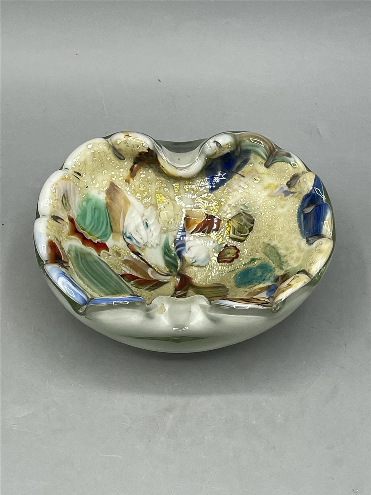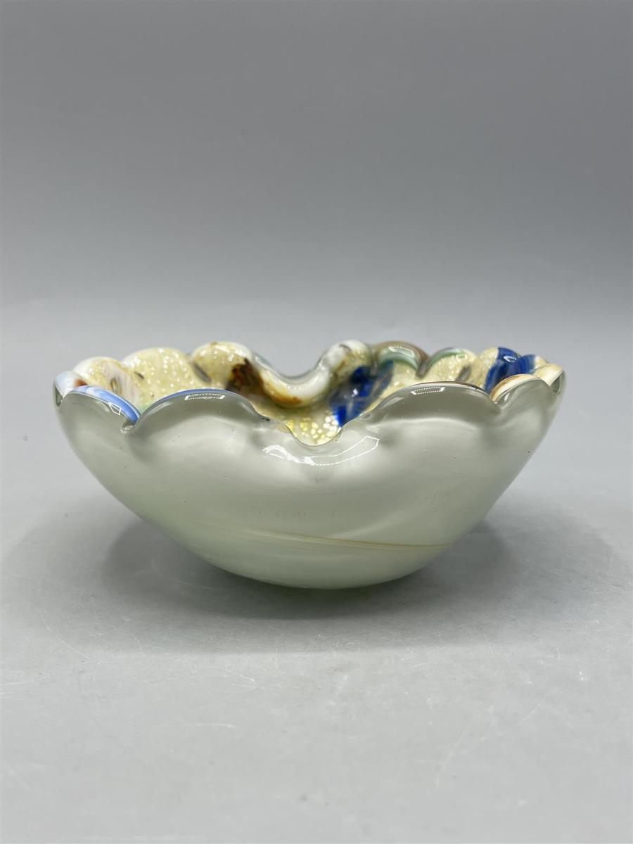 Monivärinen koristeellinen tuhka-astia, jossa on aaltoileva reuna. Astian sisäpuolella on monivärinen kuviointi, joka sisältää sinisiä, vihreitä ja punaisia sävyjä.