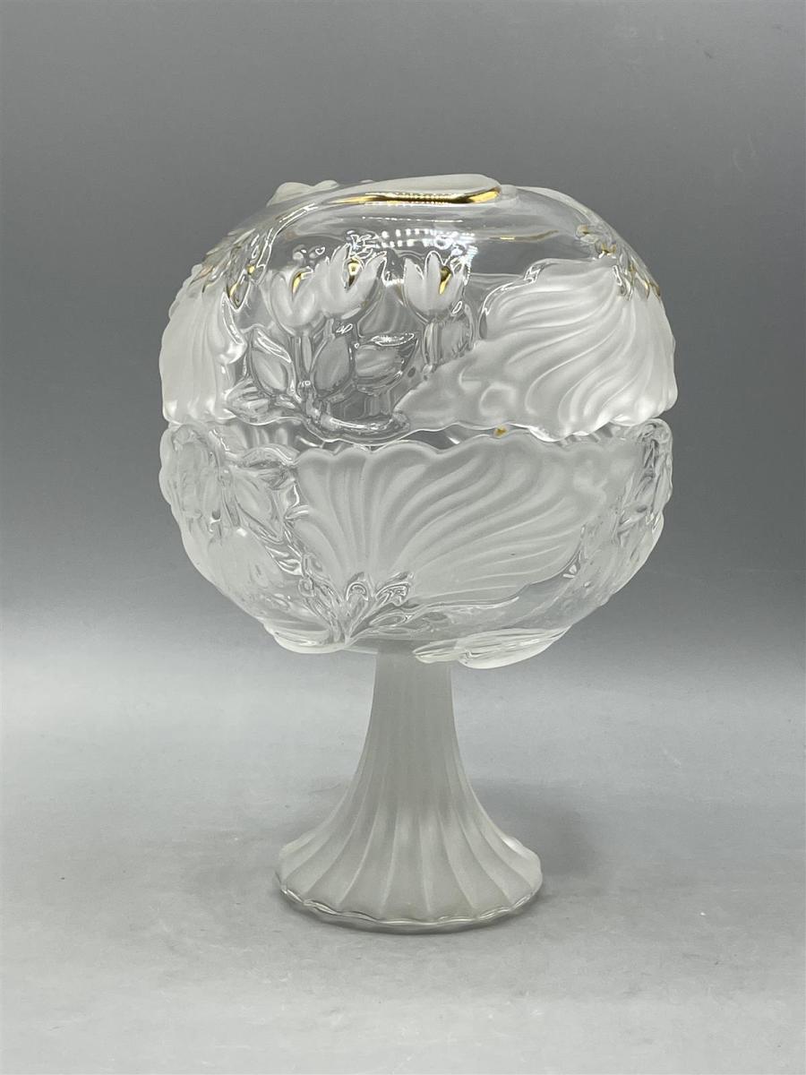 Koristeellinen lasimalja, jossa on kohokuvioituja yksityiskohtia ja kultaisia korostuksia. Malja koostuu jalallisesta kulhosta ja irrotettavasta kannesta, joka toimii myös kulhona.