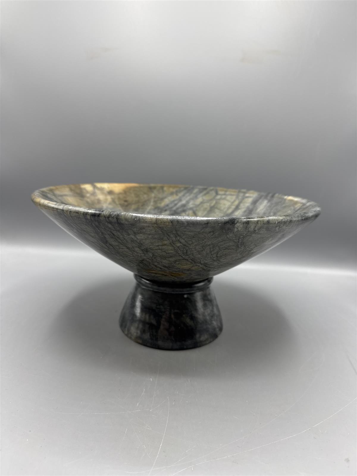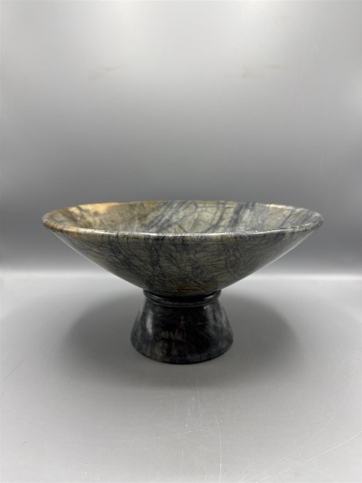Koristeellinen kivikulho, jossa on marmorimainen kuviointi. Kulho seisoo tukevasti jalustalla ja sen muotoilu on elegantti. Valmistajaa ei ole merkitty näkyviin.