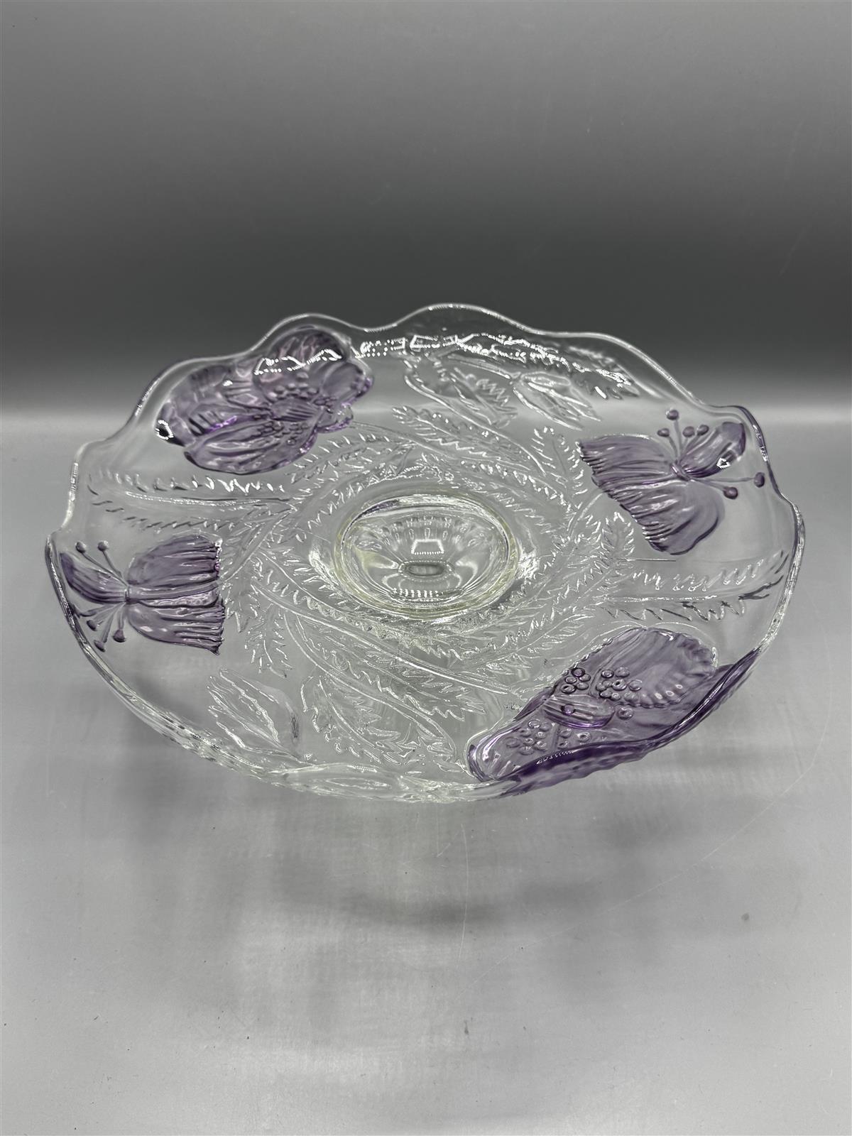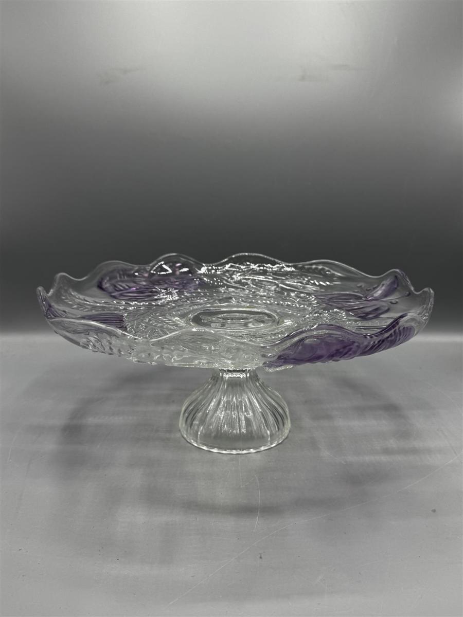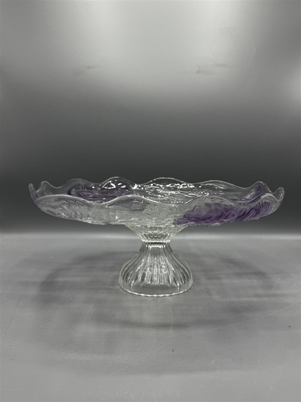 Koristeellinen lasivati, jossa on aaltoileva reuna ja violetteja yksityiskohtia. Vati seisoo jalustalla, joka antaa sille elegantin ilmeen.