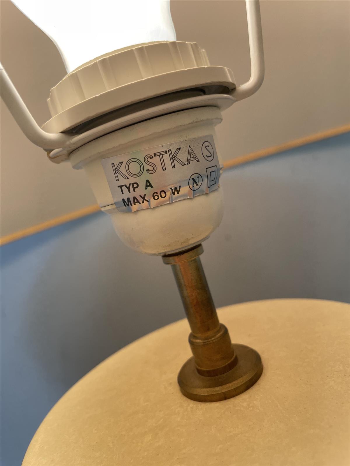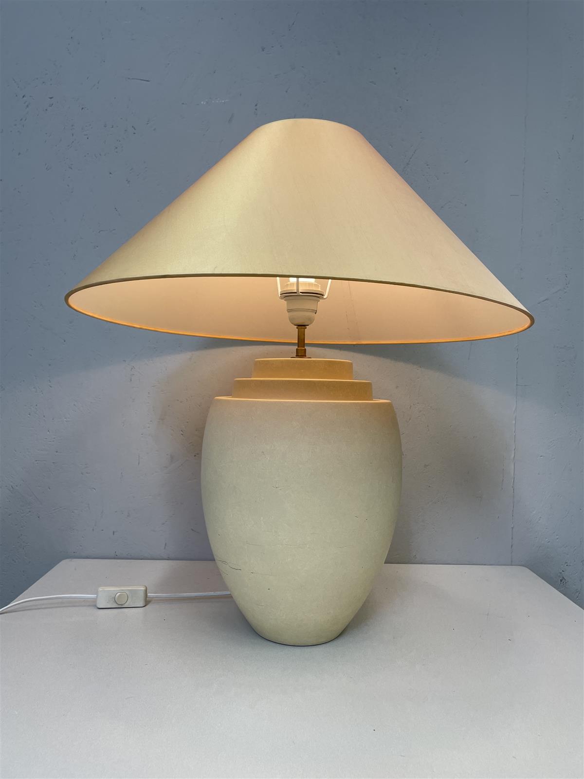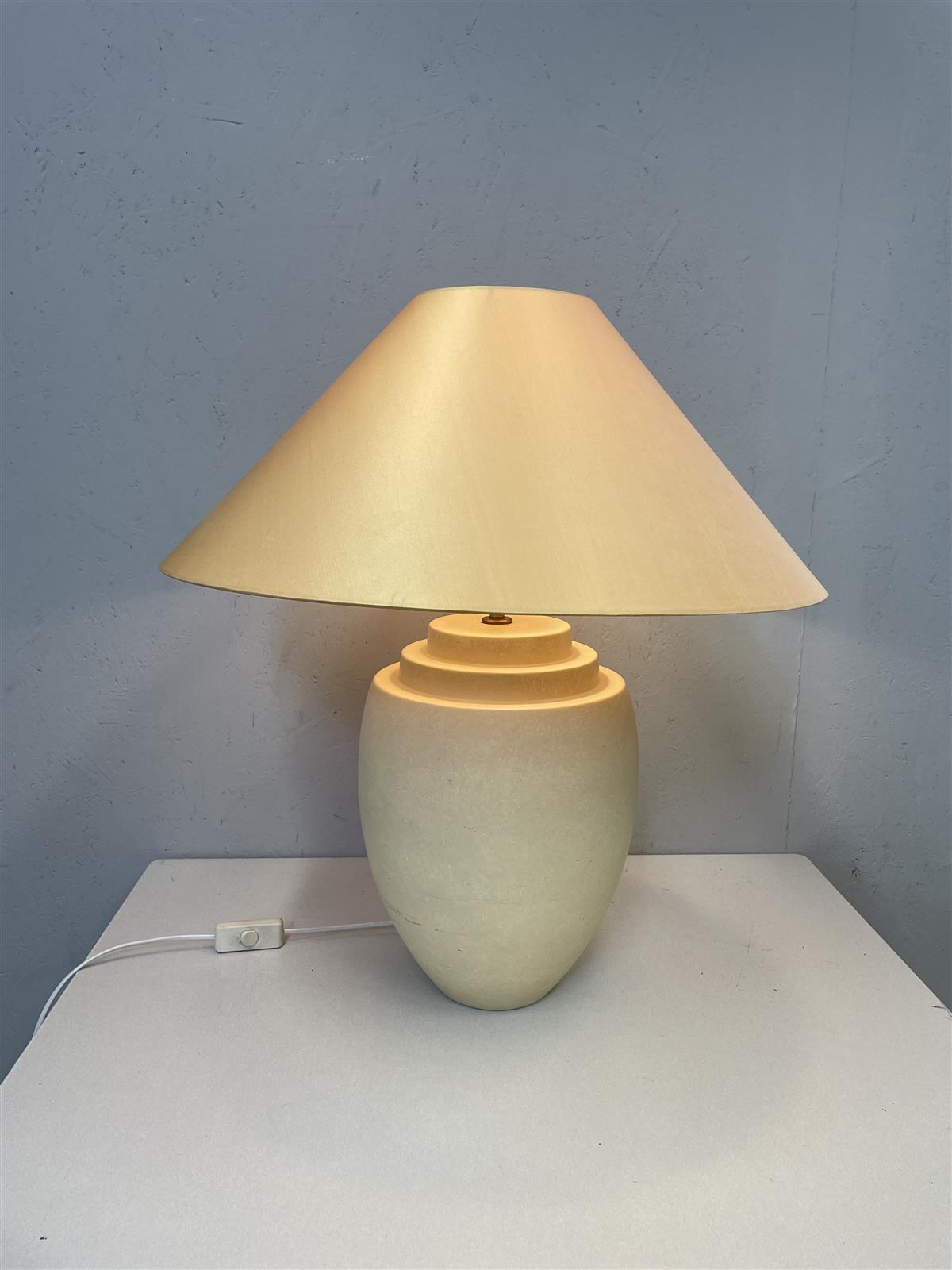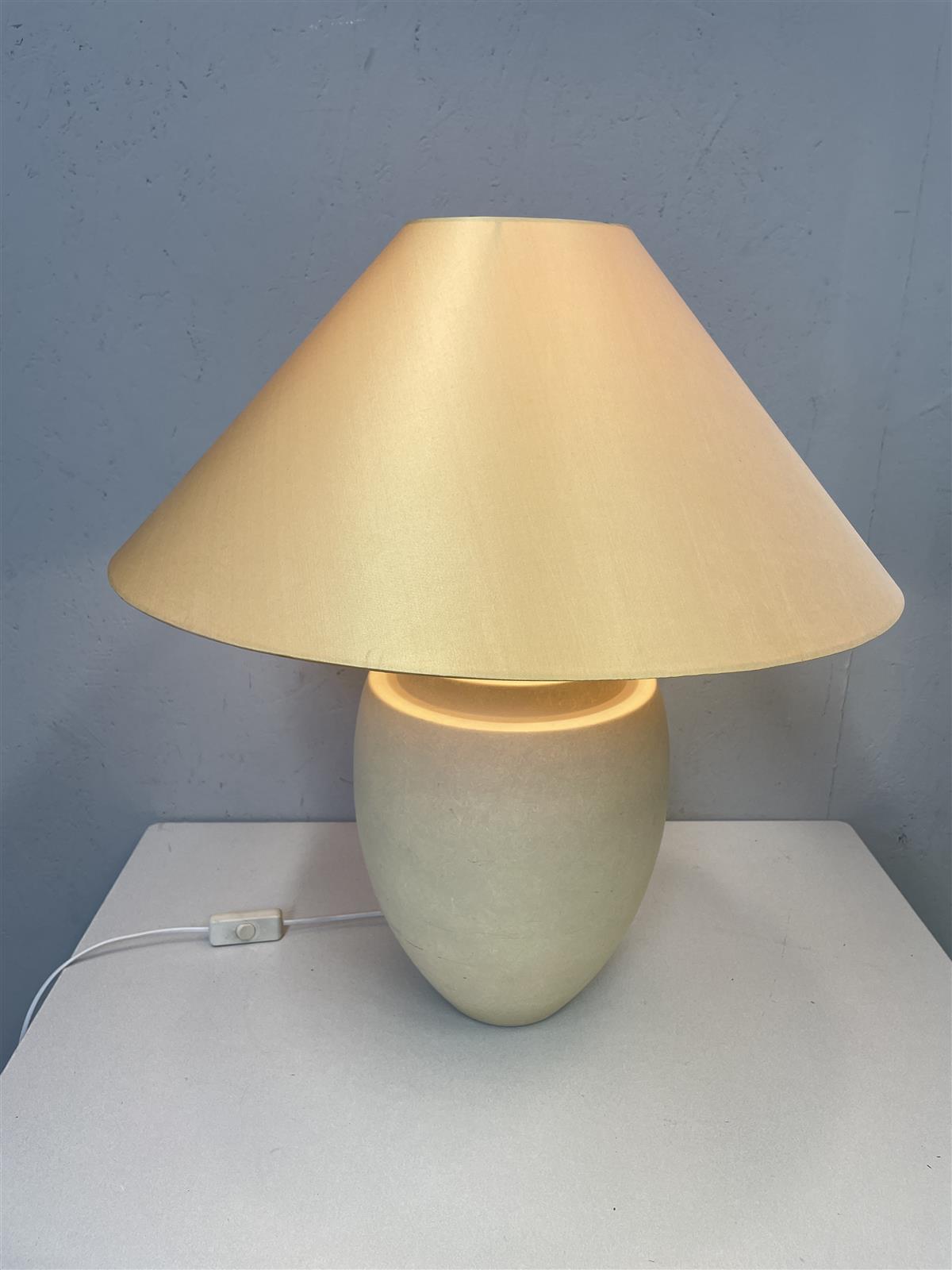 Robert Kostka pöytävalaisin, jossa on tyylikäs, vaalea oranssi varjostin ja tukeva keraaminen jalka. varjostimen halkaisija 55cm.