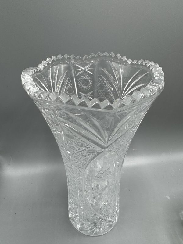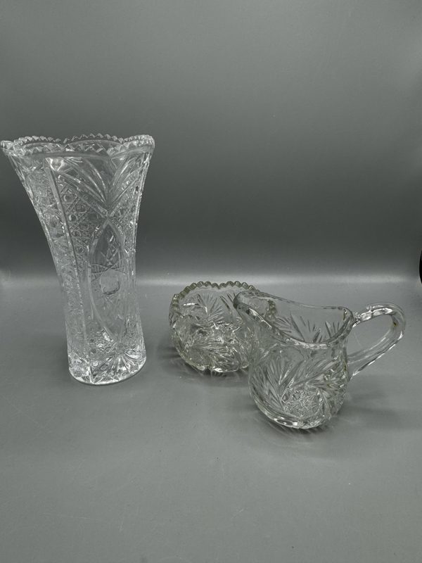 Kristallimaljakko (mitat ilmoituksessa) sekä oletettavasti Riihimäen lasi valmistama kristalli kermakko sekä sokerikko.