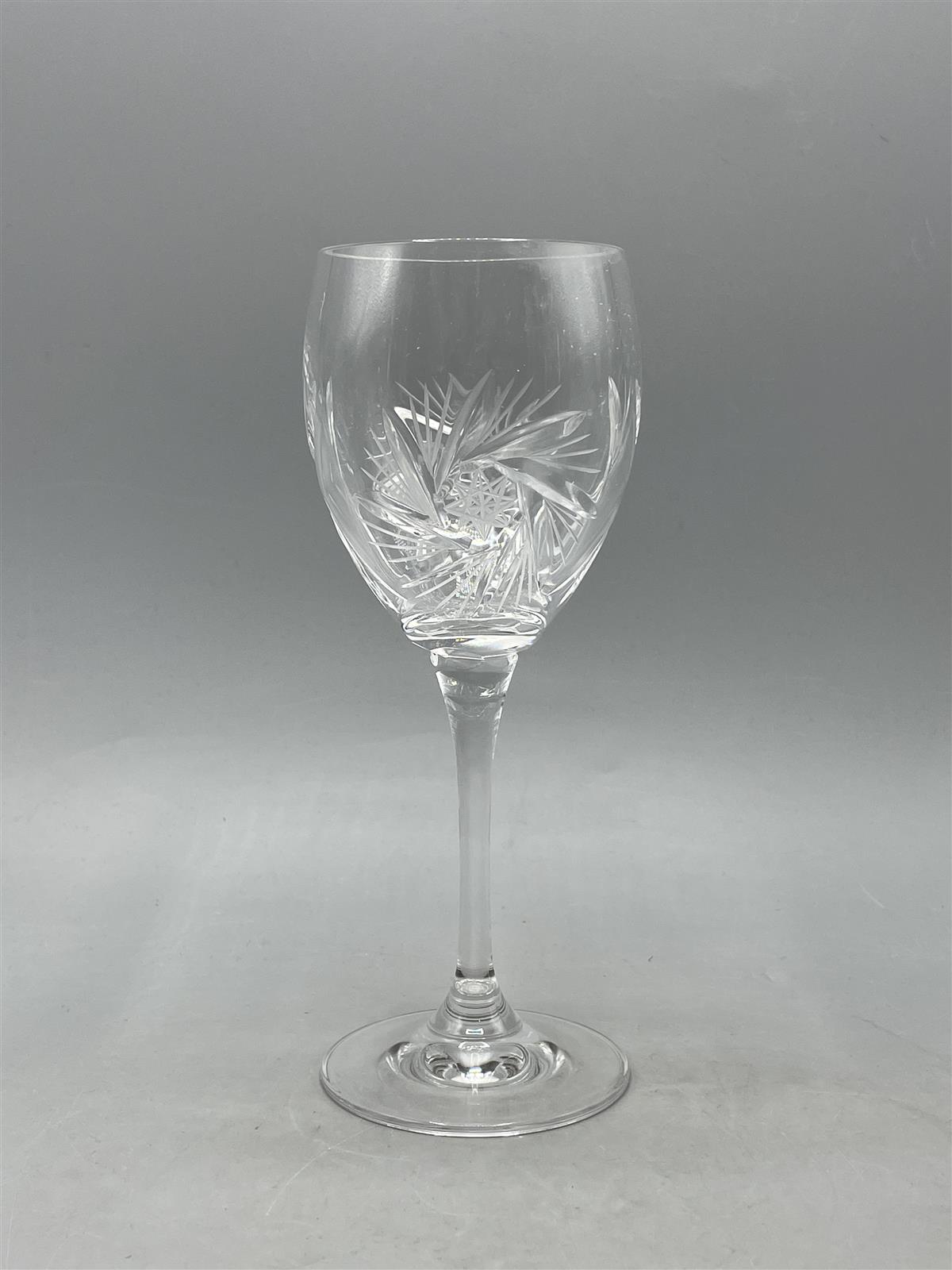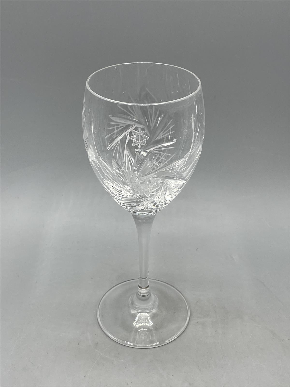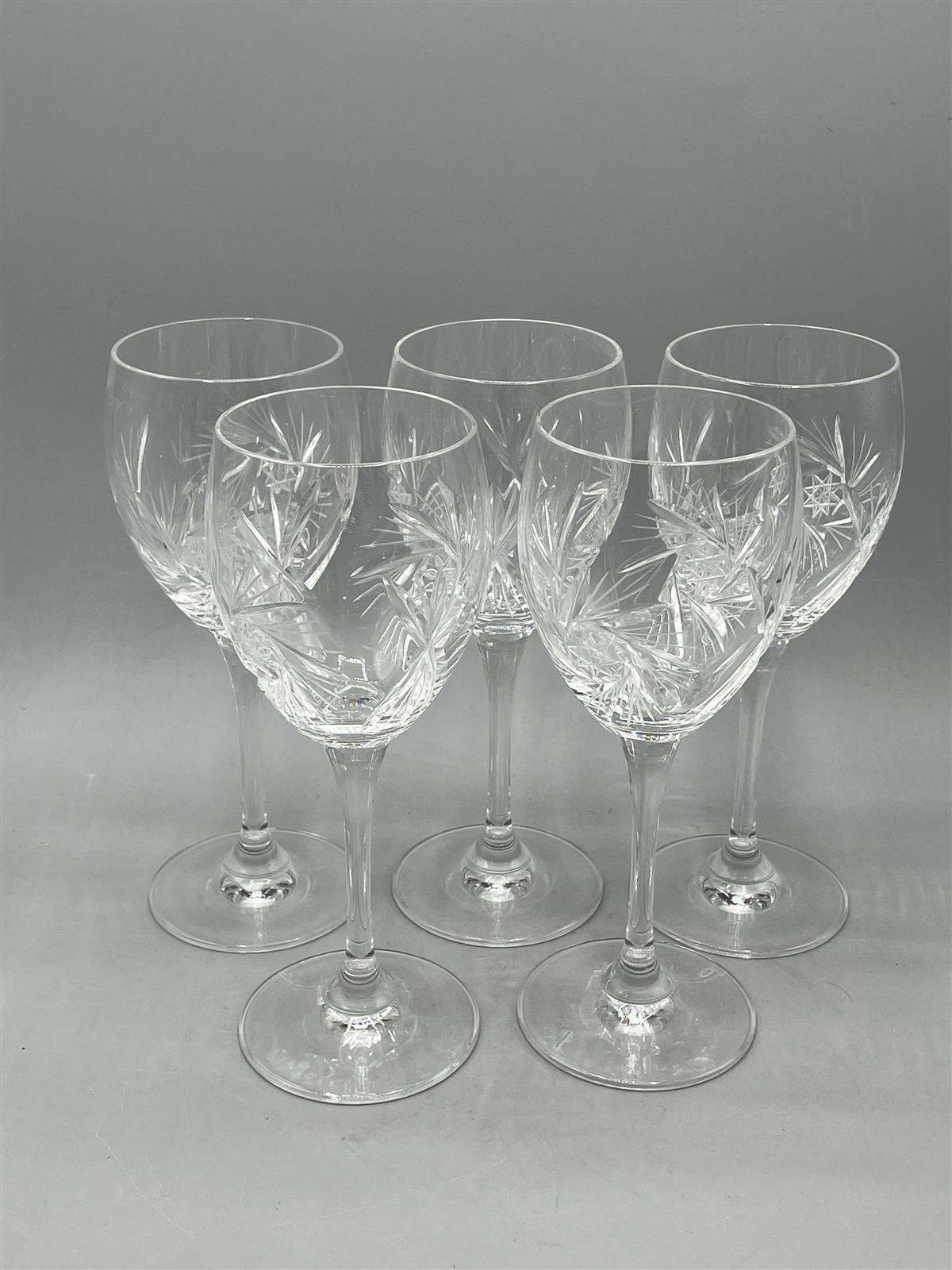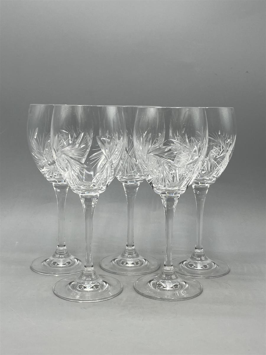 Viisi kaunista kristalliviinilasia, joissa on hienostunut kaiverrus.