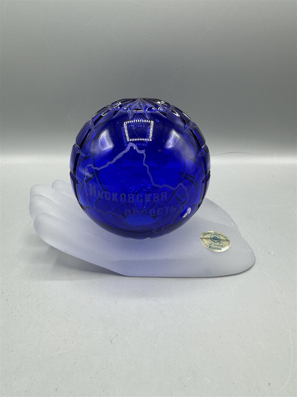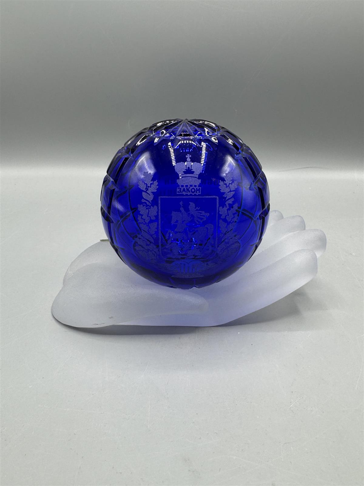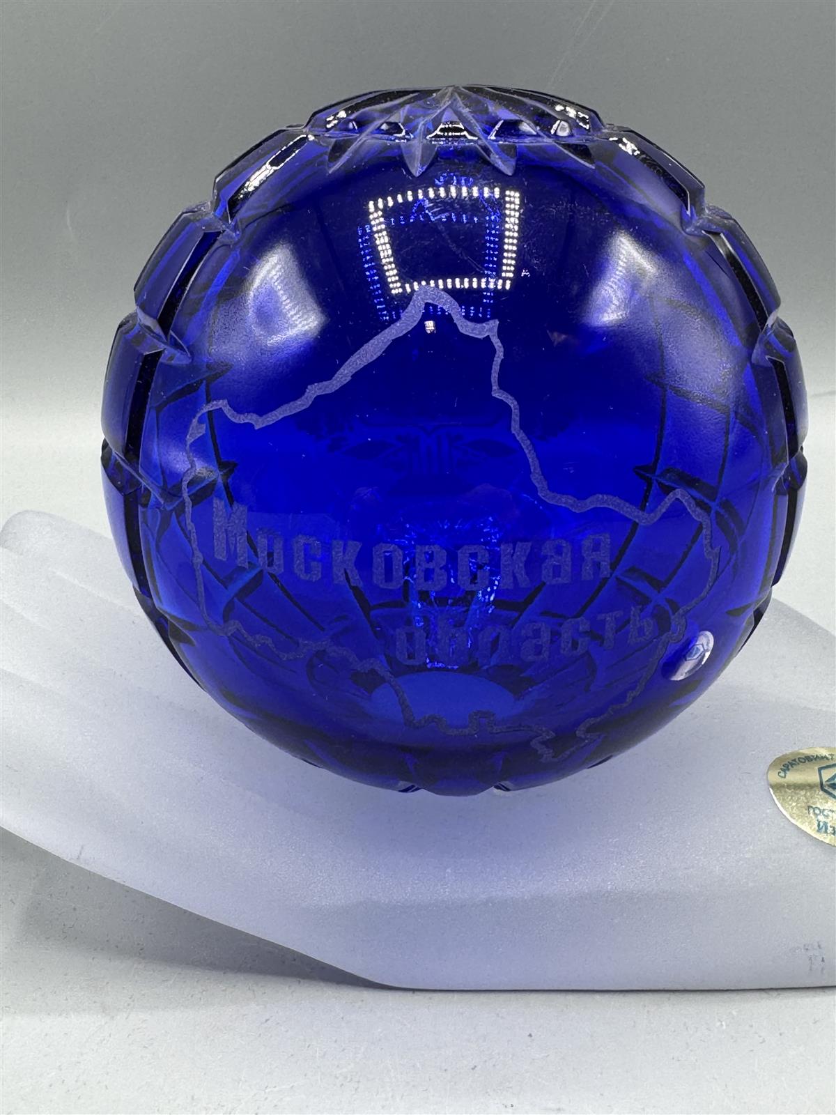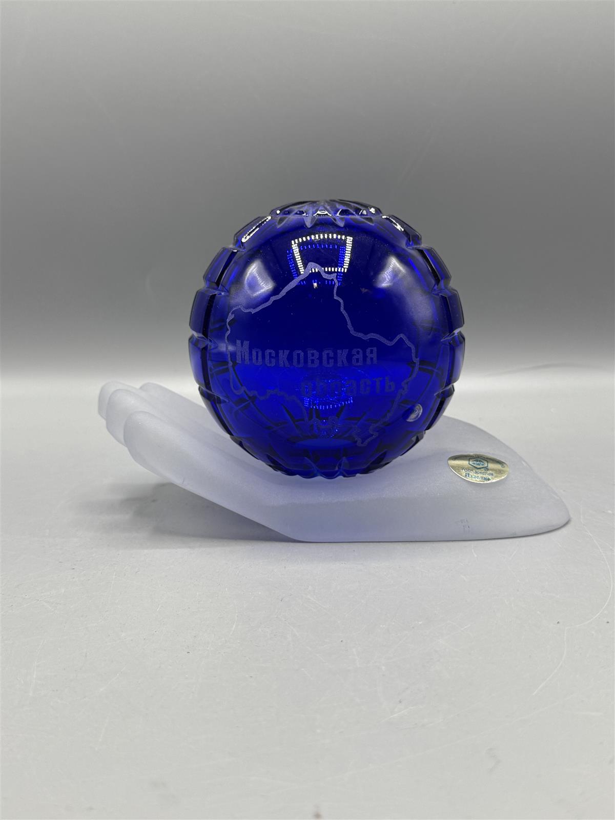 Sininen kristalli koristepallo, jossa on kaiverrettuja yksityiskohtia ja Moskovan alueen sekä vaakuna kartta ja se lepää lasisella kädellä.