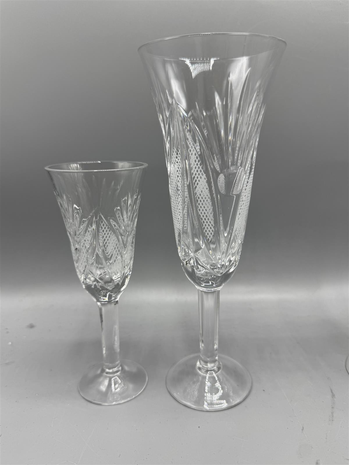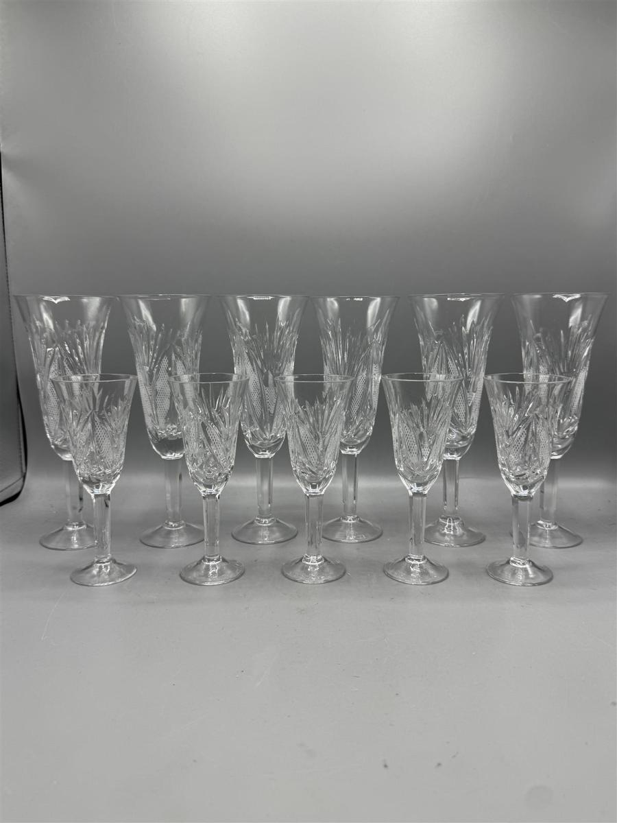 Tyylikkäät kristallilasit, joissa on kauniit leikatut kuviot ja trumpettimainen muoto. Setissä on yhteensä yksitoista lasia, jotka sopivat erinomaisesti juhlahetkiin tai eleganttiin kattaukseen. Lasit ovat kirkasta kristallia, mikä korostaa niiden hienostunutta ulkonäköä. Ison korkeus 20cm pienen (5 kpl) 14cm.