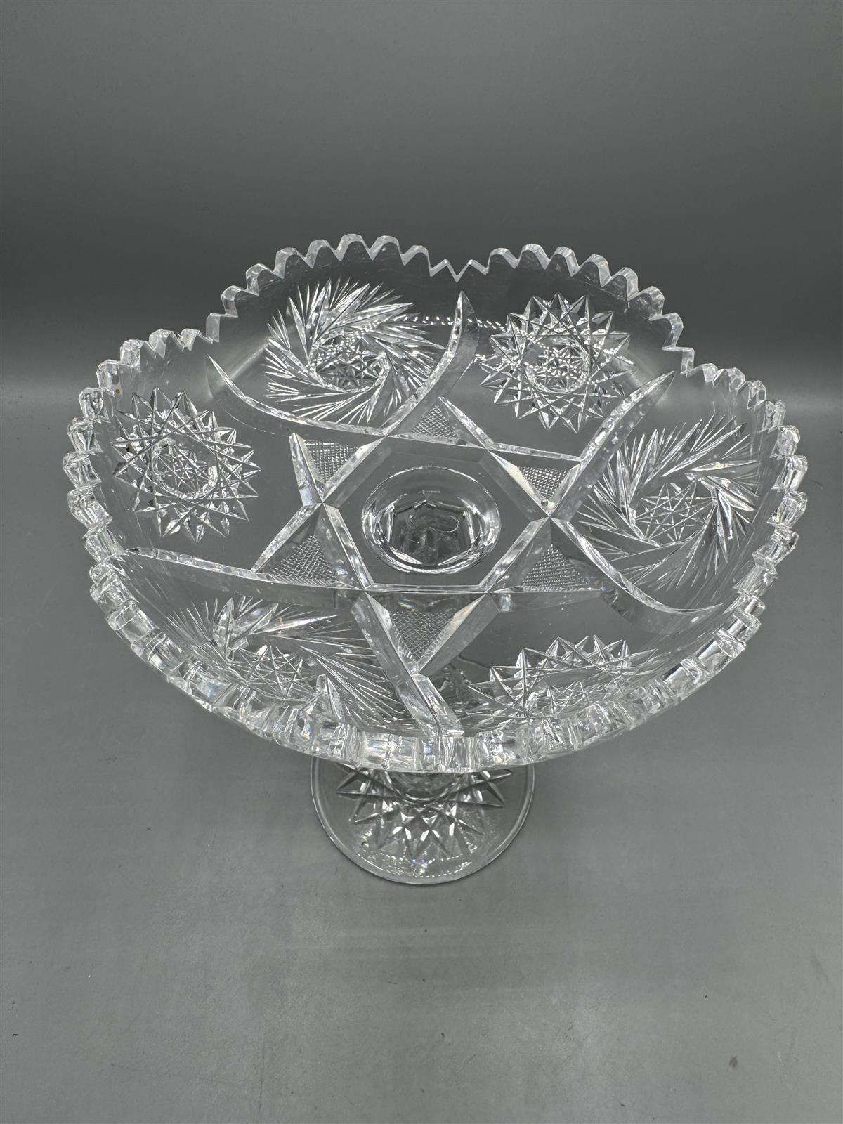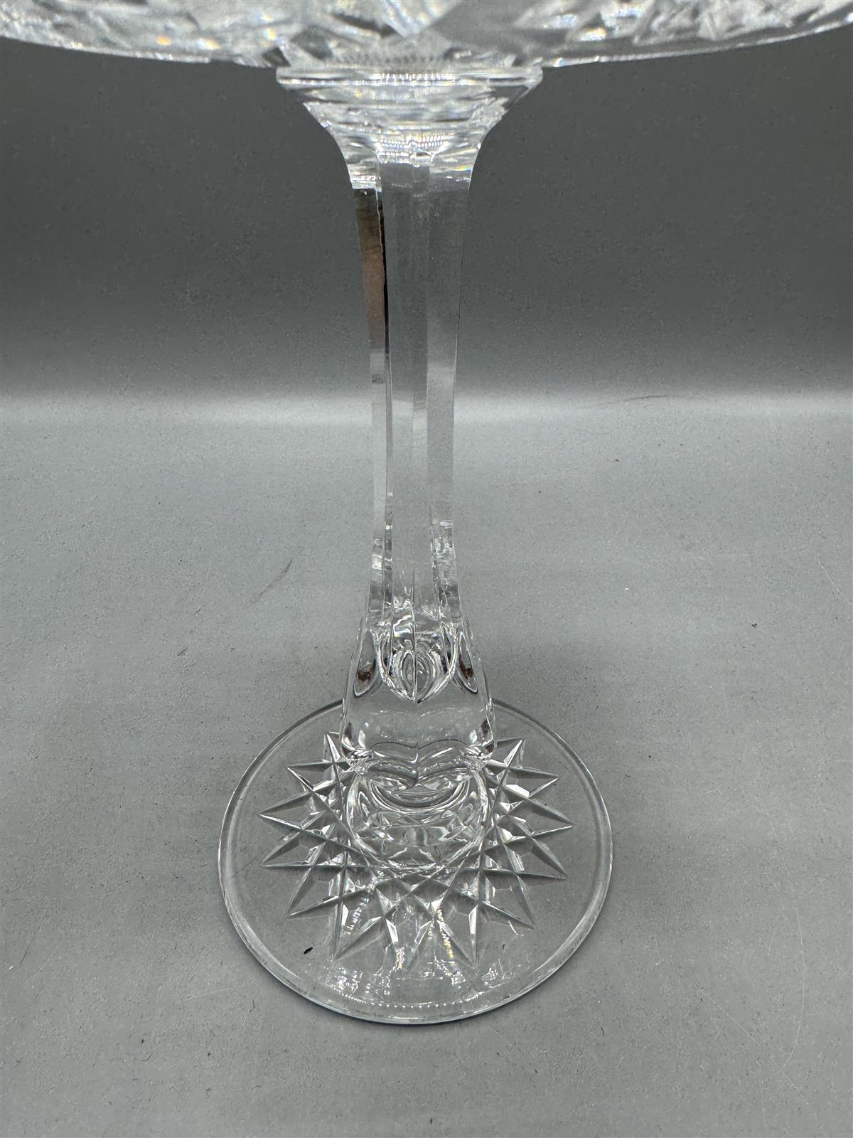 Tyylikäs kristallimalja, jossa on koristeellinen leikkauskuvio. Malja seisoo korkealla jalalla, joka antaa sille arvokkaan ilmeen ja korostaa sen kauneutta. Tämä esine on täydellinen lisä juhlapöytään tai koristeeksi mihin tahansa tilaan.