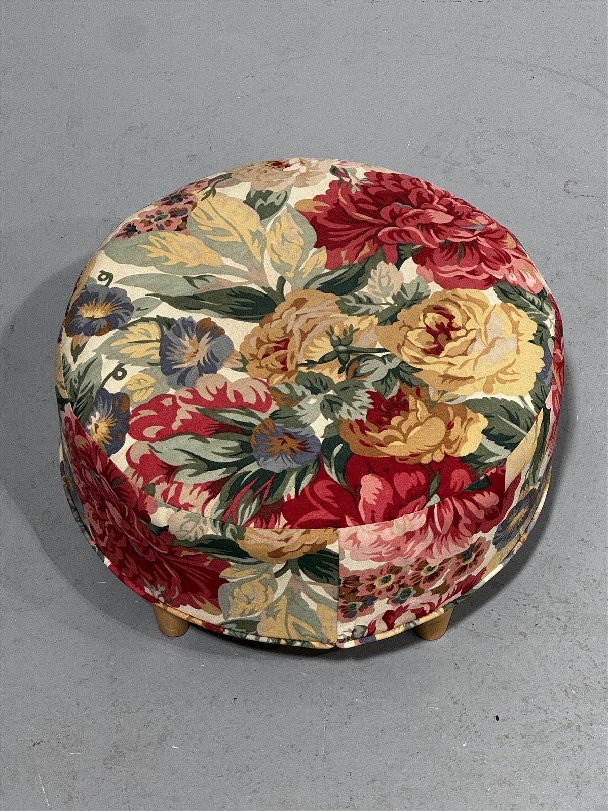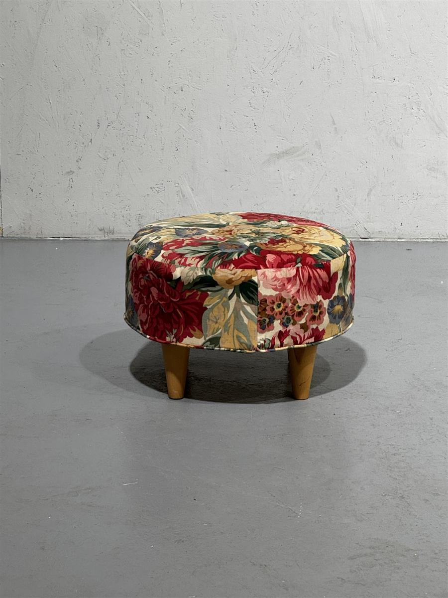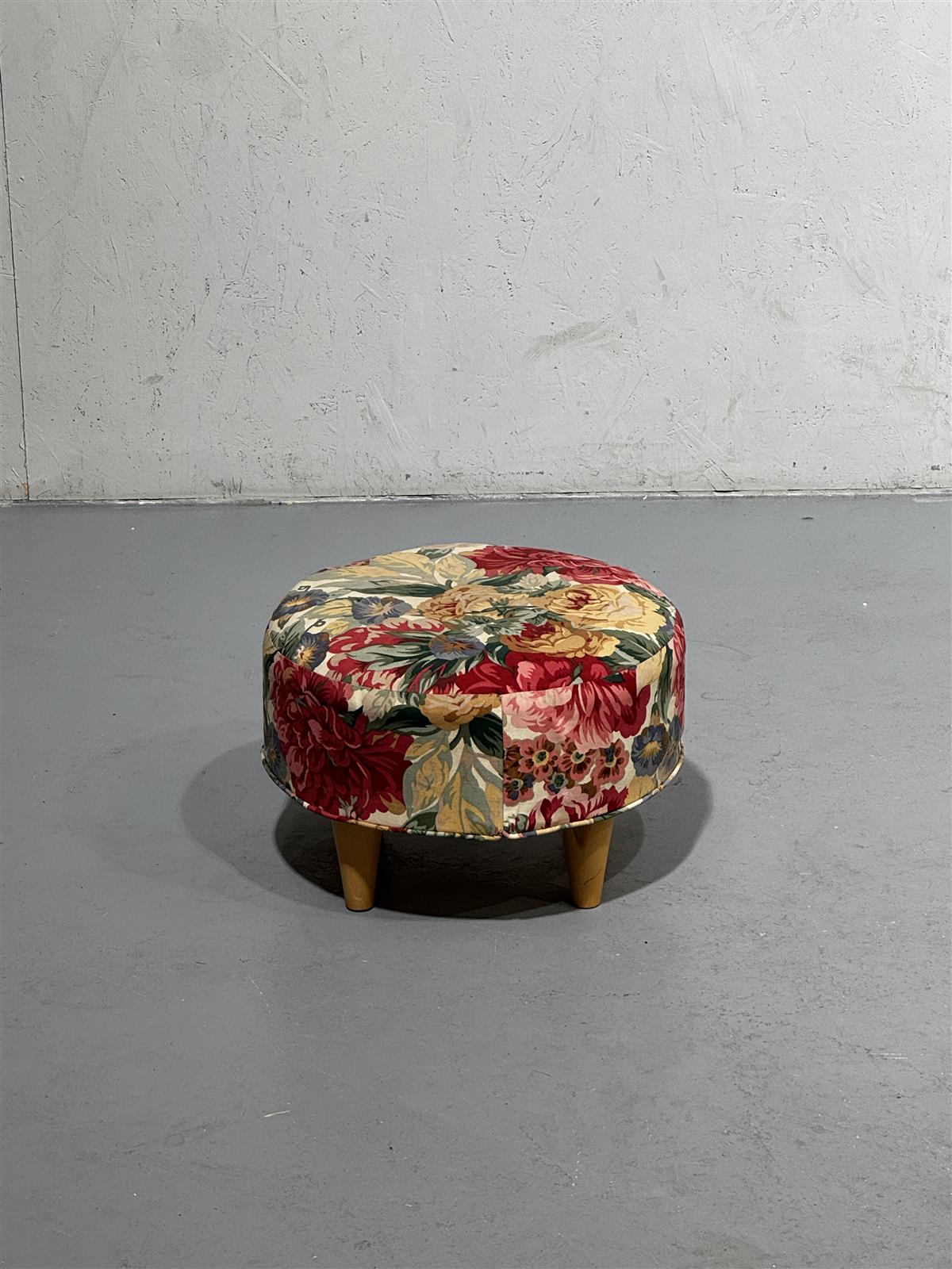 Pyöreä rahi, jossa on kukkakuvioinen verhoilu. Rahissa on neljä puista jalkaa, jotka antavat sille tukevan rakenteen.