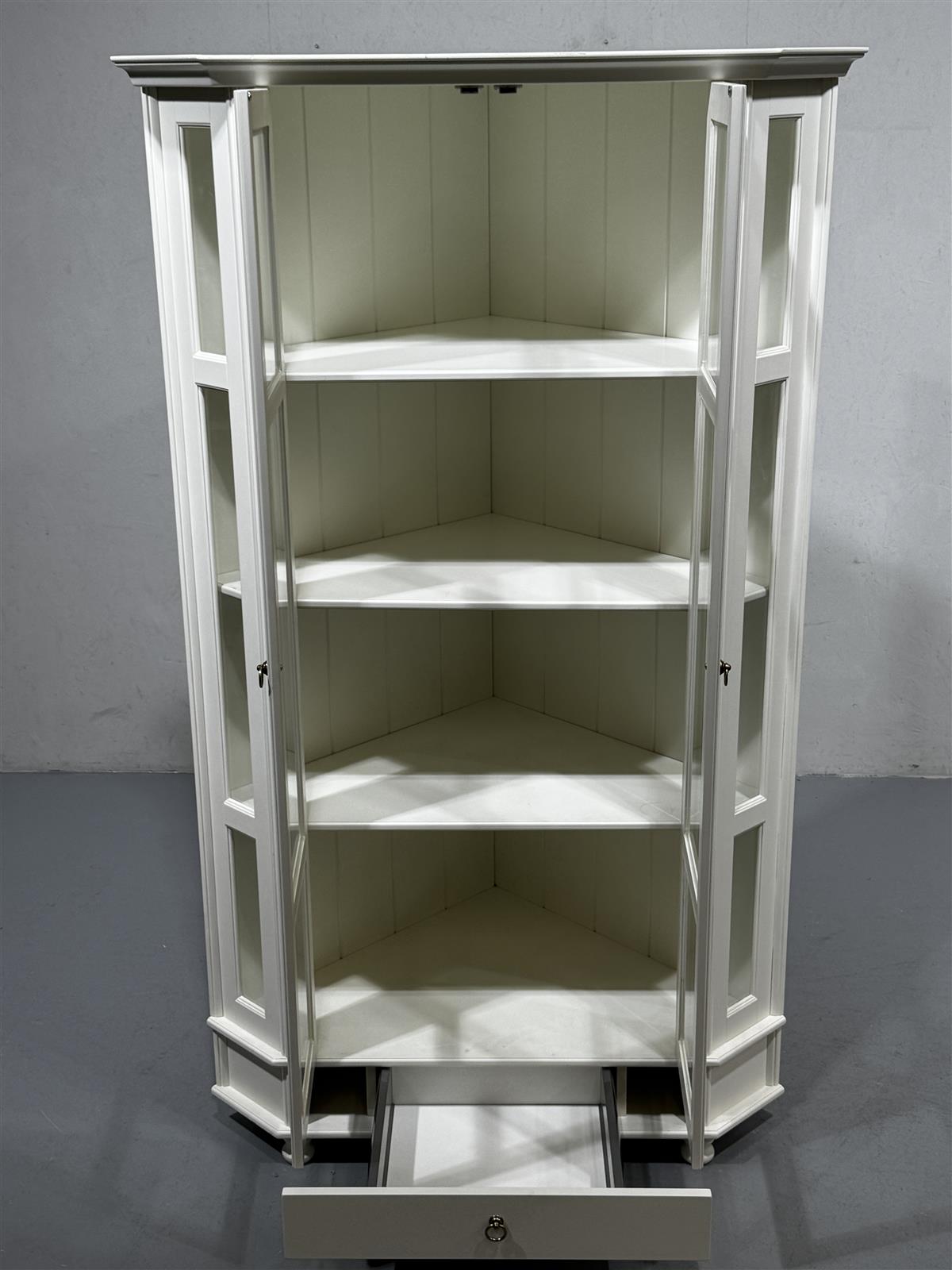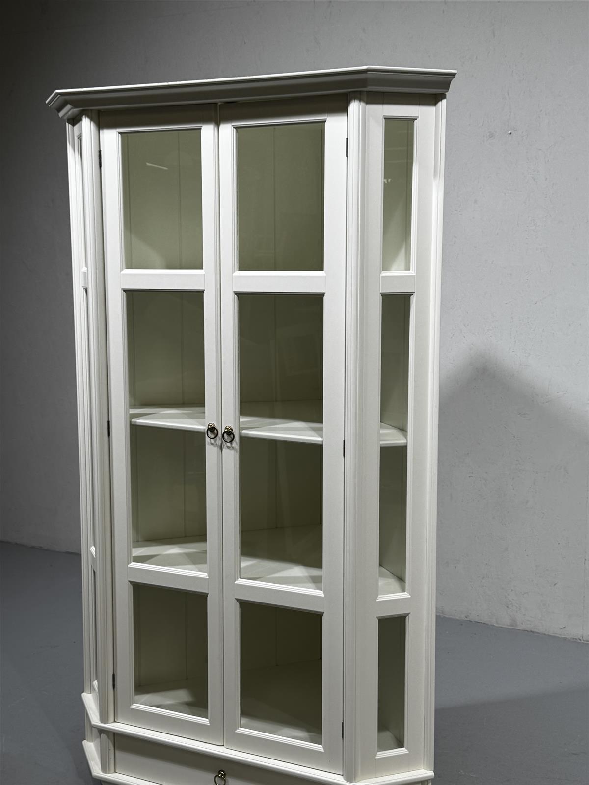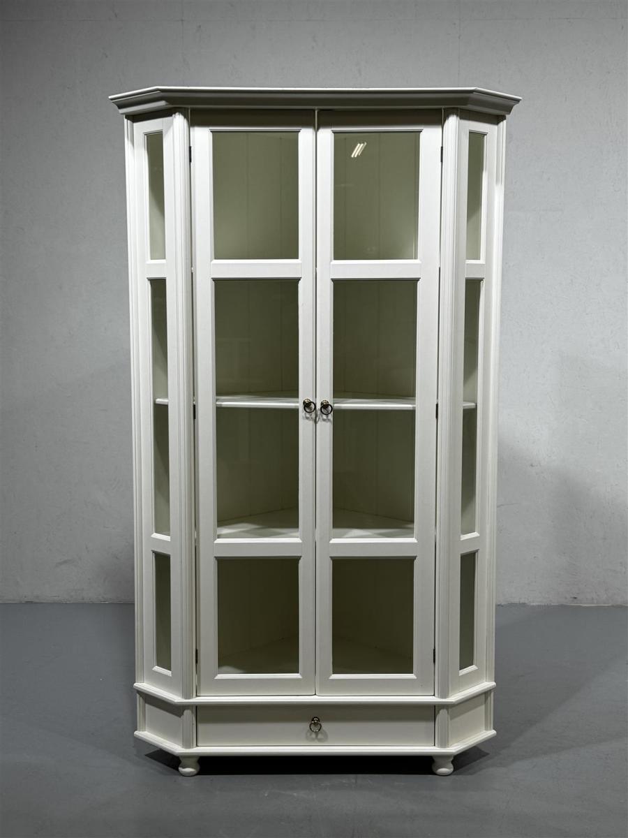 Valkoinen kulmavitriinikaappi, jossa on lasiovet ja puuhyllyt. Kaapissa on myös alalaatikko, joka tarjoaa lisäsäilytystilaa. Kaapin muotoilu on kulmikas ja se sopii hyvin nurkkaan sijoitettavaksi. Sivun leveys 79cm, tukeva ja raskas.