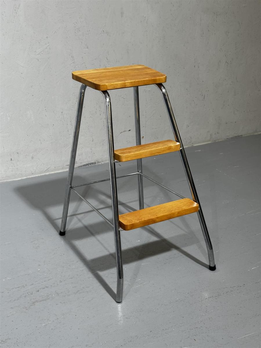 Tämä tukeva porrasjakkara on valmistettu metallista ja puusta. Siinä on kaksi askelmaa ja tukeva rakenne, joka tekee siitä käytännöllisen apuvälineen kotona tai työpaikalla.