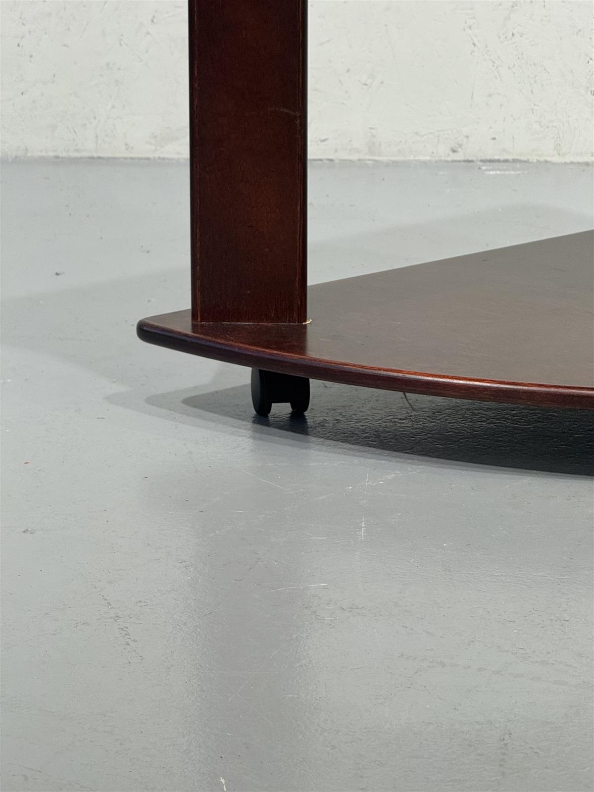 Kulmapöytä, joka on valmistettu tummasta puusta. Pöydässä on kaksi tasoa ja se on suunniteltu kulmakäyttöön, mikä tekee siitä käytännöllisen pieniin tiloihin. Renkaat alla helpoon siirtelyyn.