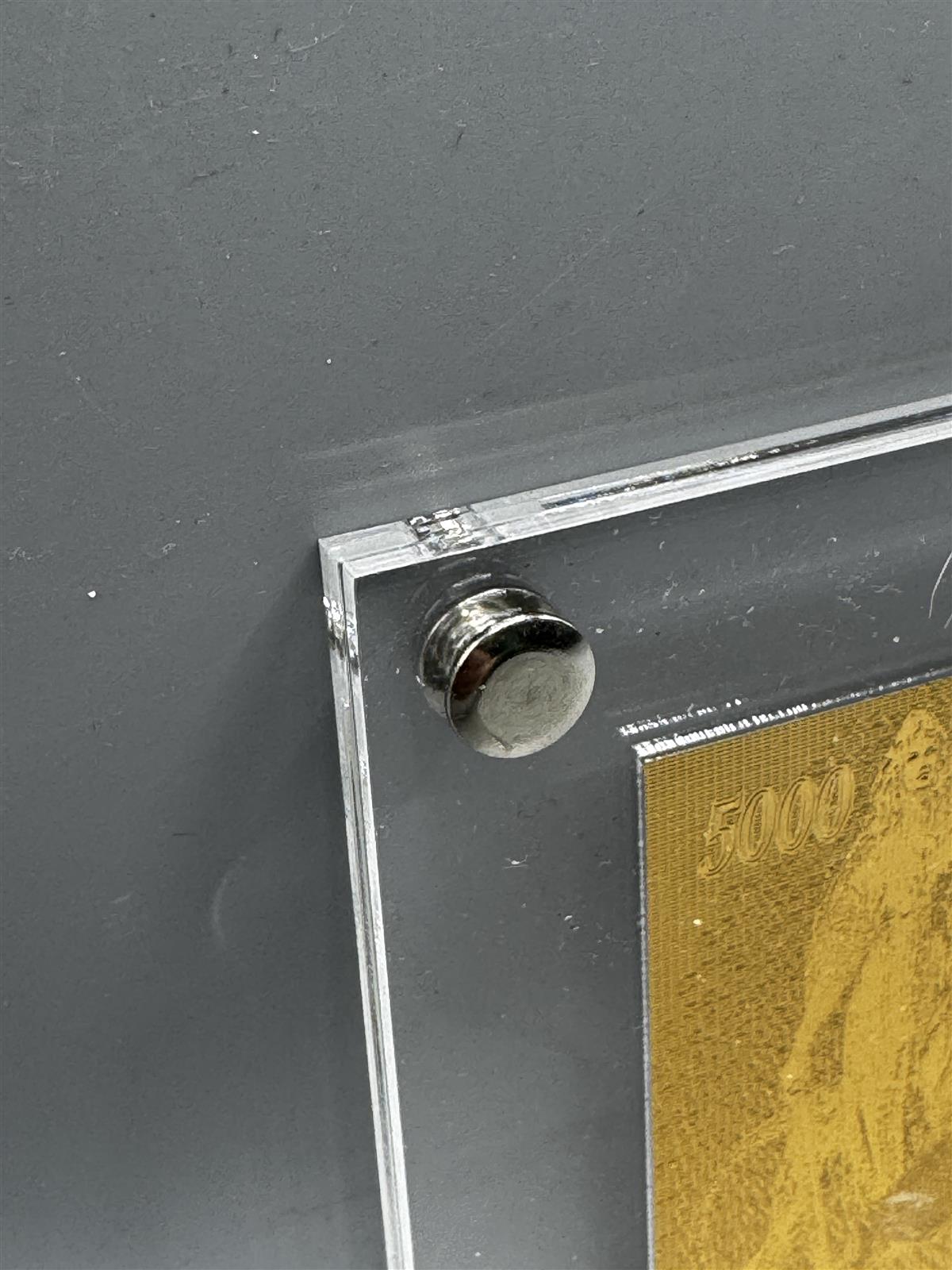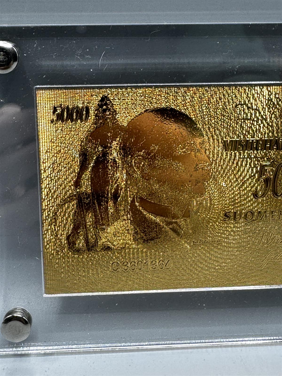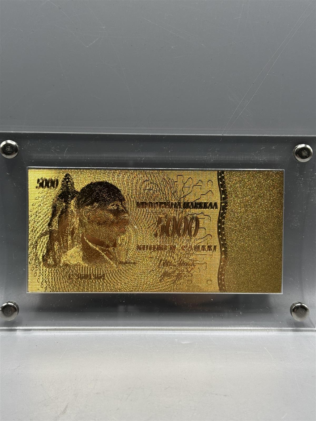 Kultainen seteli, jossa on 5000 markan nimellisarvo. Seteli on kehystetty läpinäkyvään kehykseen, joka on kiinnitetty ruuveilla. Seteli ja kehys ovat hyvässä kunnossa ilman näkyviä vaurioita tai kulumia.