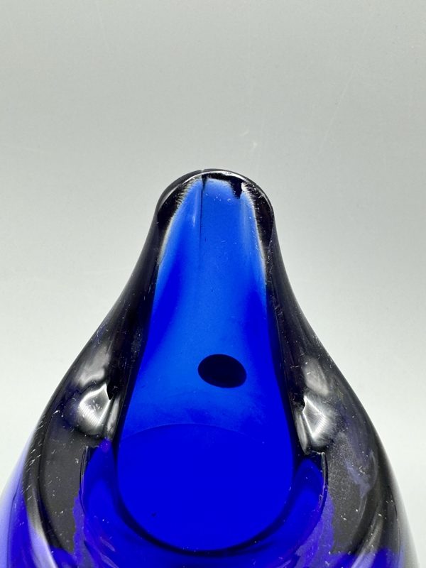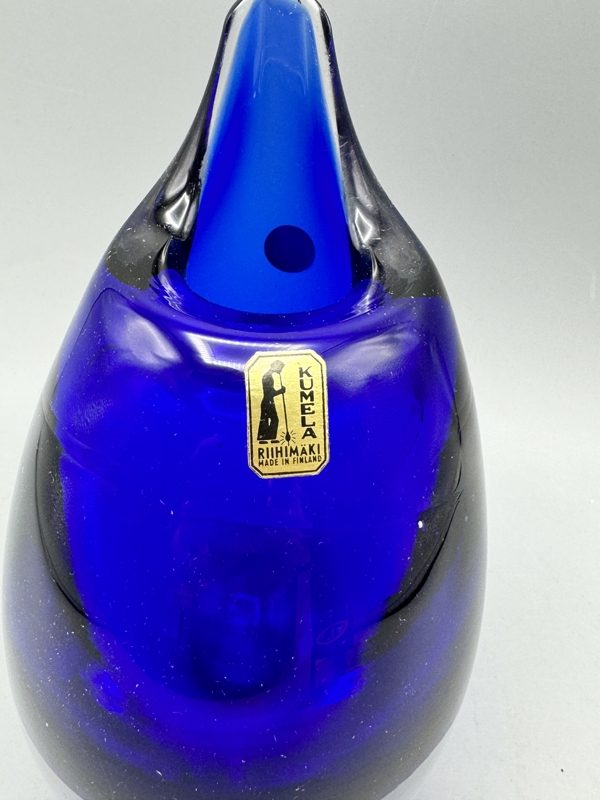 Paksulasinen Kumelan lasi taidelasi maljakko, jossa sininen väri. Pohjassa stanssaus, maljakon mallia ei tunnistettu.
