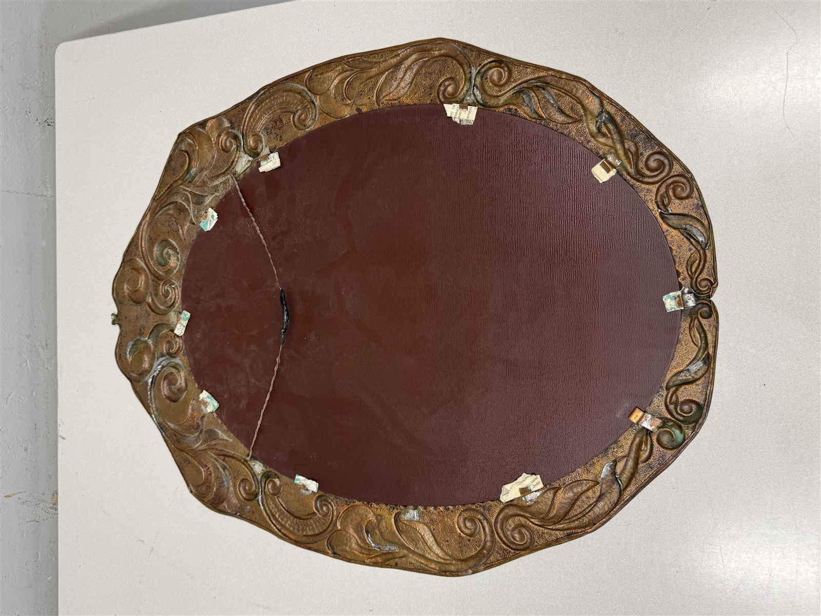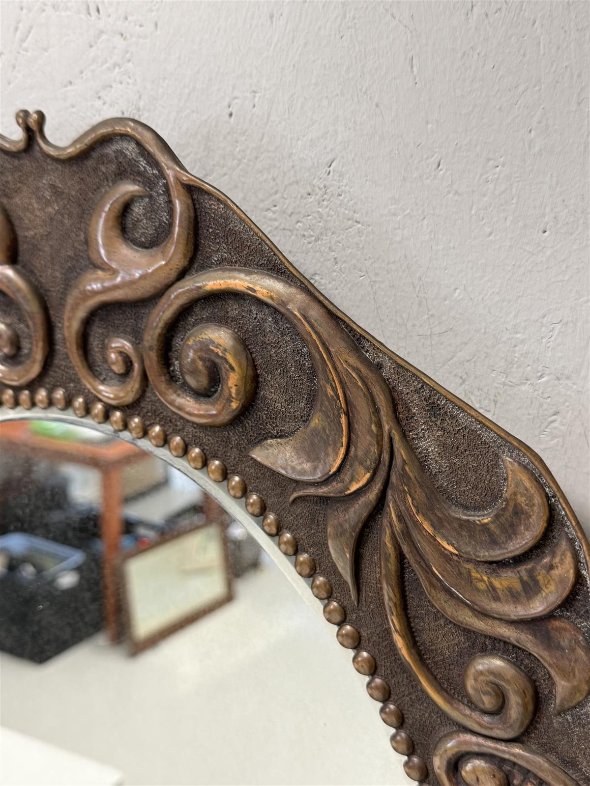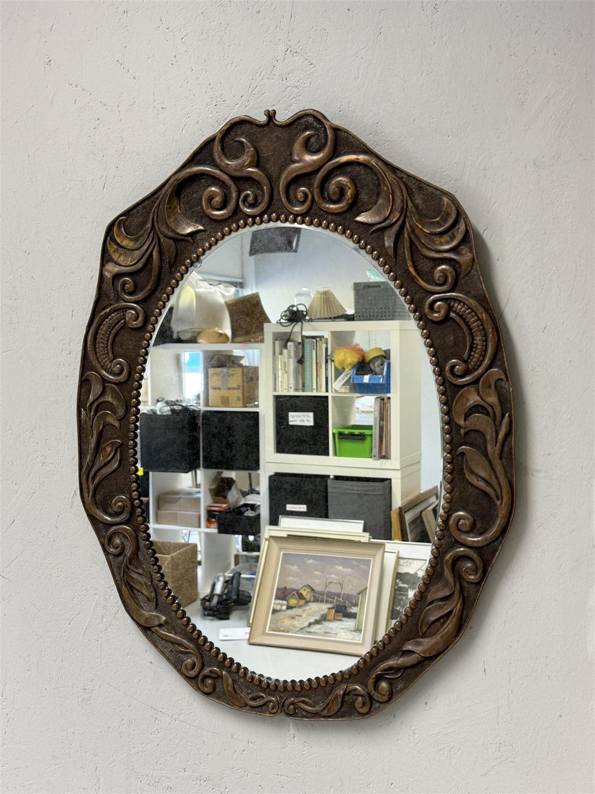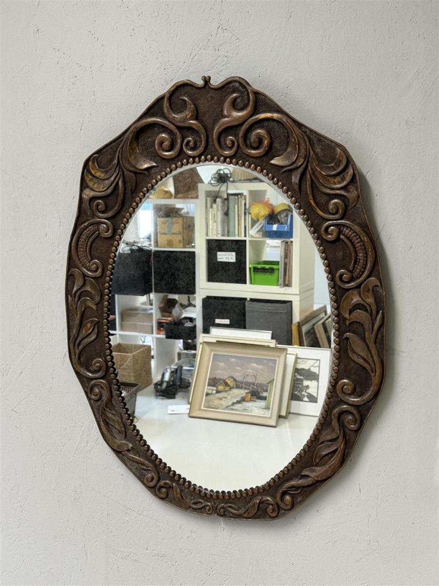 Koristeellinen peili, jossa on runsaat ja kaarevat kupariset kehykset. Kehyksissä on yksityiskohtaisia lehtikuvioita ja helmiäisreunus, jotka tuovat esiin barokkityylin vaikutteita. Peilin muoto on soikea, ja se on suunniteltu seinälle ripustettavaksi.