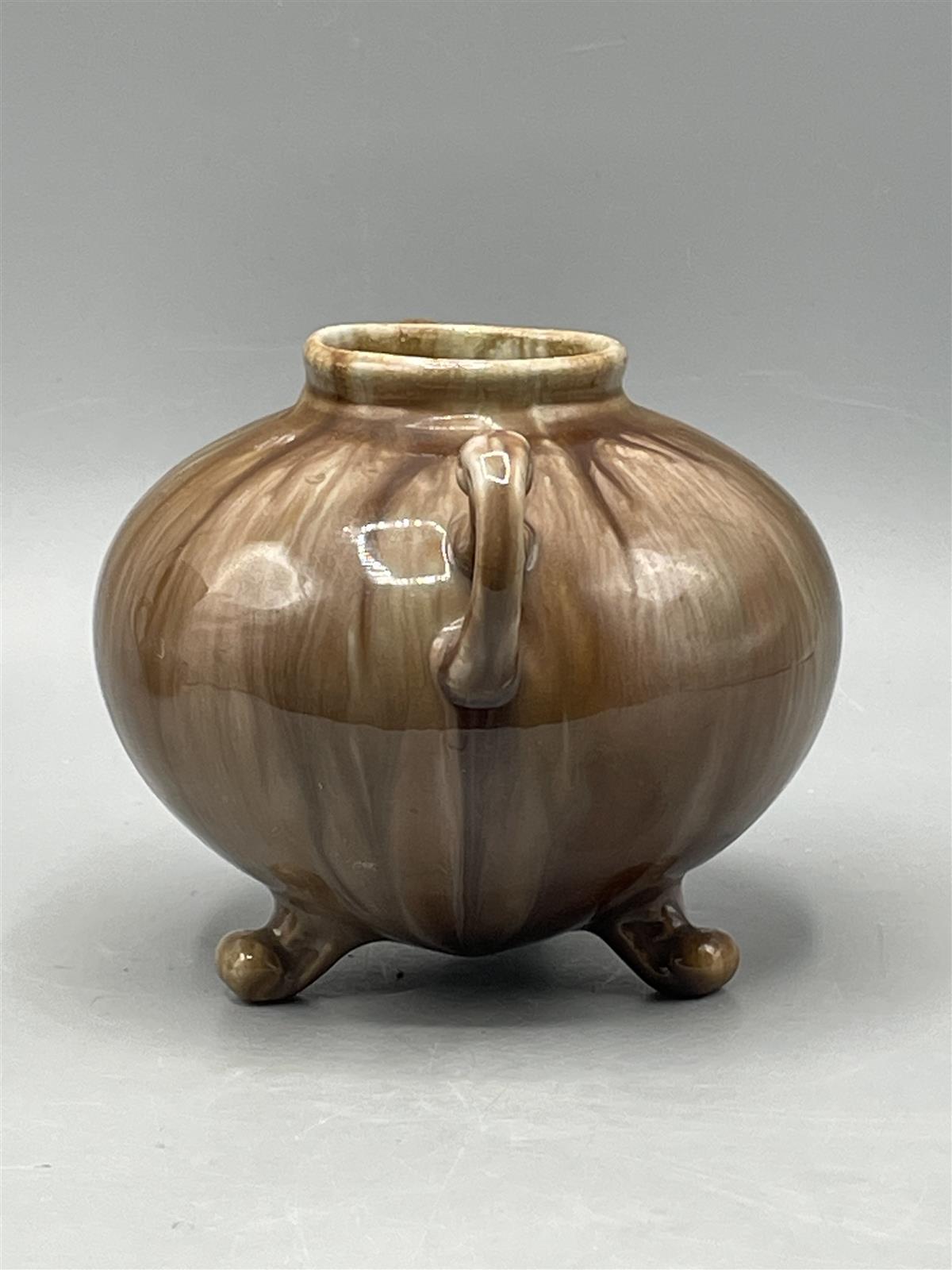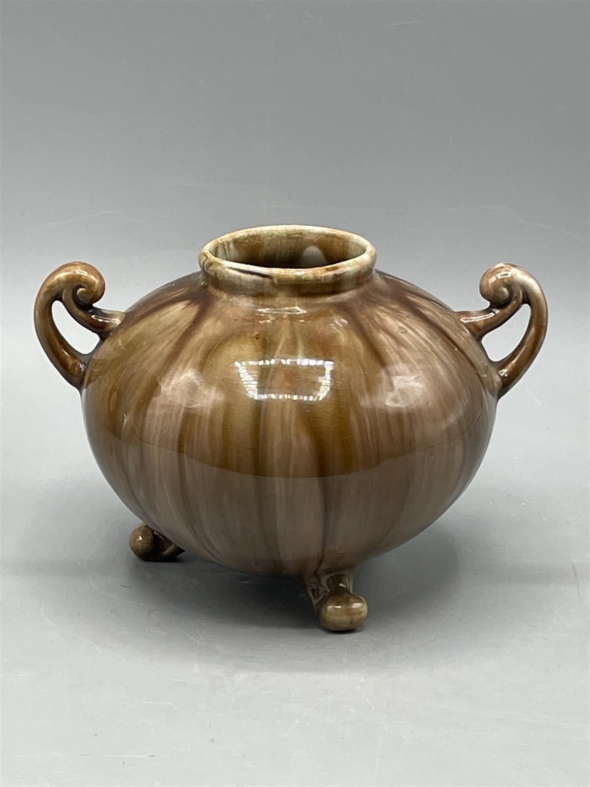 Kupittaan saven valmistama maljakko, jossa on kauniit kädensijat ja pyöreä muoto. Maljakko seisoo kolmella pienellä jalalla.