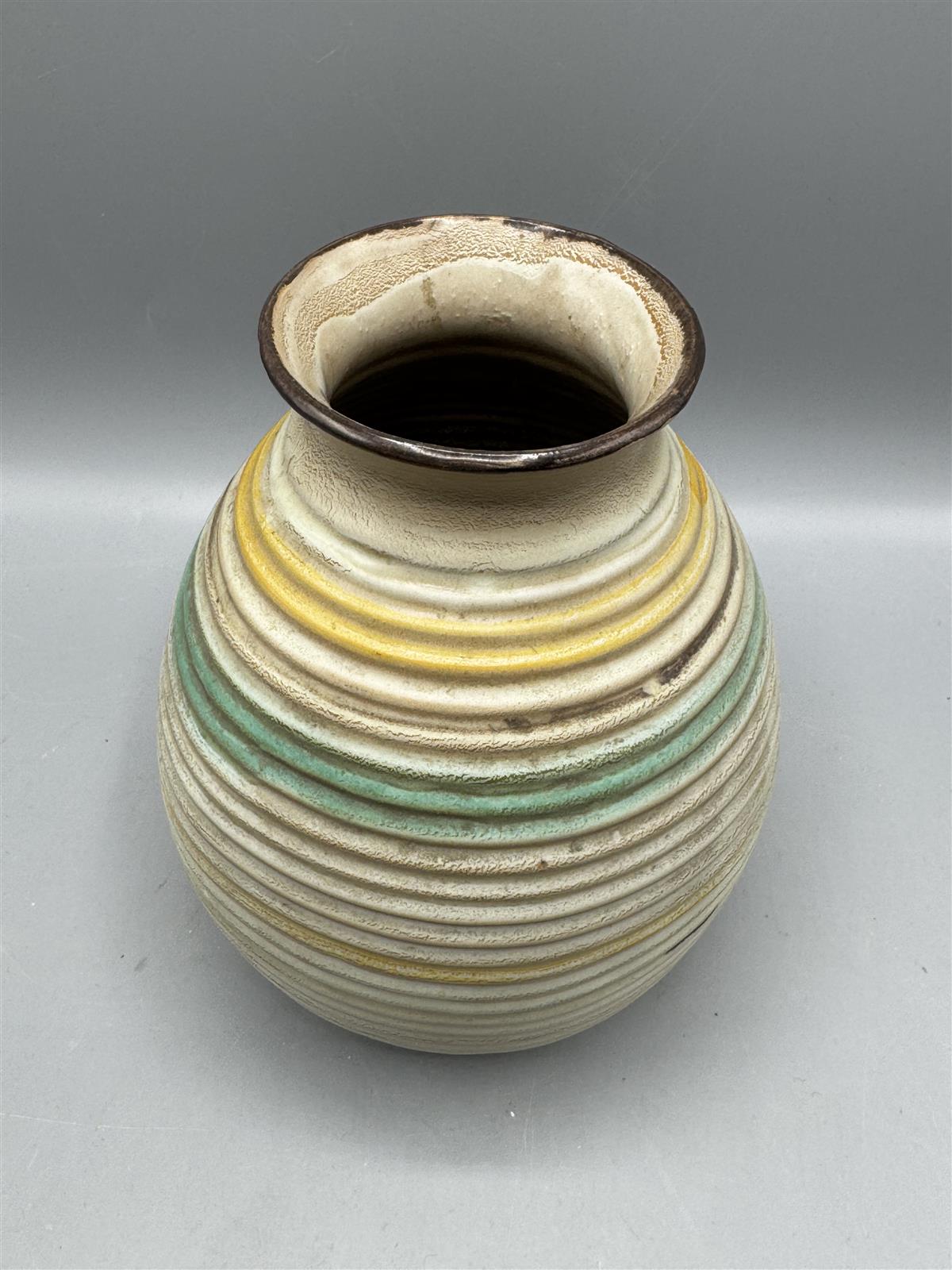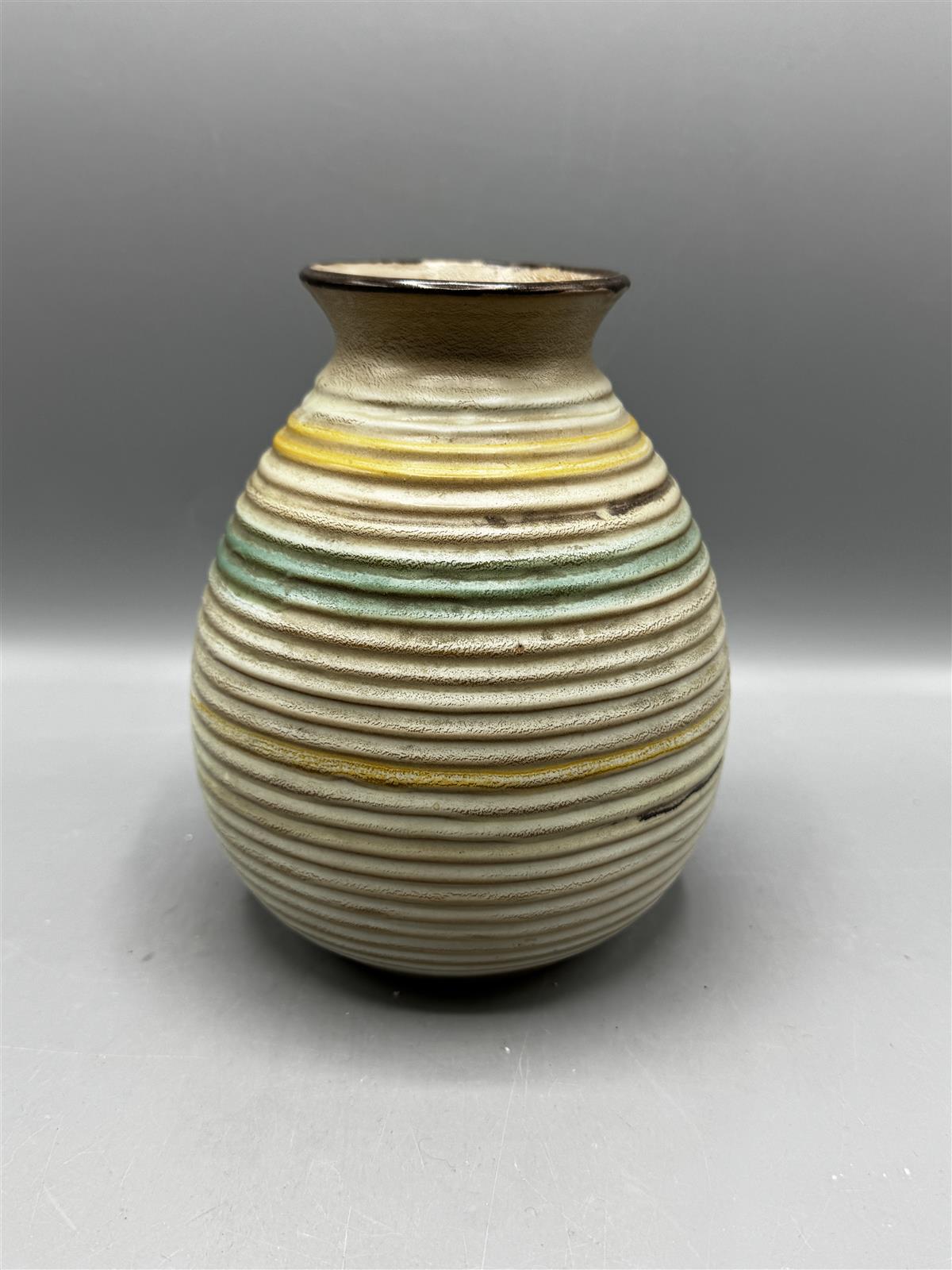 Kupittaan Savi maljakko, jossa on värikkäitä raitoja. Maljakko on valmistettu Suomessa ja siinä on selkeä Kupittaan Savi -leima pohjassa.