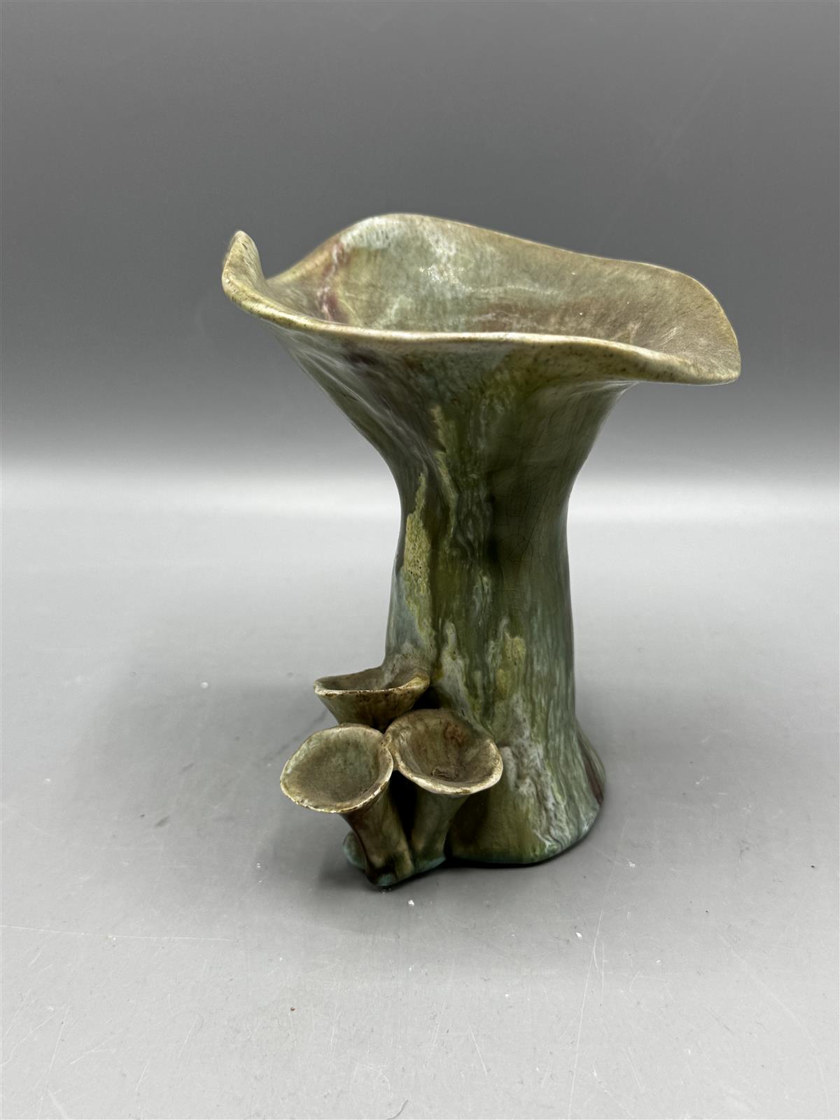 Koristeellinen Kupittaan Saven valmistama ”sieni” maljakko, jossa on ainutlaatuinen muotoilu ja vihreän sävyinen lasitus. Maljakon pohjassa on merkintä.