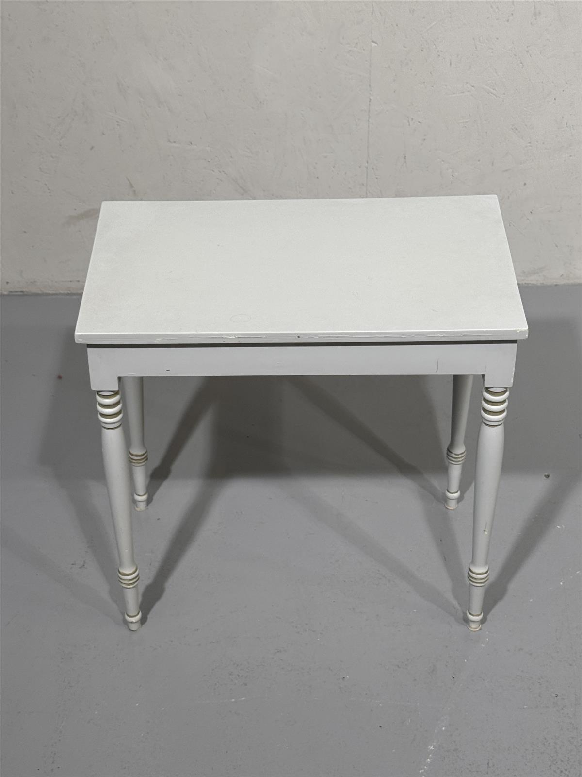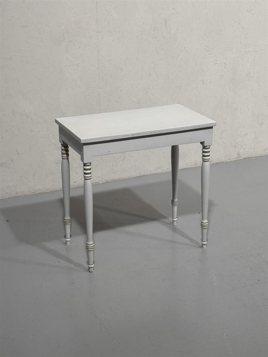 Pieni vaaleansiniseksi maalattu puupöytä, jossa on neljä sorvattua jalkaa. Pöydän pinta on yksinkertainen ja suorakulmainen, mikä tekee siitä monikäyttöisen eri tiloissa. Jalat ovat koristeellisesti muotoillut, mikä tuo esiin perinteisen käsityötaidon. Pöydän tyyli on kustavilainen talonpoikaistyyli, joka on tunnettu yksinkertaisuudestaan ja käytännöllisyydestään. Tämä tyyli on ollut suosittu maaseudulla ja se tuo mukanaan kodikkuutta ja perinteitä.