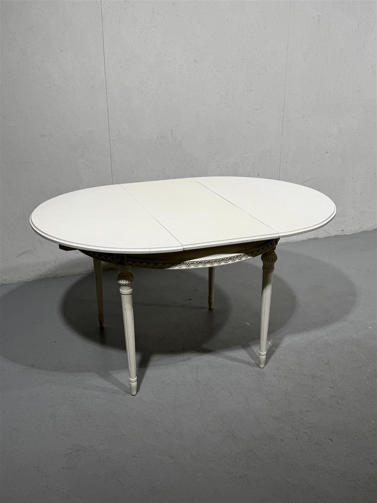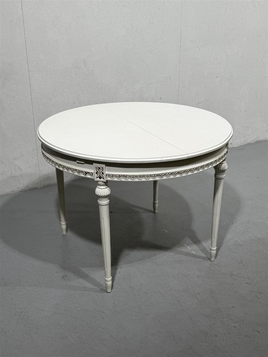 Valkoinen kustavilais tyylin pyöreä ruokapöytä, jossa on koristeelliset jalat ja reunat. Pöytälevy on pyöreä, jatkettavissa 40cm palalla. Pöytä on suunniteltu tarjoamaan tilaa useammalle henkilölle.