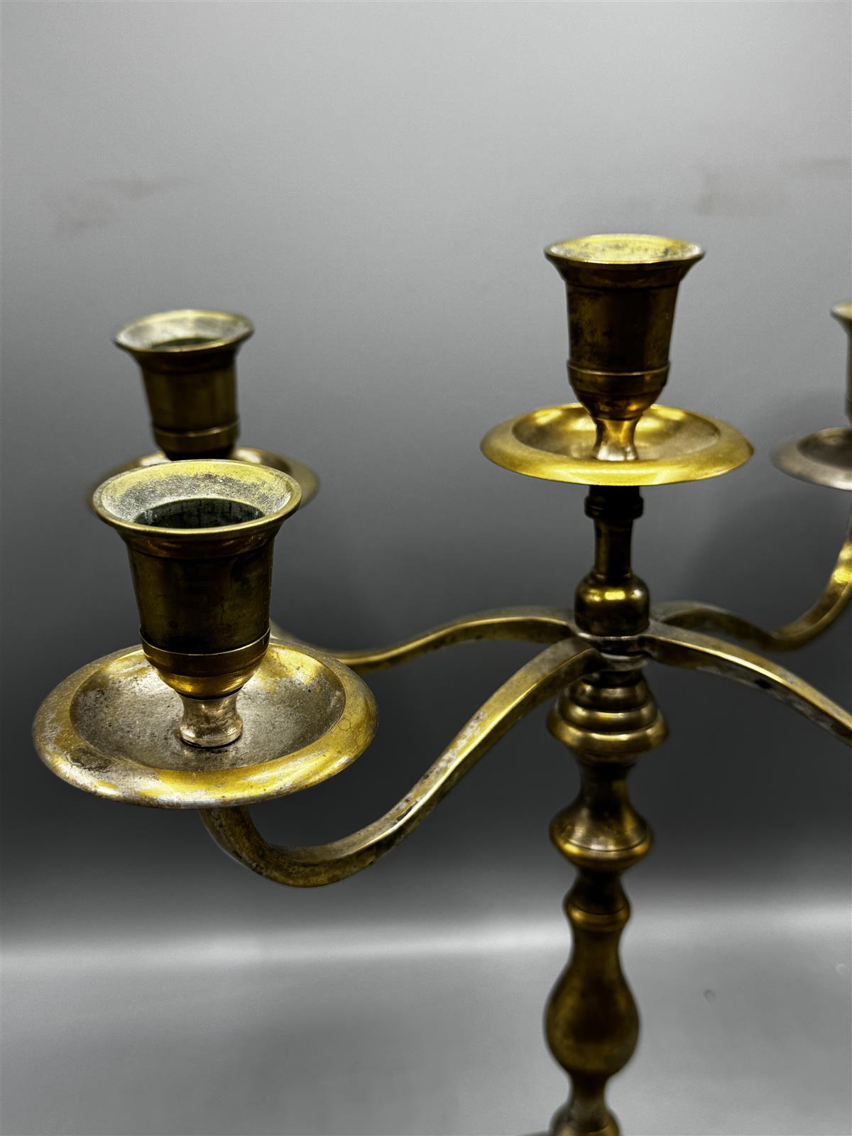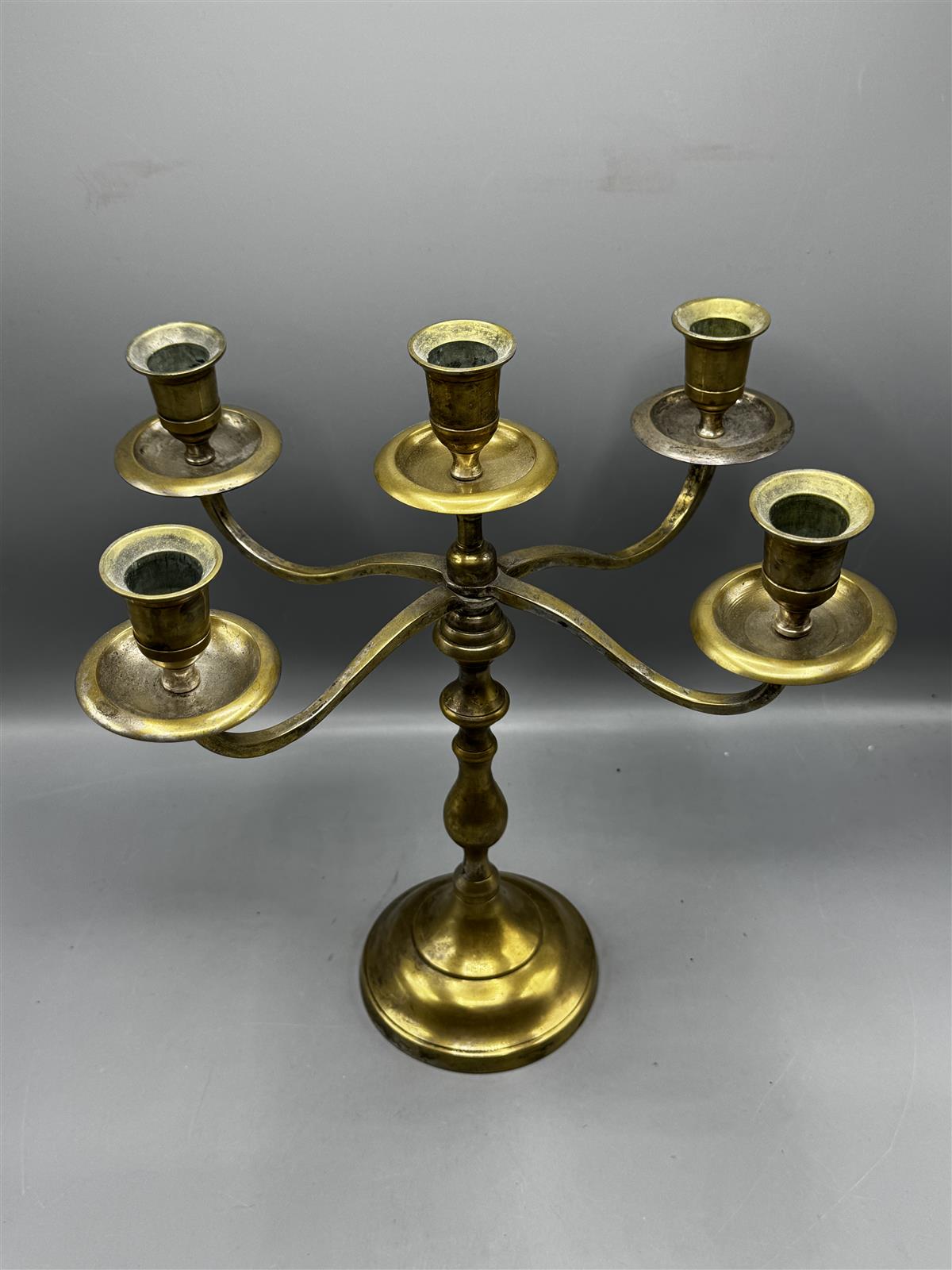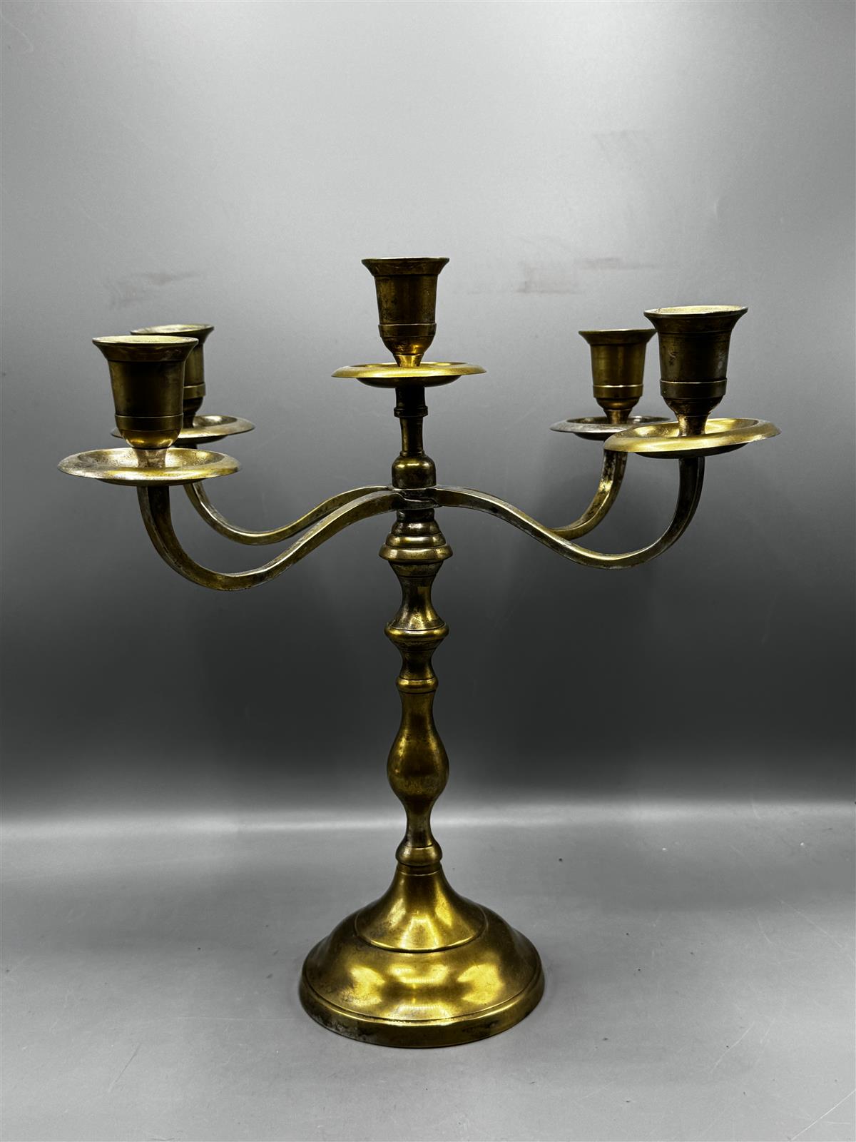 Kynttilänjalka, jossa on viisi paikkaa kynttilöille. Valmistettu messingistä, ja siinä on koristeellinen muotoilu.