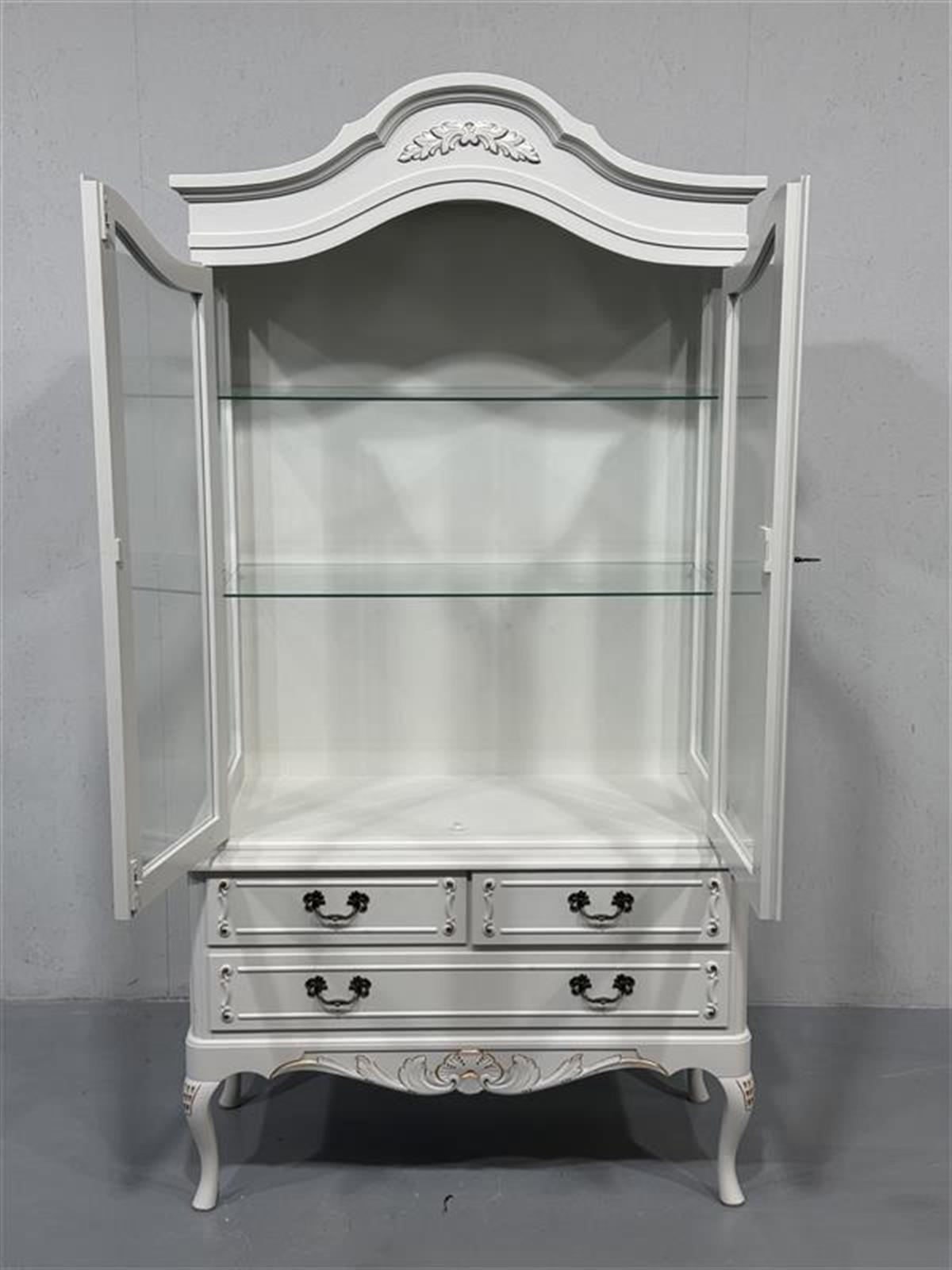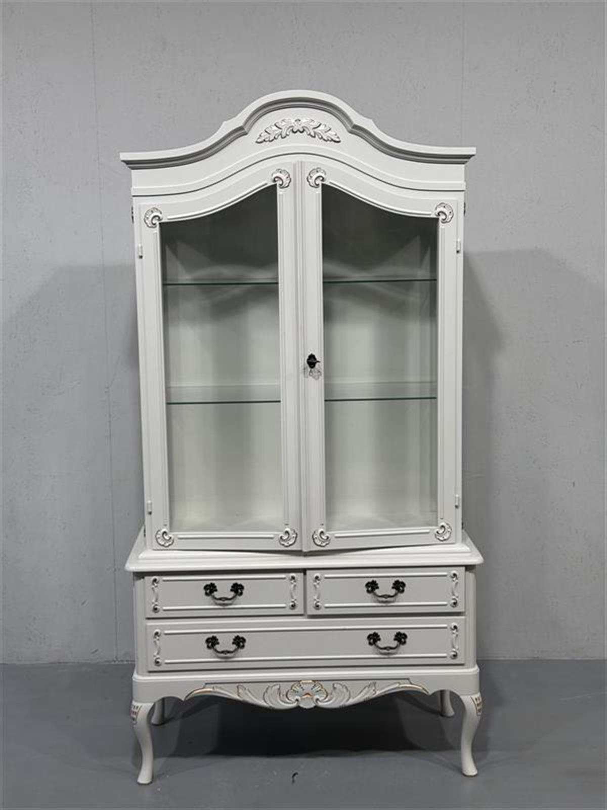 Kaunis ja elegantti valkoinen Talonpoikaisrokokoo vitriinikaappi koristeellisilla yksityiskohdilla. Alaosassa lipastot, sisällä lasitasot. Siistikuntoinen.