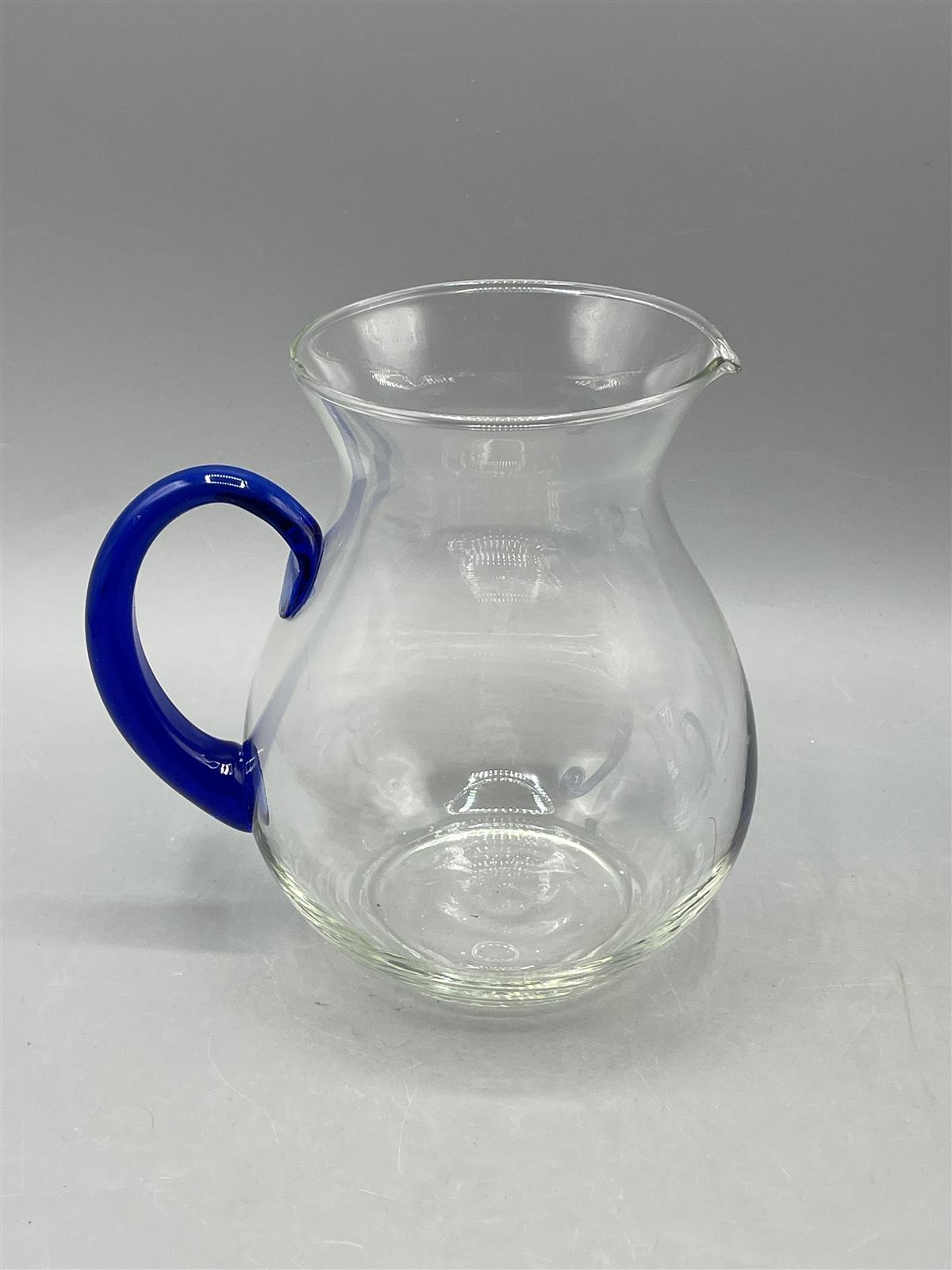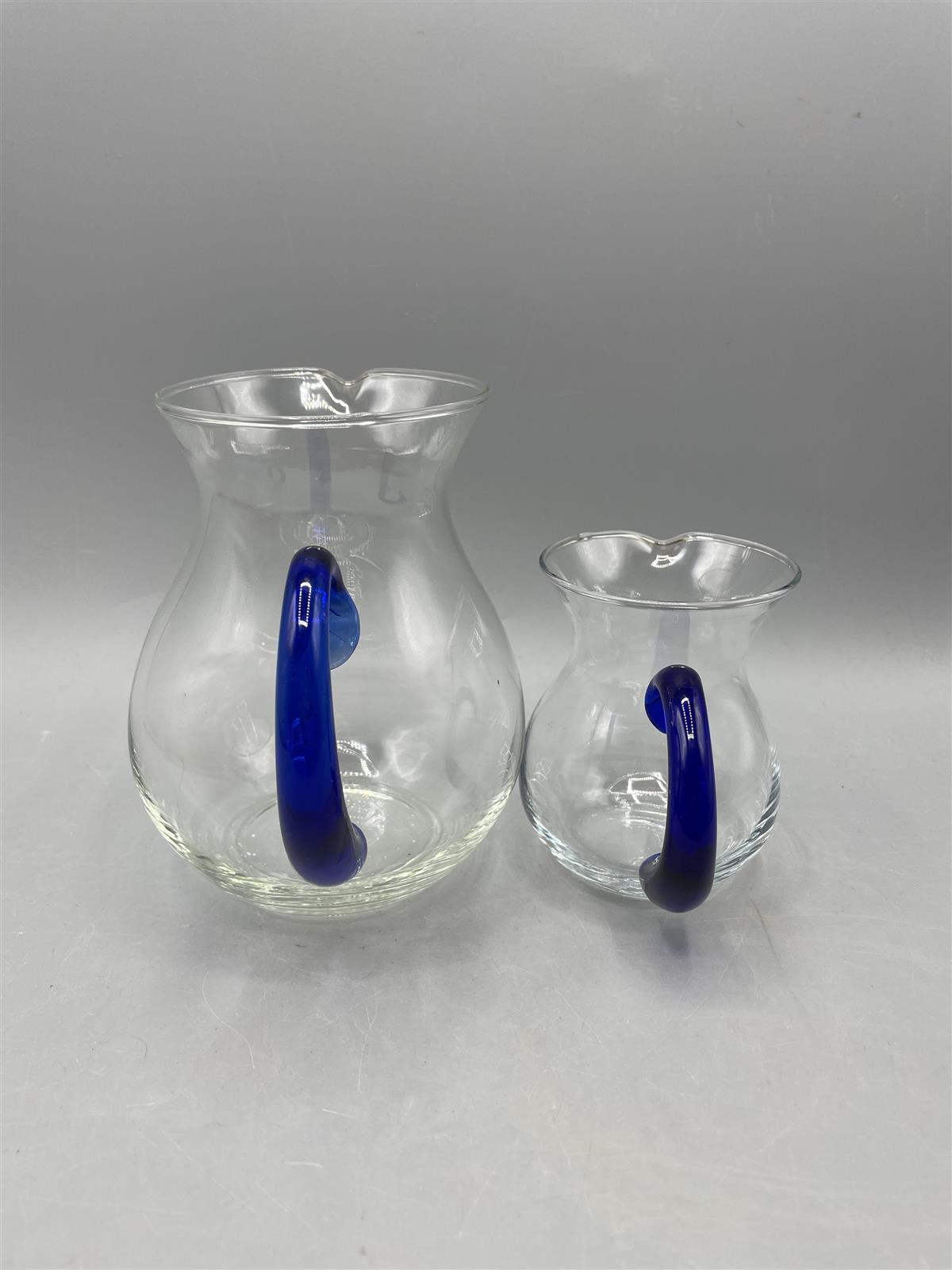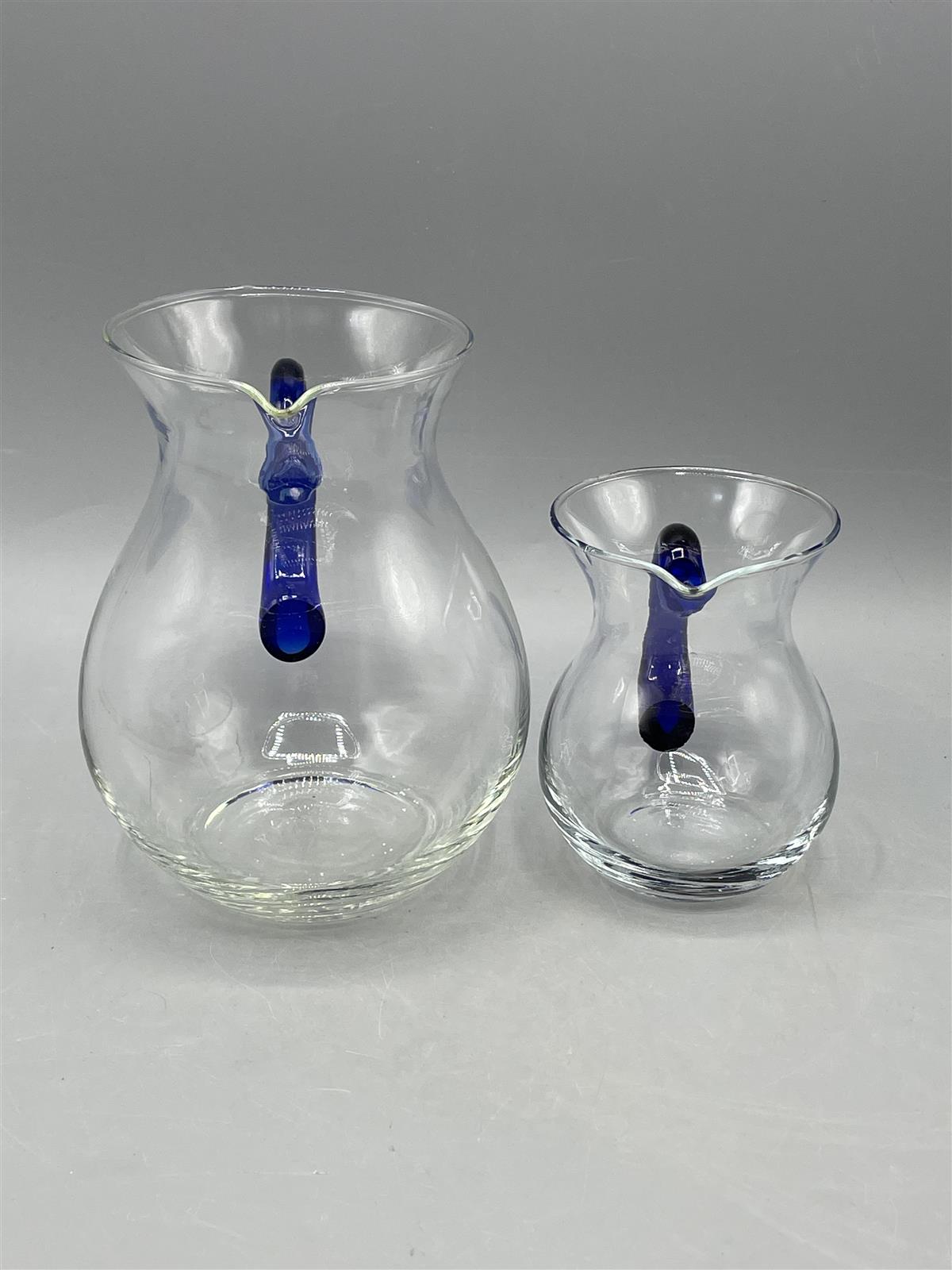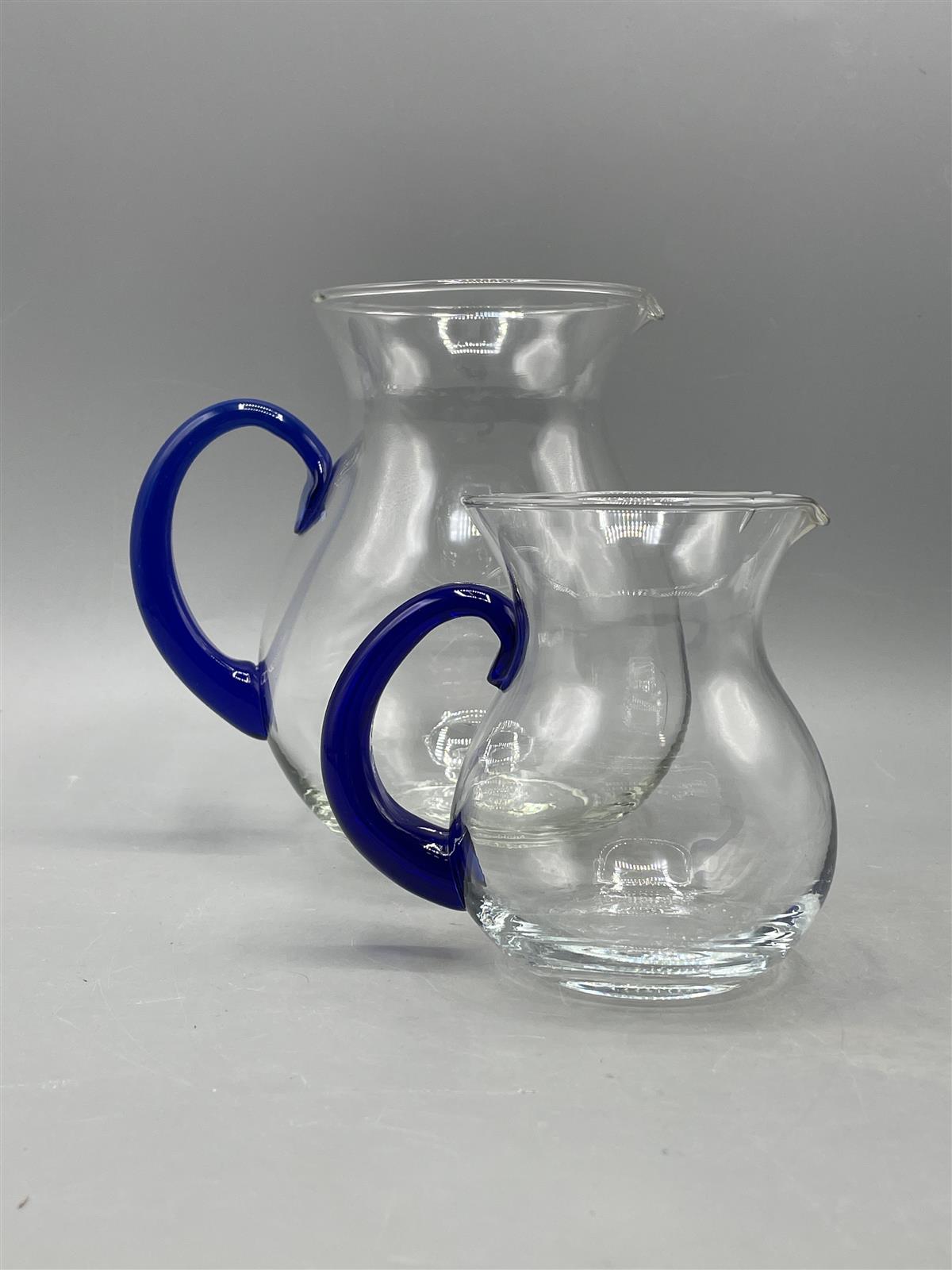 Kaksi lasikannua, joissa on kirkas runko ja sininen kahva.