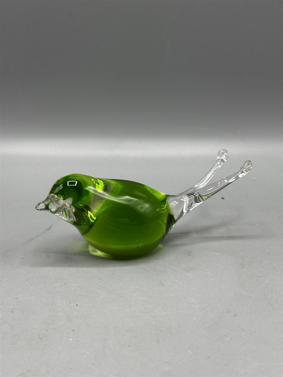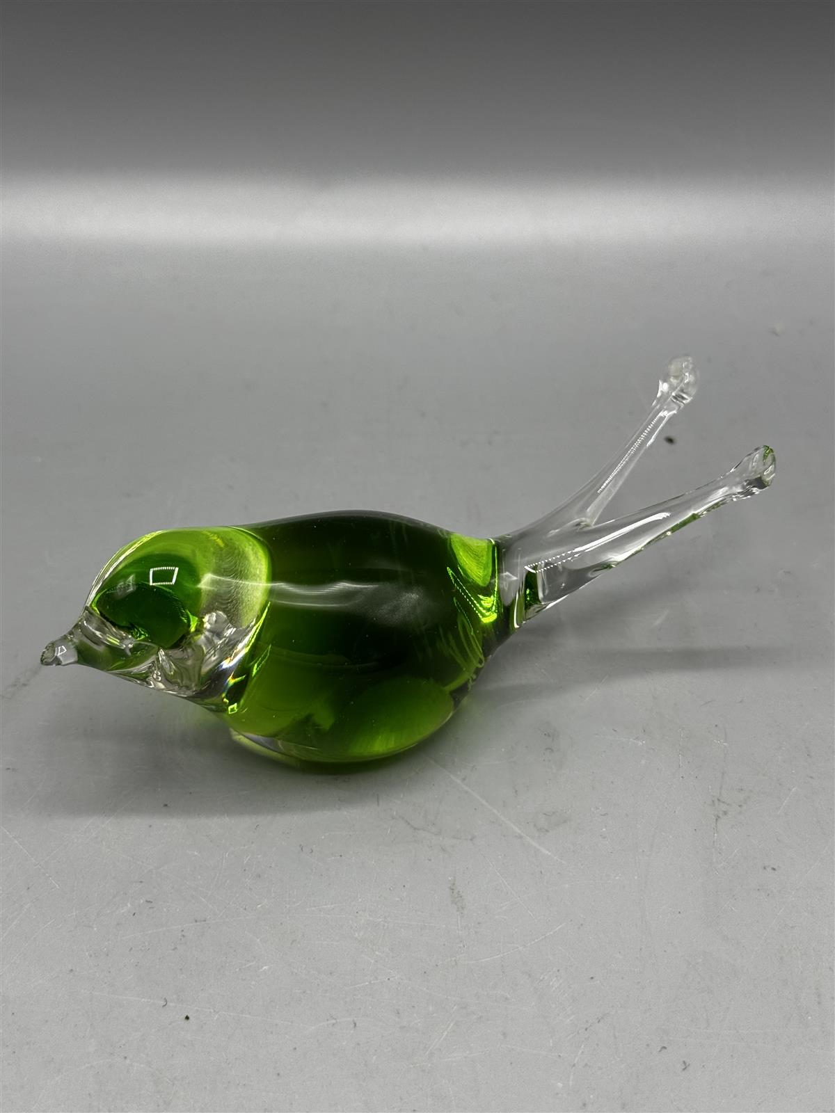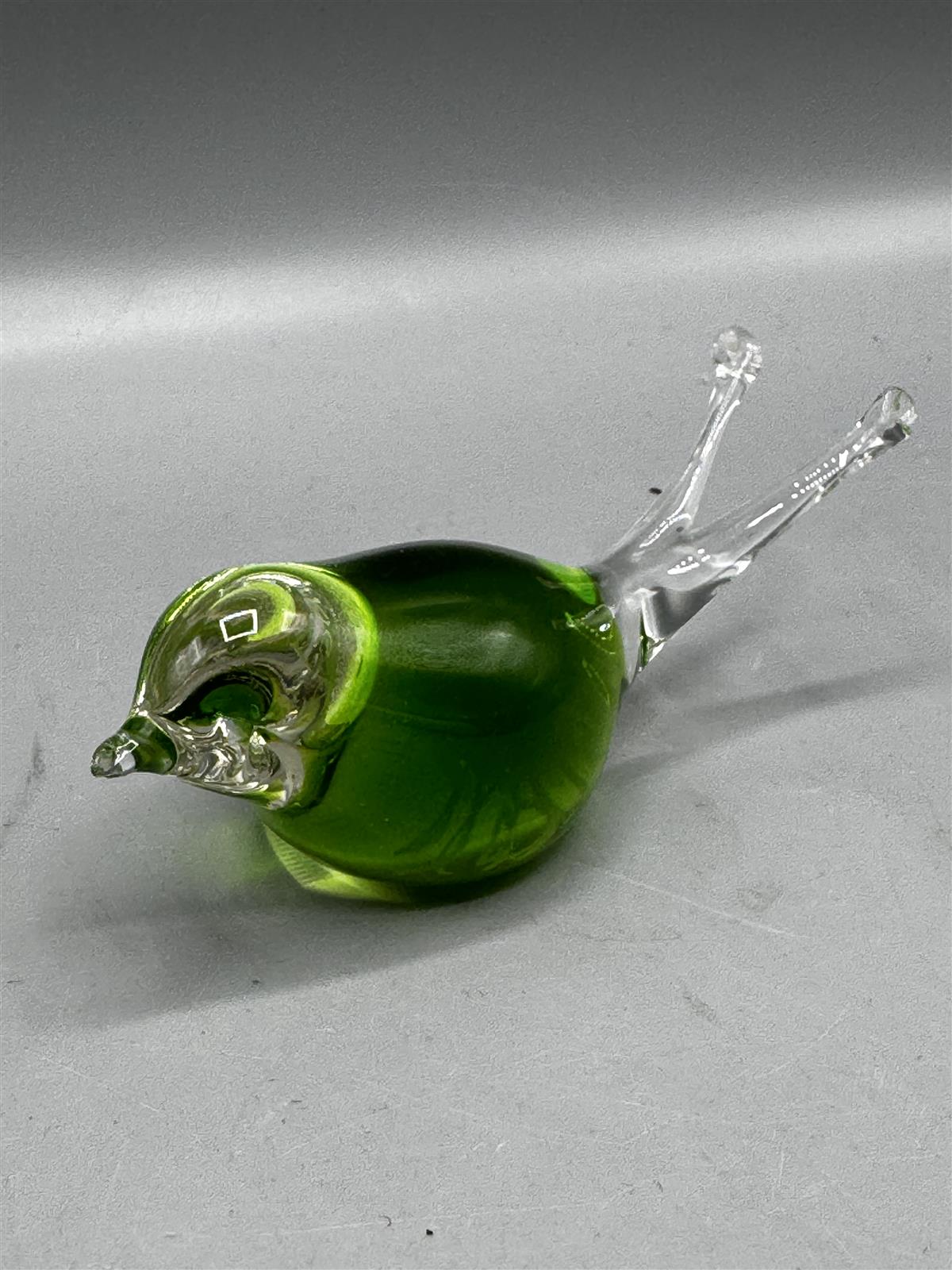 Vihreä lasilintu, jossa on kirkas pyrstö. Oletettavasti Humppilan lasi ja Pertti Santalahti käsialaa. Lintu on valmistettu lasista ja siinä on kaiverrettu signeeraus pohjassa.