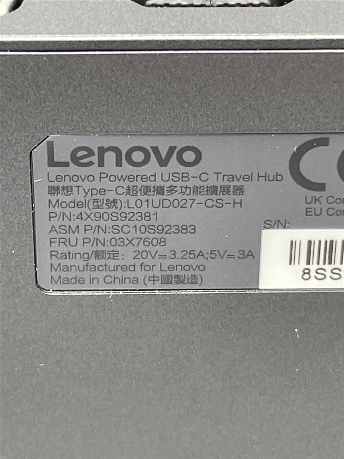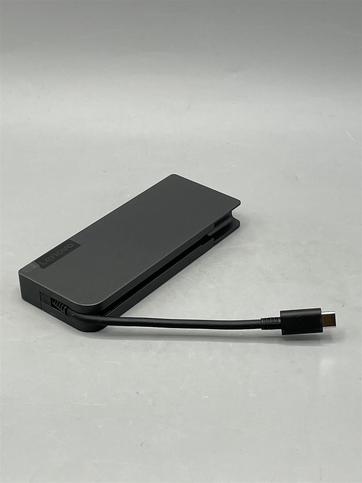 Lenovo USB-C Travel Hub, jossa on useita liitäntöjä, kuten HDMI, VGA ja USB. Kompakti ja kannettava muotoilu tekee siitä kätevän matkakäyttöön.