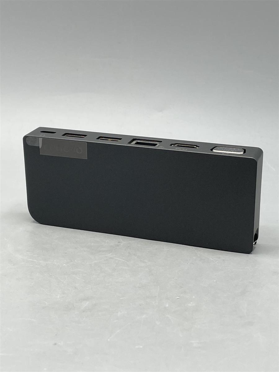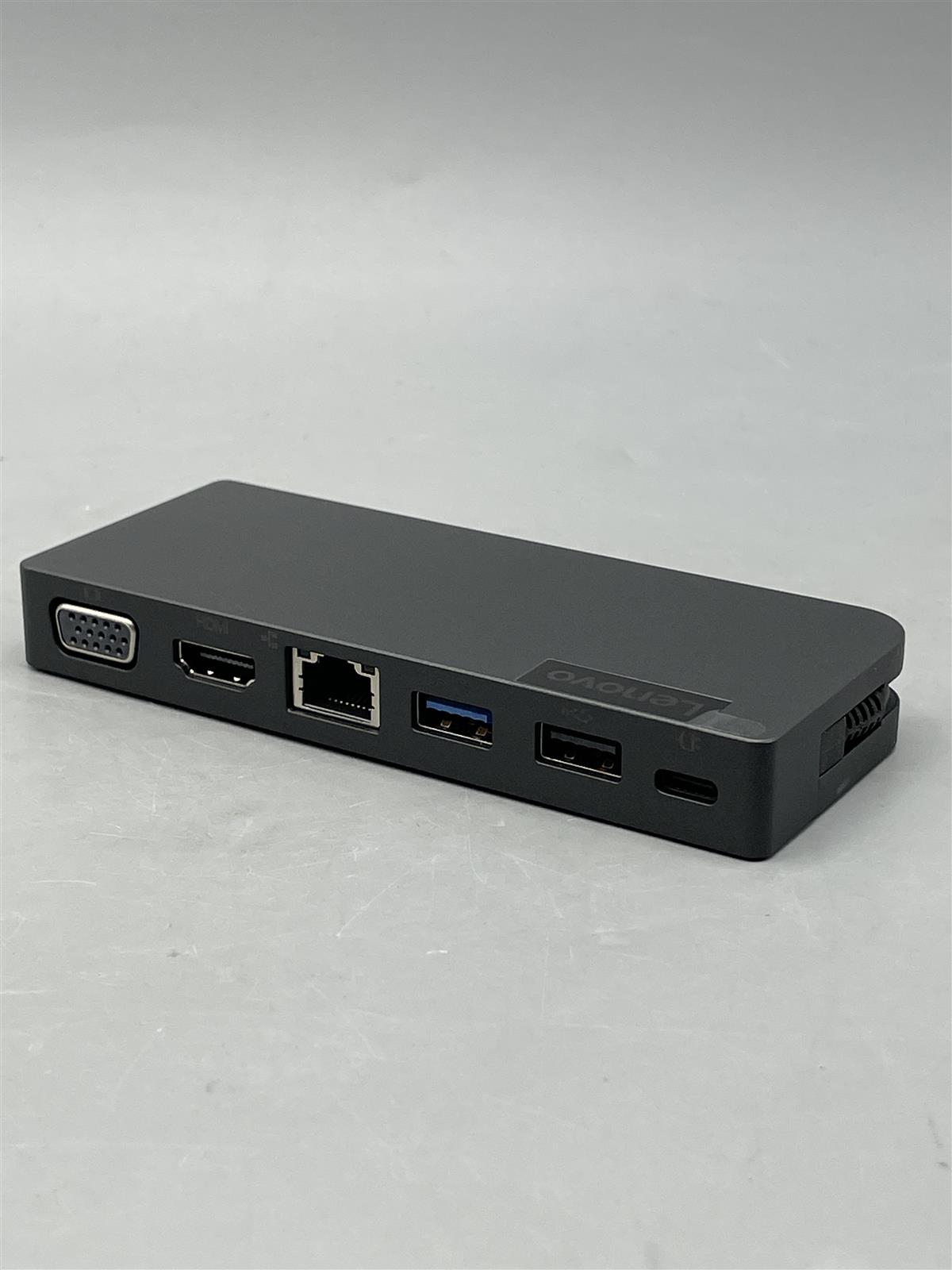 Lenovo USB-C Travel Hub, jossa on useita liitäntöjä, kuten HDMI, VGA ja USB. Kompakti ja kannettava muotoilu tekee siitä kätevän matkakäyttöön.