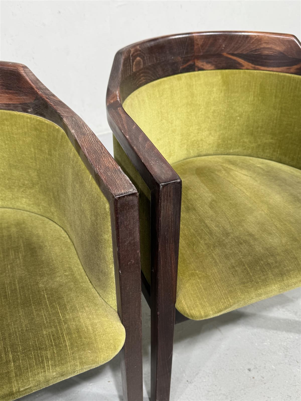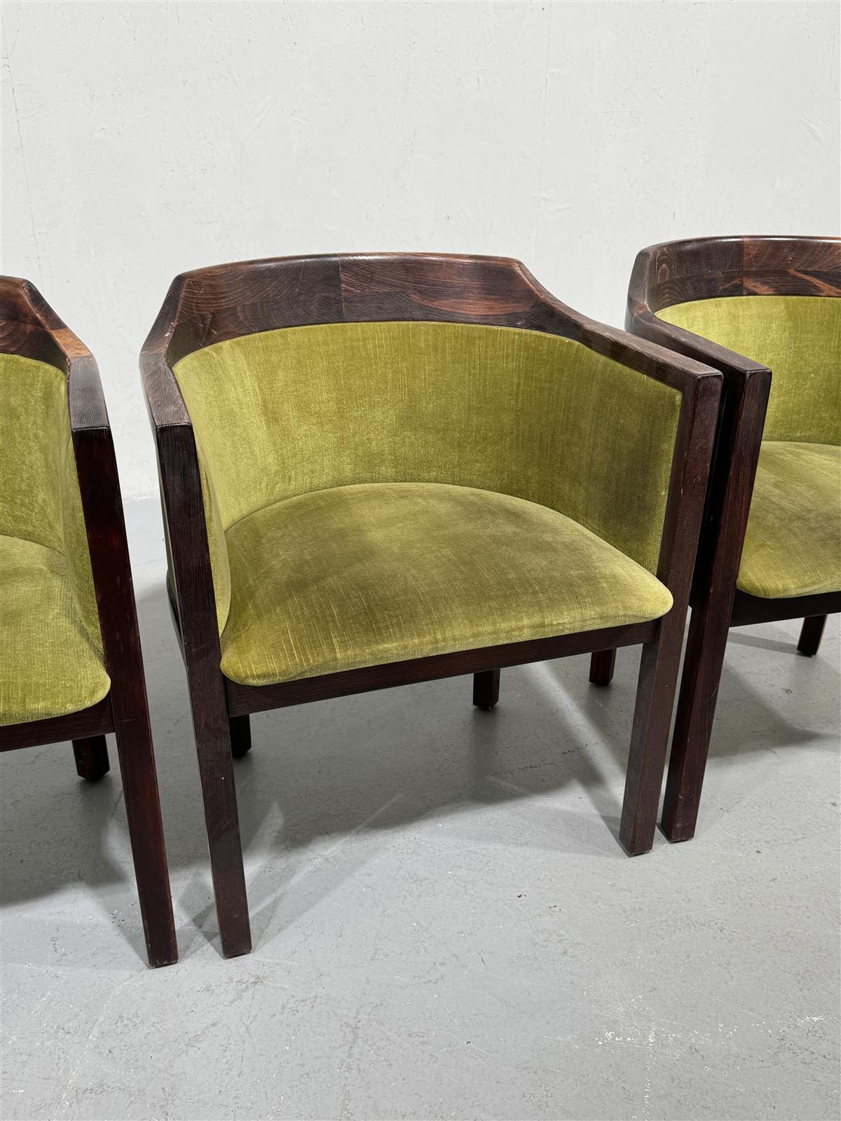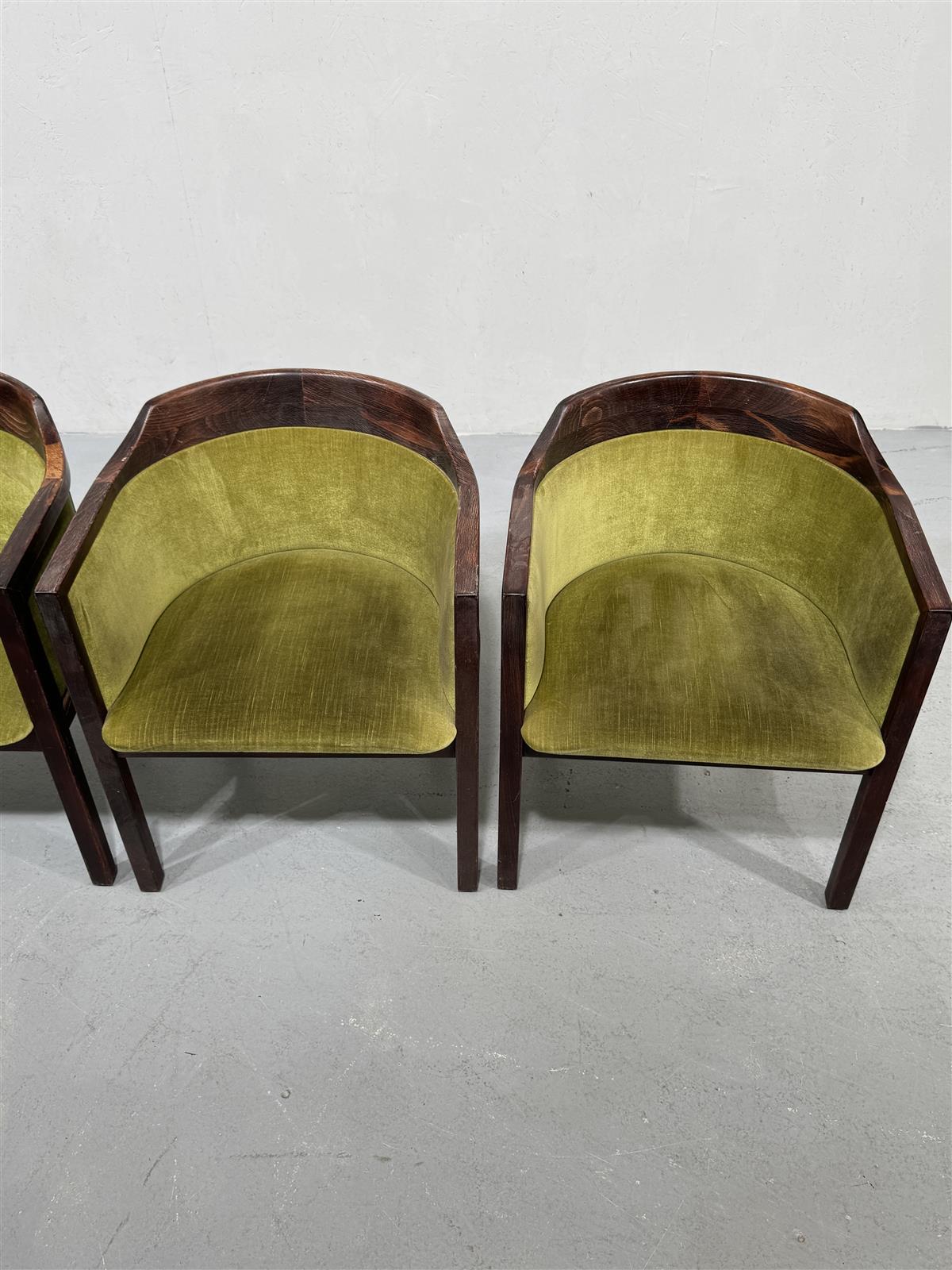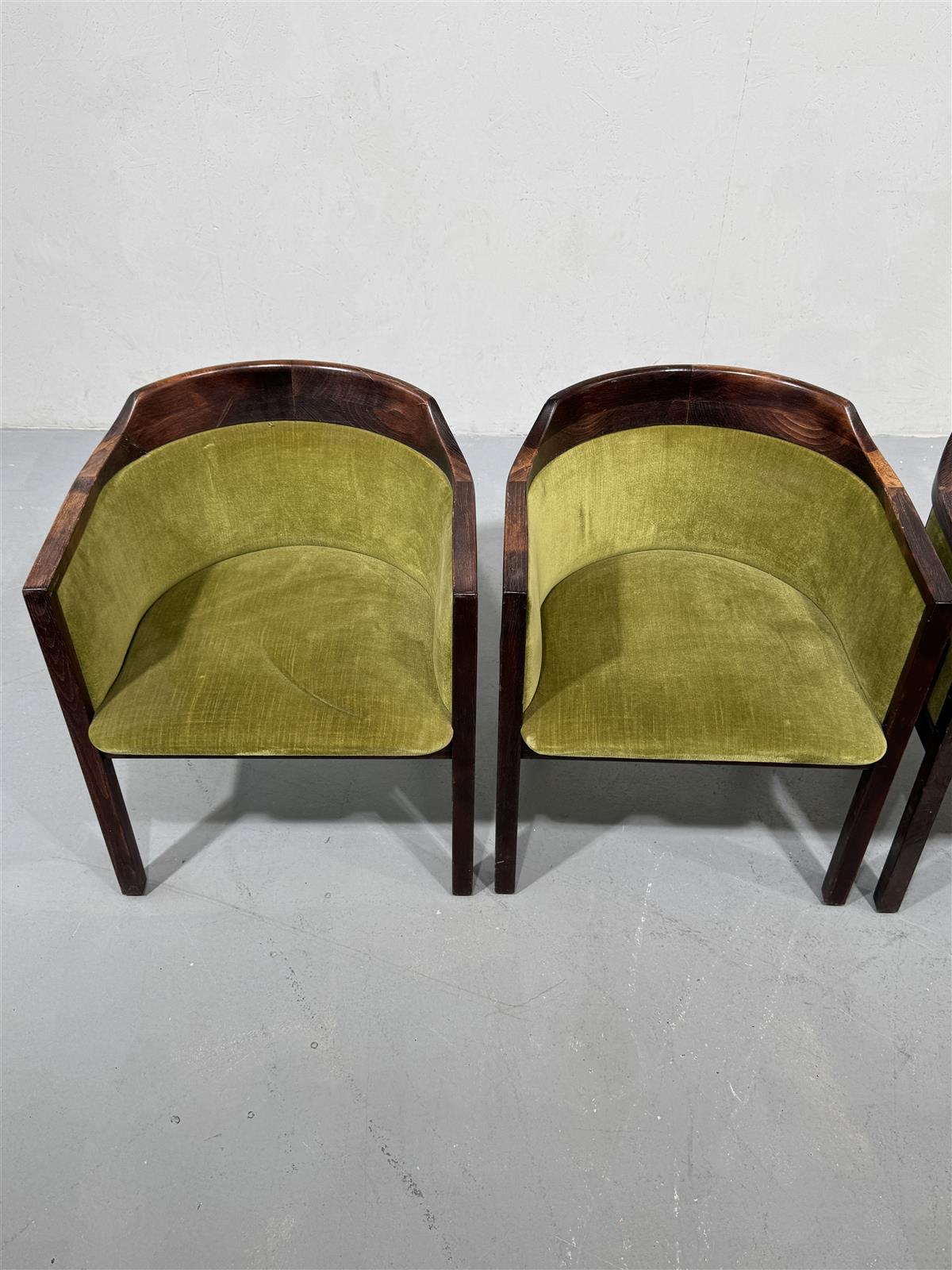 Tyylikäs Lepo-Finn valmistama retro nojatuoli, valmistettu Suomessa. Neljä kappaletta, joissa vihreä samettiverhoilu ja tummat puurunkoiset käsinojat. Sopii hyvin olohuoneeseen tai työhuoneeseen.