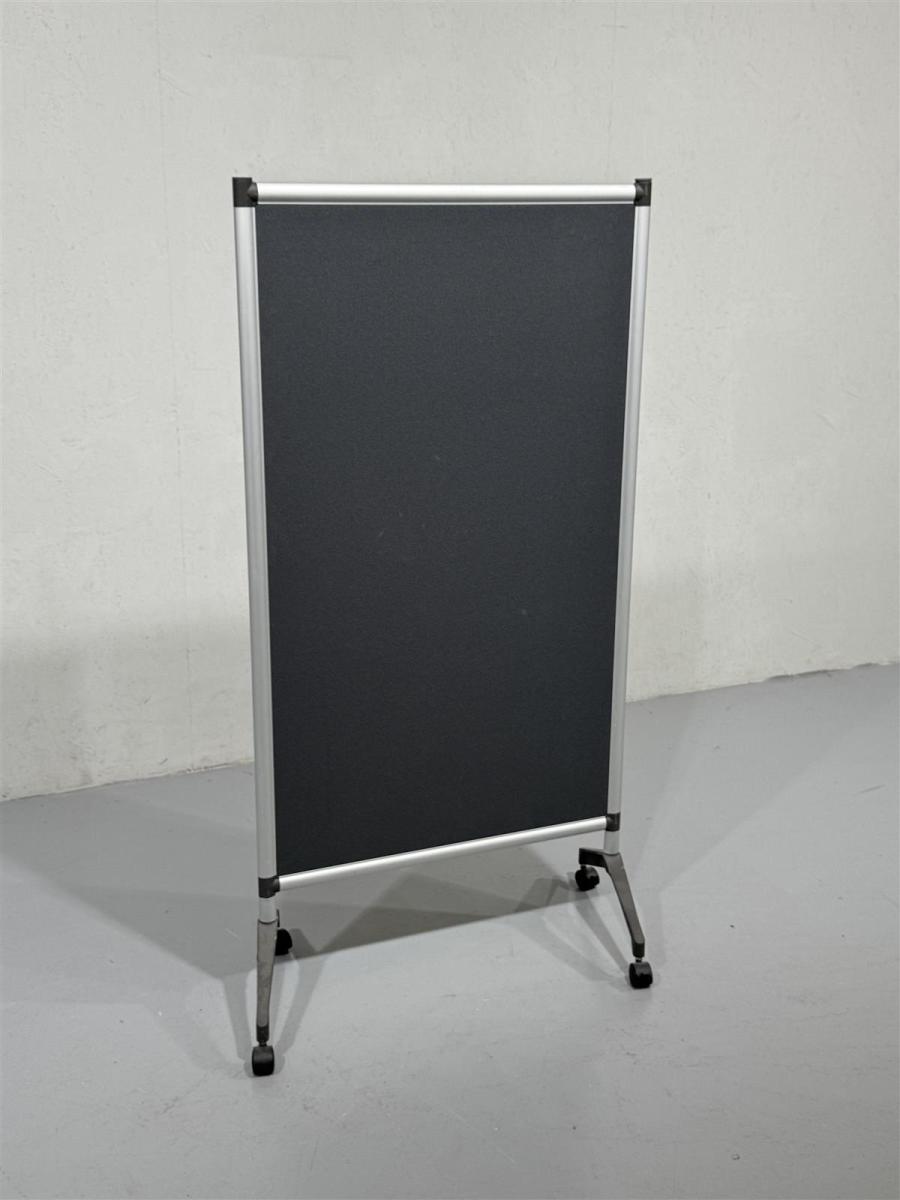 Käytännöllinen liikuteltava ilmoitustaulu, jossa on tummanharmaa kangaspinta, johon voi pinneillä kiinnitellä lappuja ja alumiinikehys. Taulussa on neljä pyörää, jotka helpottavat siirtämistä paikasta toiseen. Pyörät voi lukita, jotta taulu pysyy tukevasti paikallaan käytön aikana.