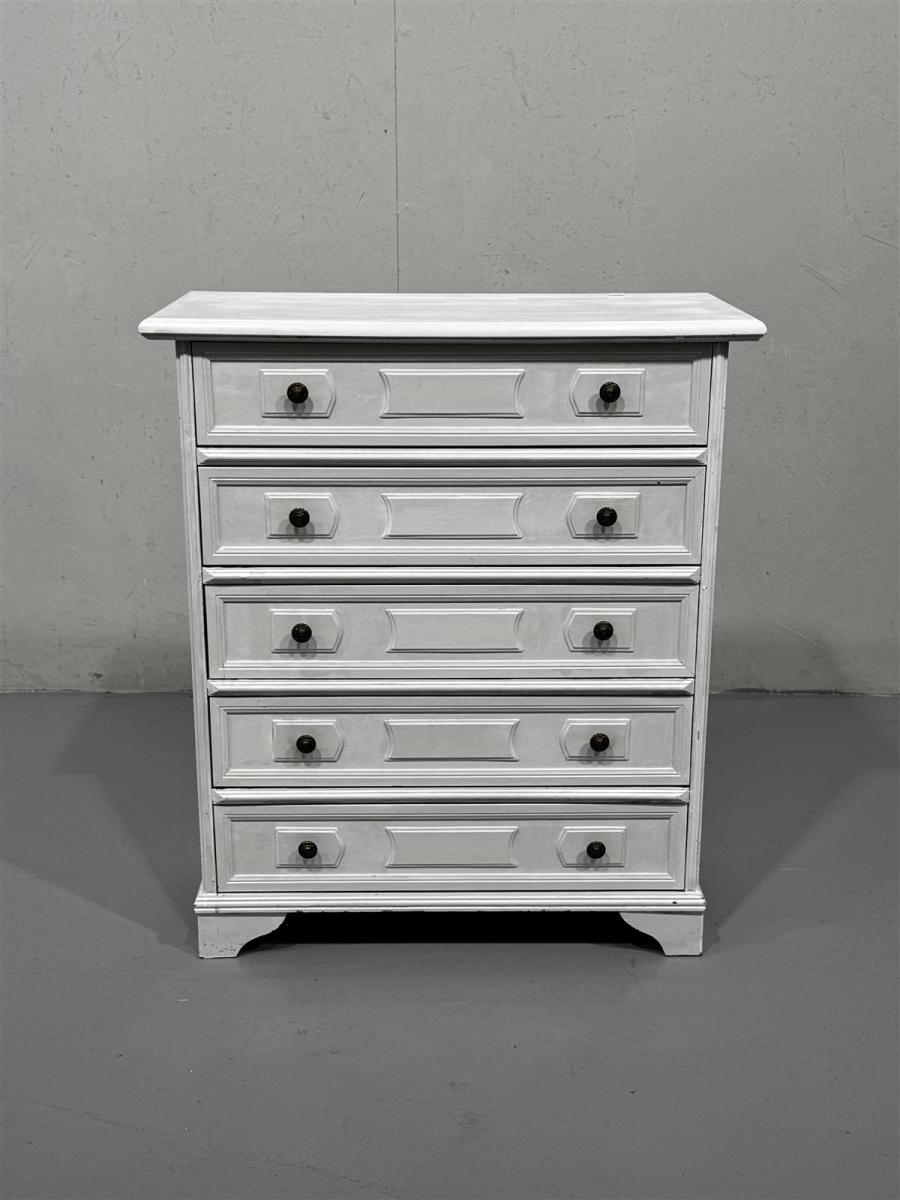 Valkoiseksi maalattu siisti lipasto, jossa on viisi laatikkoa ja tummat vetimet. Lipasto on maalattu valkoiseksi ja siinä on koristeelliset yksityiskohdat.
