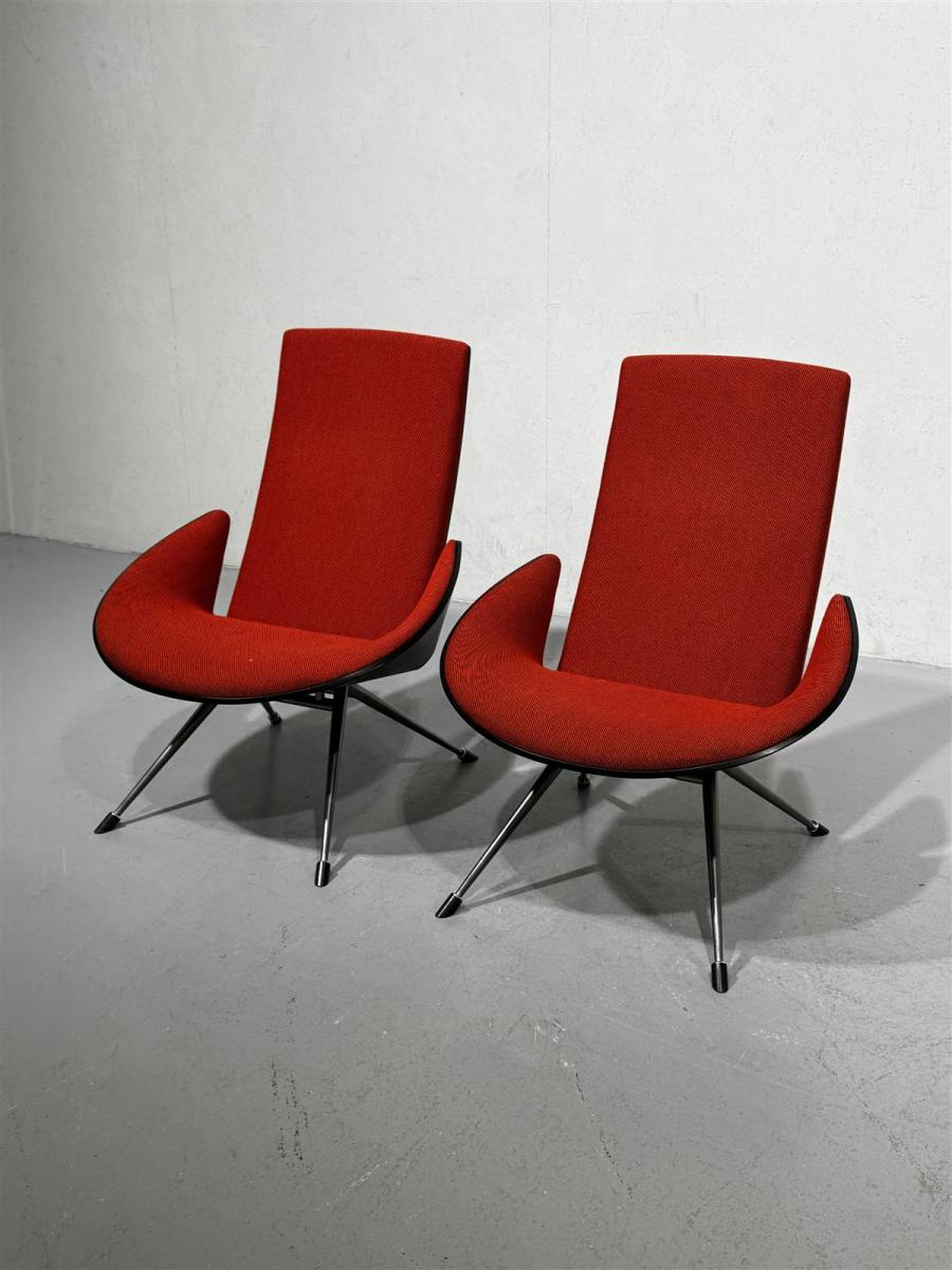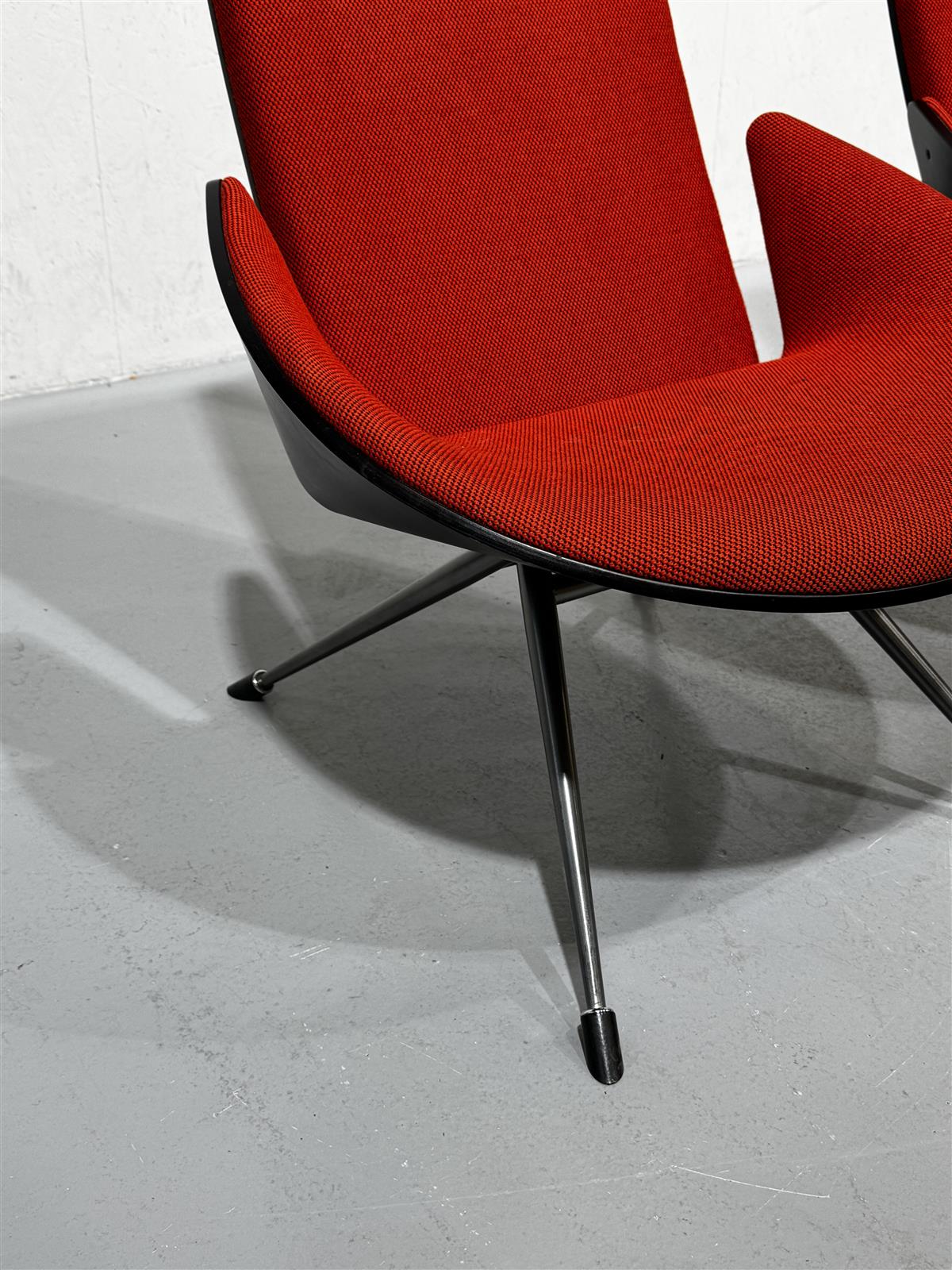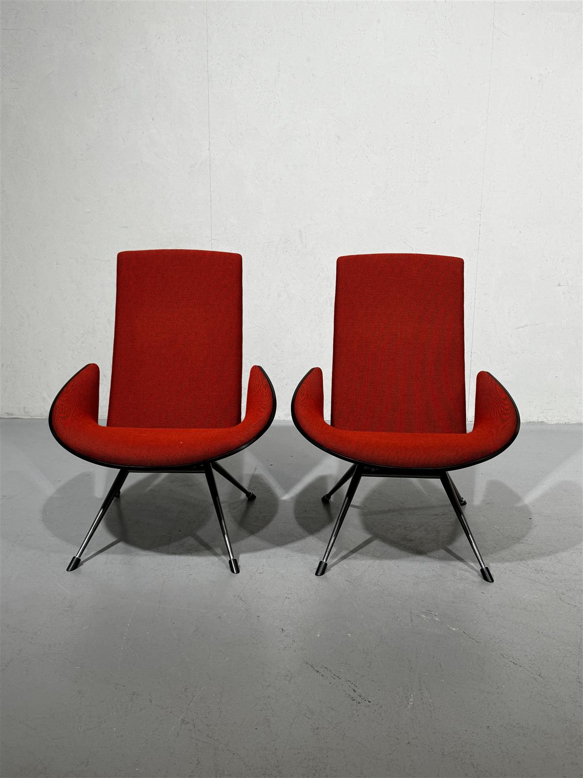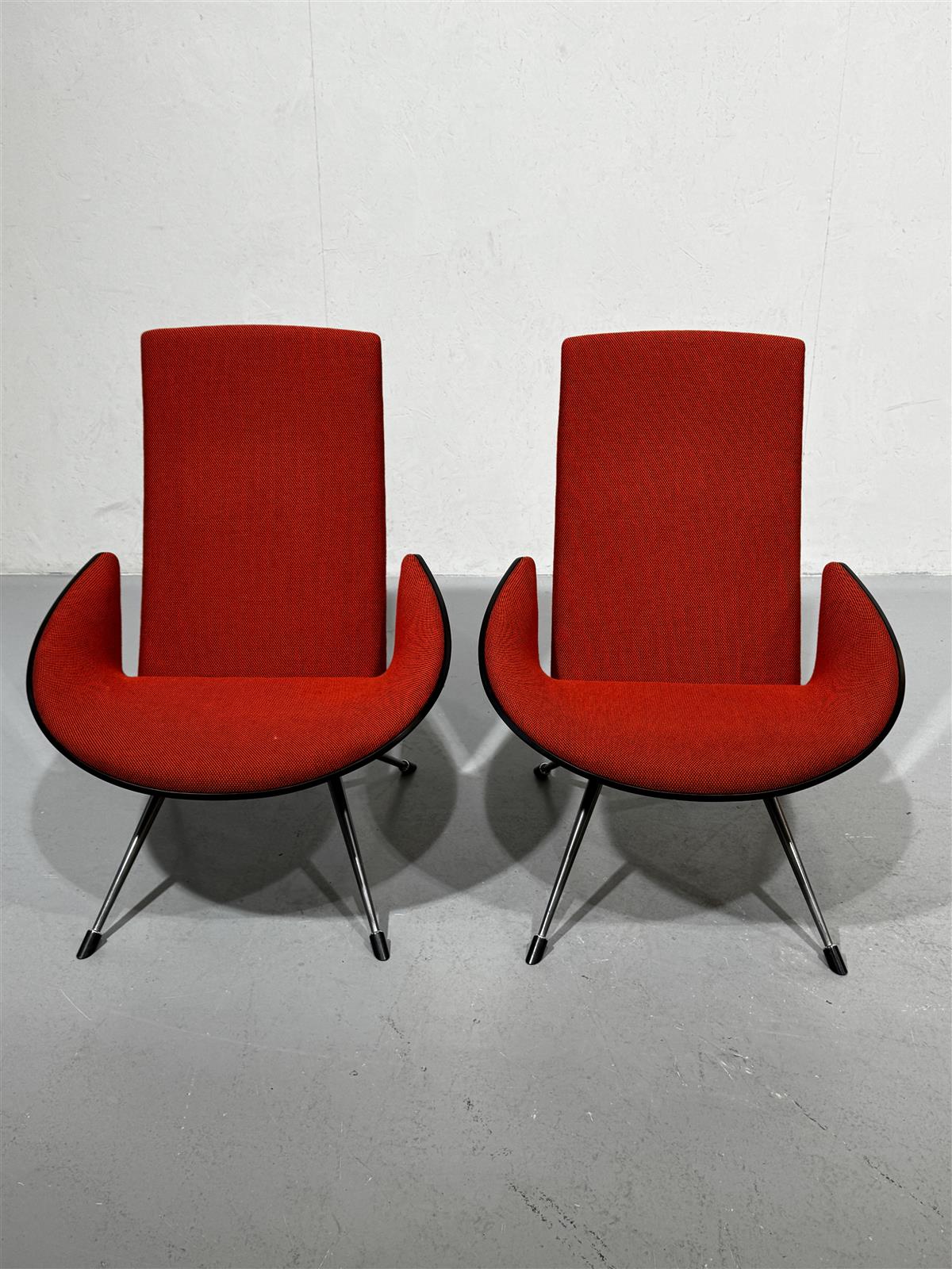 Jouko Järvisalo design Lippi L mallin nojatuolit, joissa on punainen verhoilu ja metallijalat. Istuinosa on muotoiltu mukavuutta ajatellen, ja tuolit seisovat tukevasti neljällä jalalla. Kunto on hyvä.