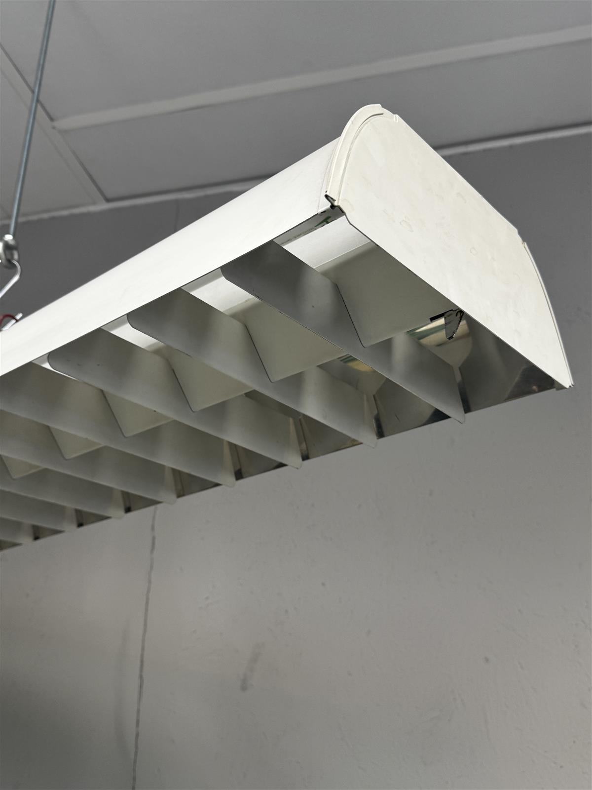 Orno KI a -822-merkkinen riippuvalaisin design Lisa Johansson-Pape, jossa on valkoinen runko ja ritilä. Valaisimen leveys on 126 cm. Kaksi putkilamppua.