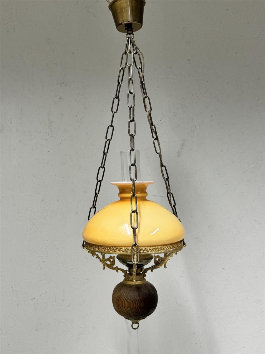 Kaunis messinkirunkoinen öljylamppu – tyylinen kattovalaisin. Valmistaja Lival, arviolta 60/70 lukua. Keltainen lasikupu. Alla puukoriste.